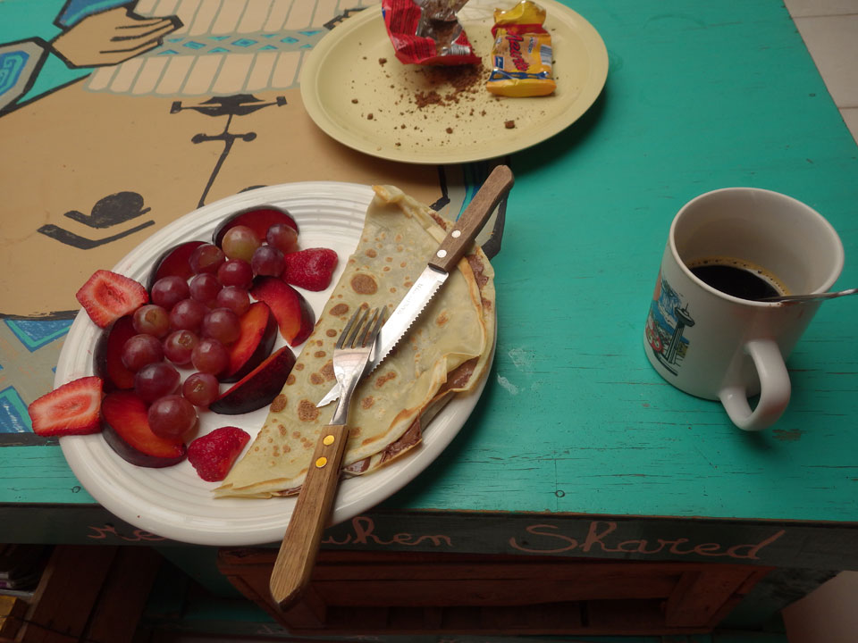 Nach der Dusche war es nach 10 – 10:10. Das Frühstück sei vorbei – also keine Pancakes mit Früchten? Nicht so gut. Ich machte Frühstück mit alten Keksen. Der Freund des Hostelmädels sah mich und bot dann doch an, mir das Frühstück zu machen. Da sagte ich nicht nein und bestellte auch gleich das Nutella Crepe – 800 gab 1000.