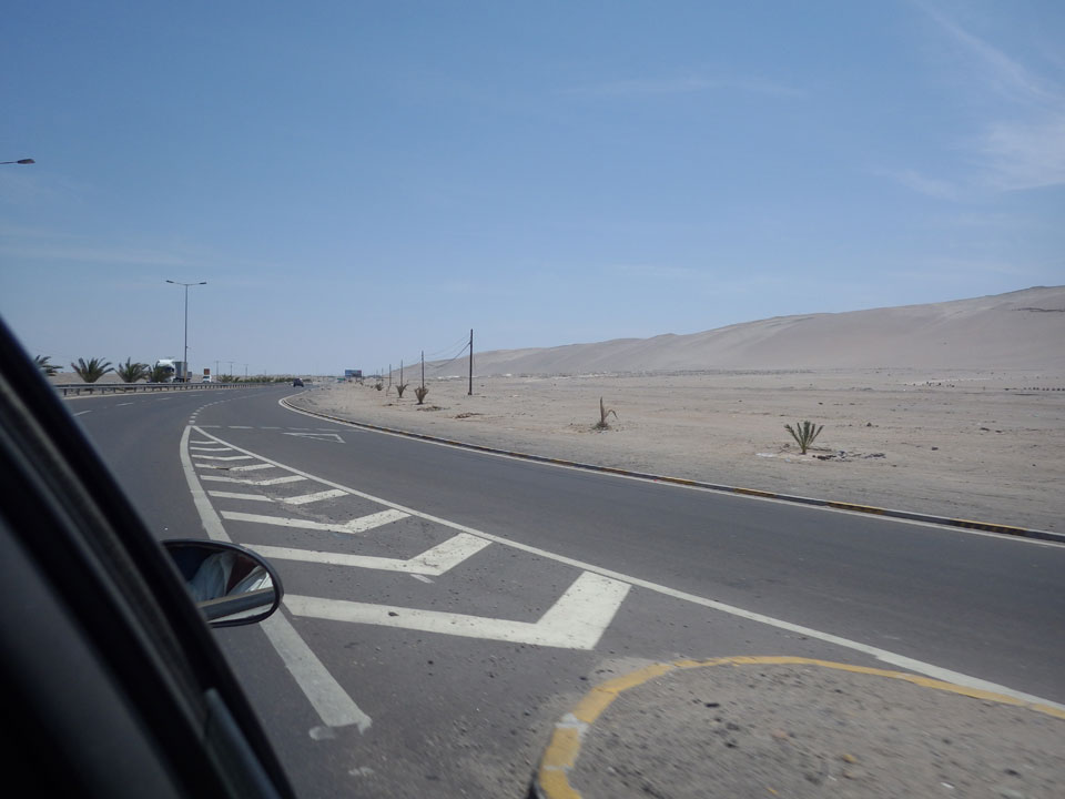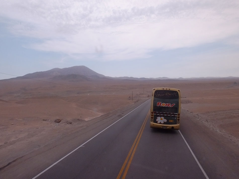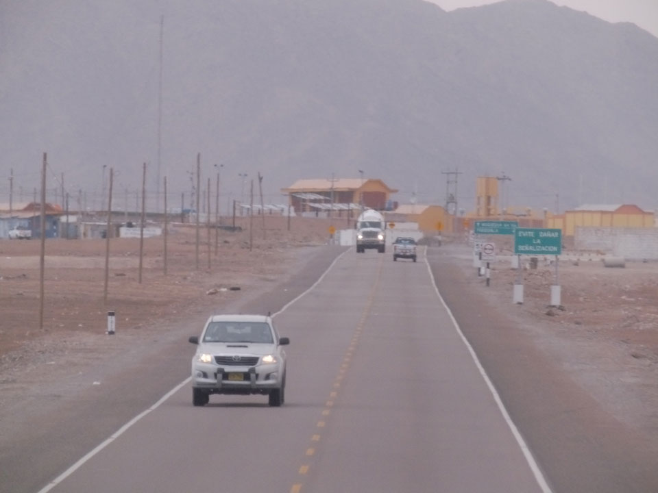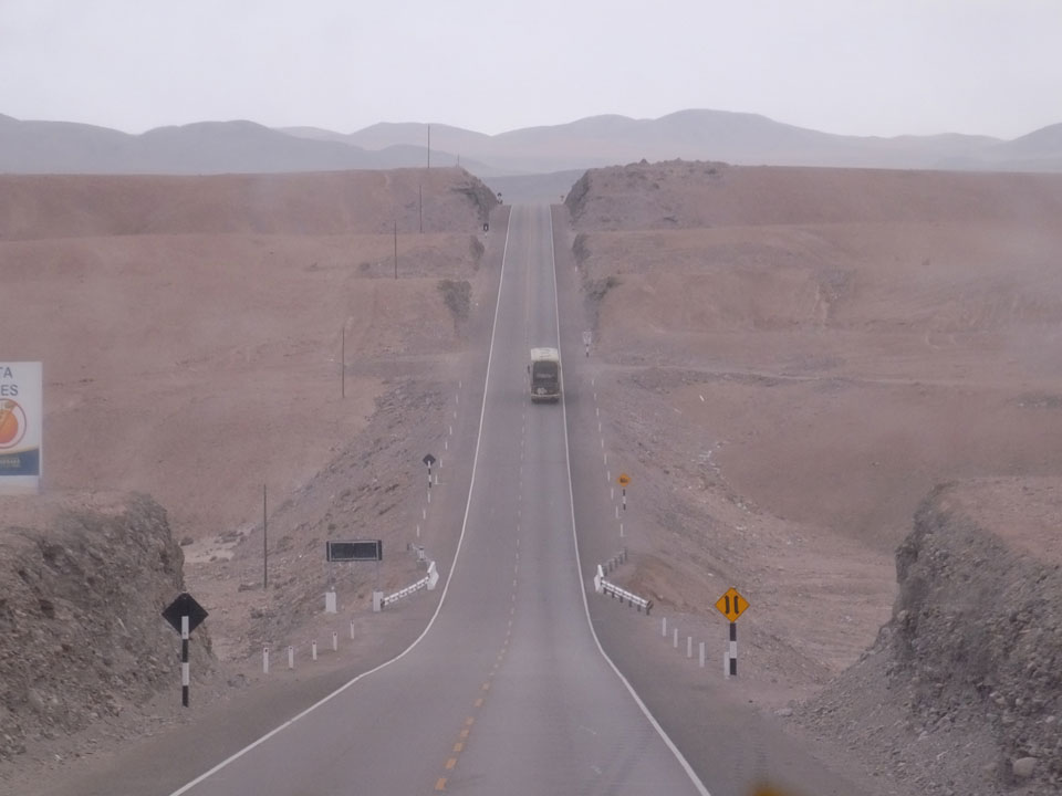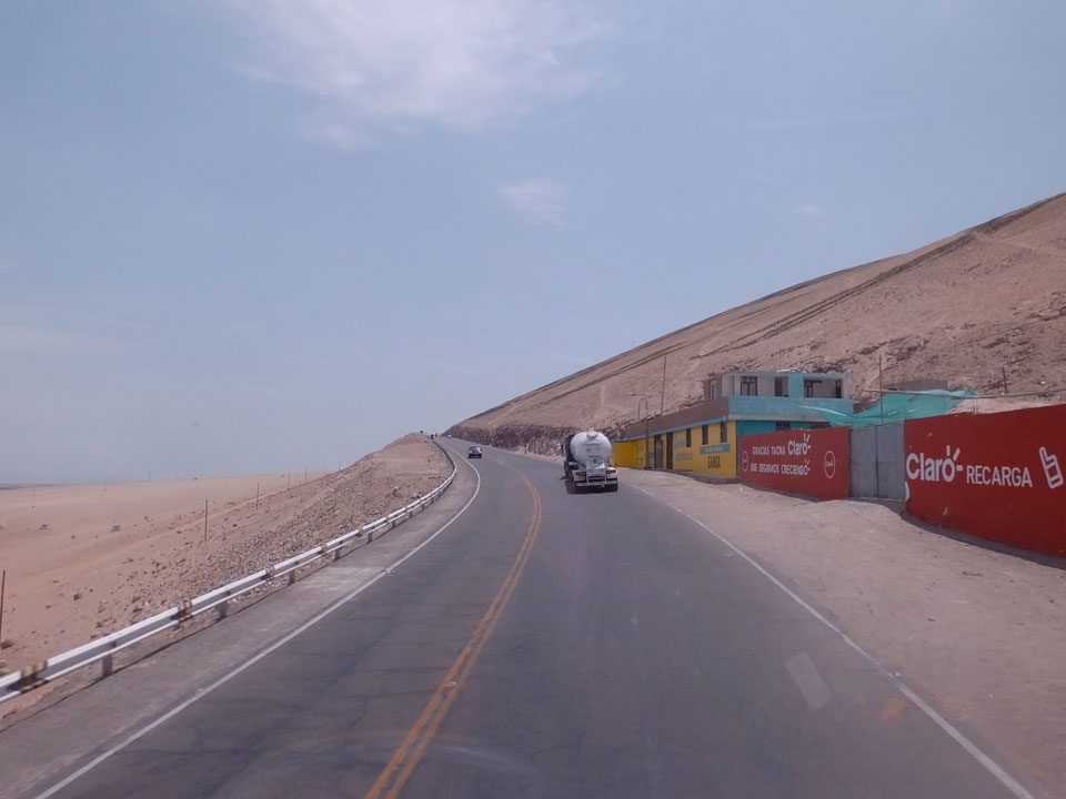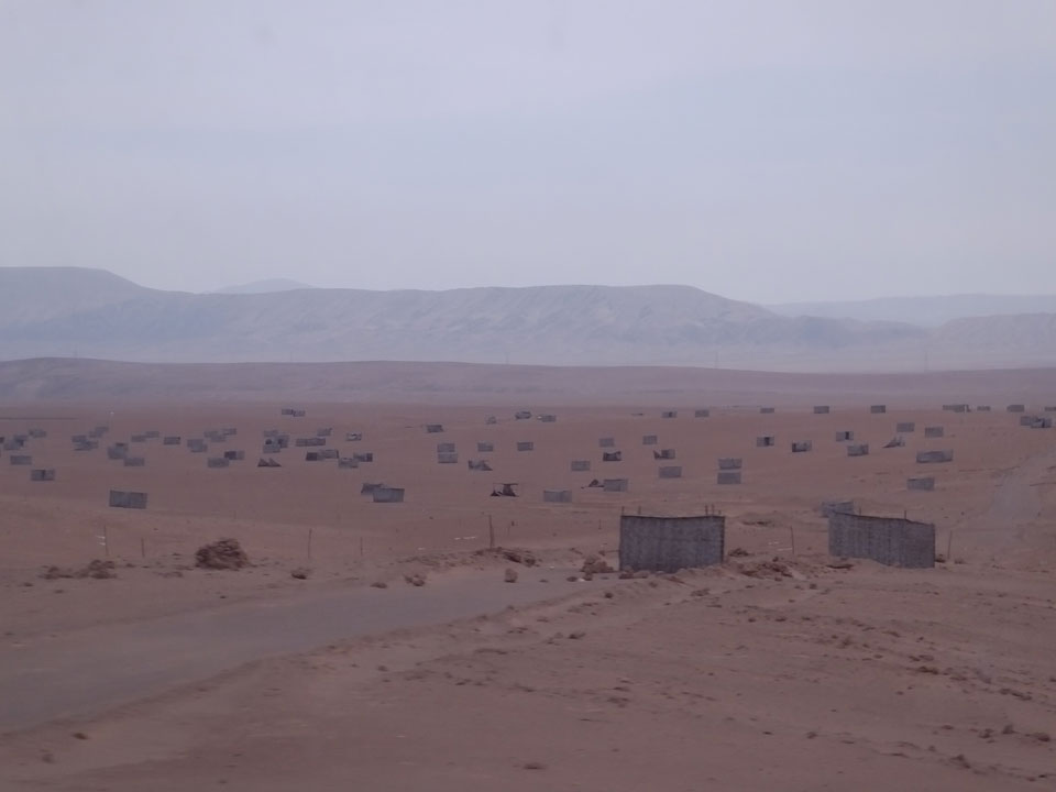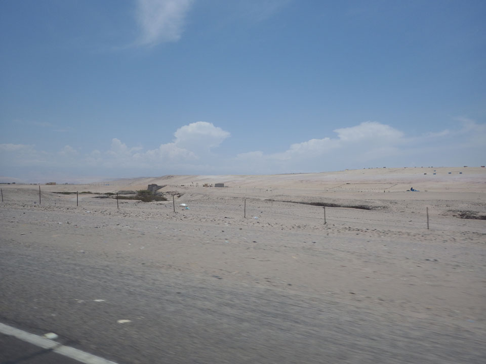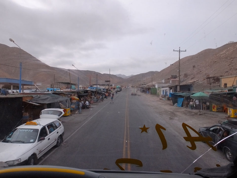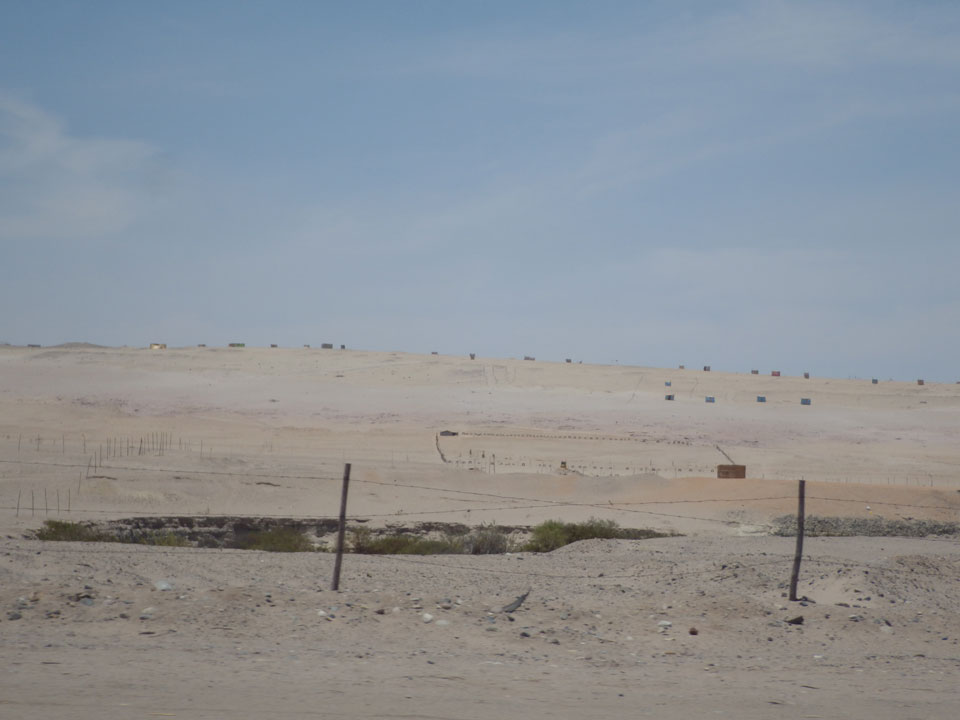 Raus aus Tacna startete schnell die Wüste. Interessant ist, dass viele leere Plätze mit kleinen Hütten besiedelt sind. Die sind zu klein, um als Haus zu gelten und ohne Wasser oder Strom kann dort kaum jemand leben. Ich fragte die Frau, was das sei. Da seien Spekulanten oder eben arme Leute, die das Land in Besitz nehmen – soweit ich das verstand.