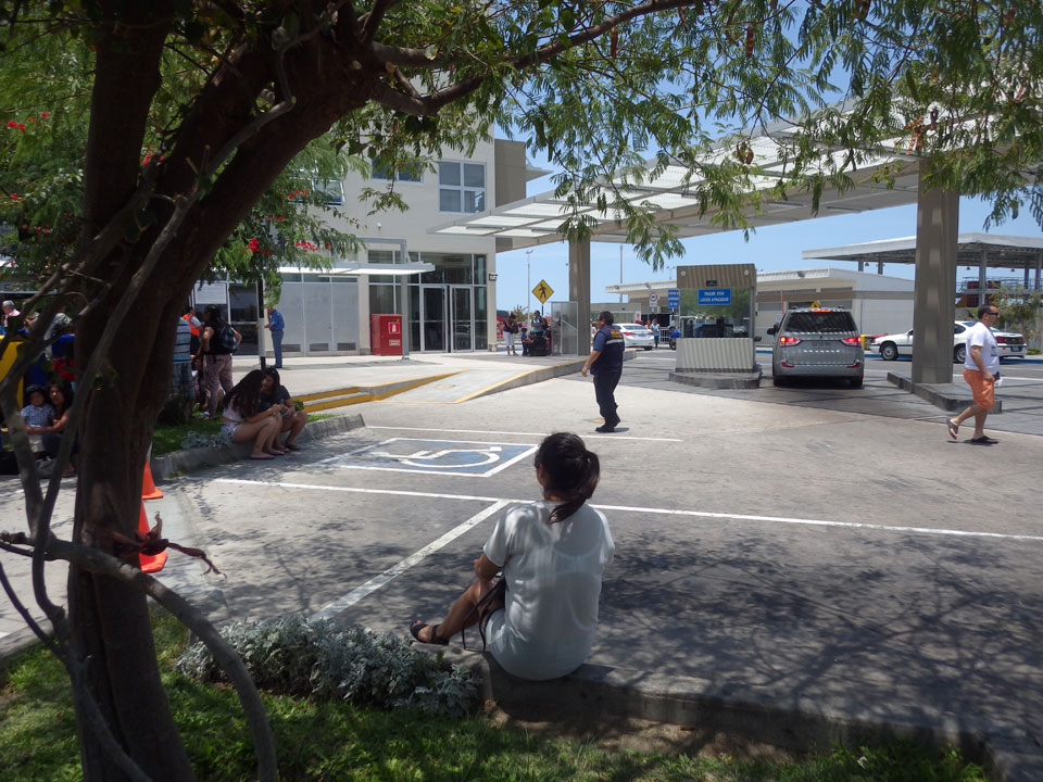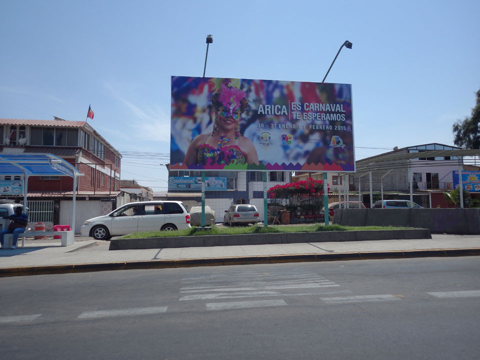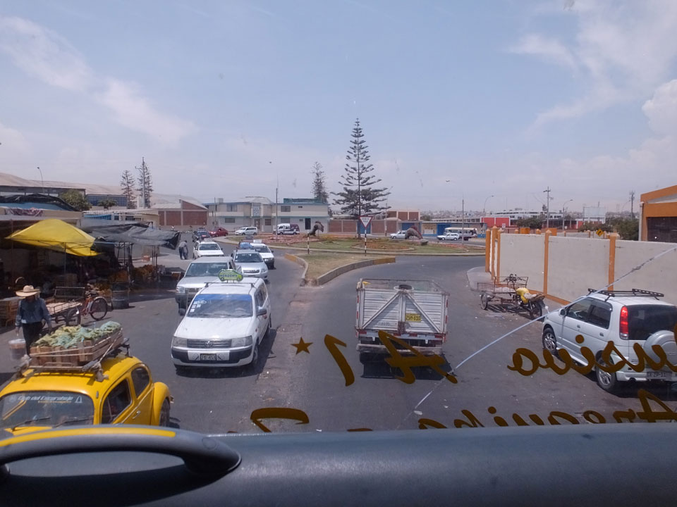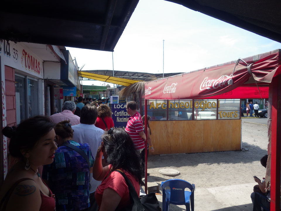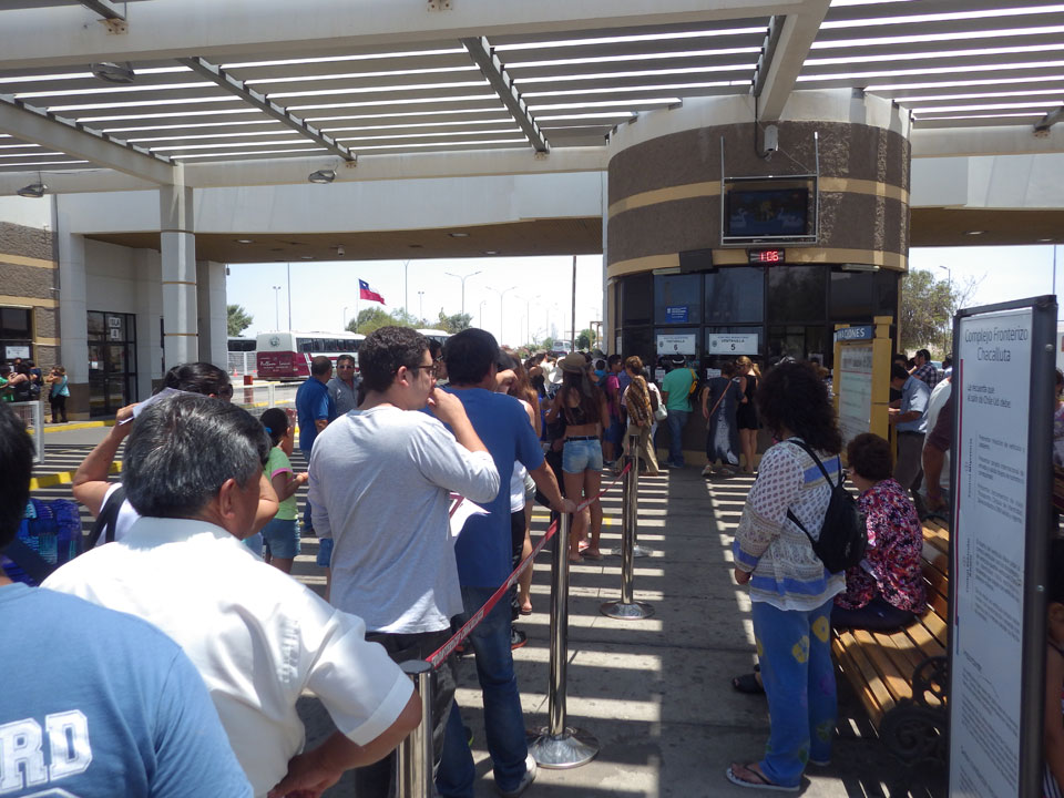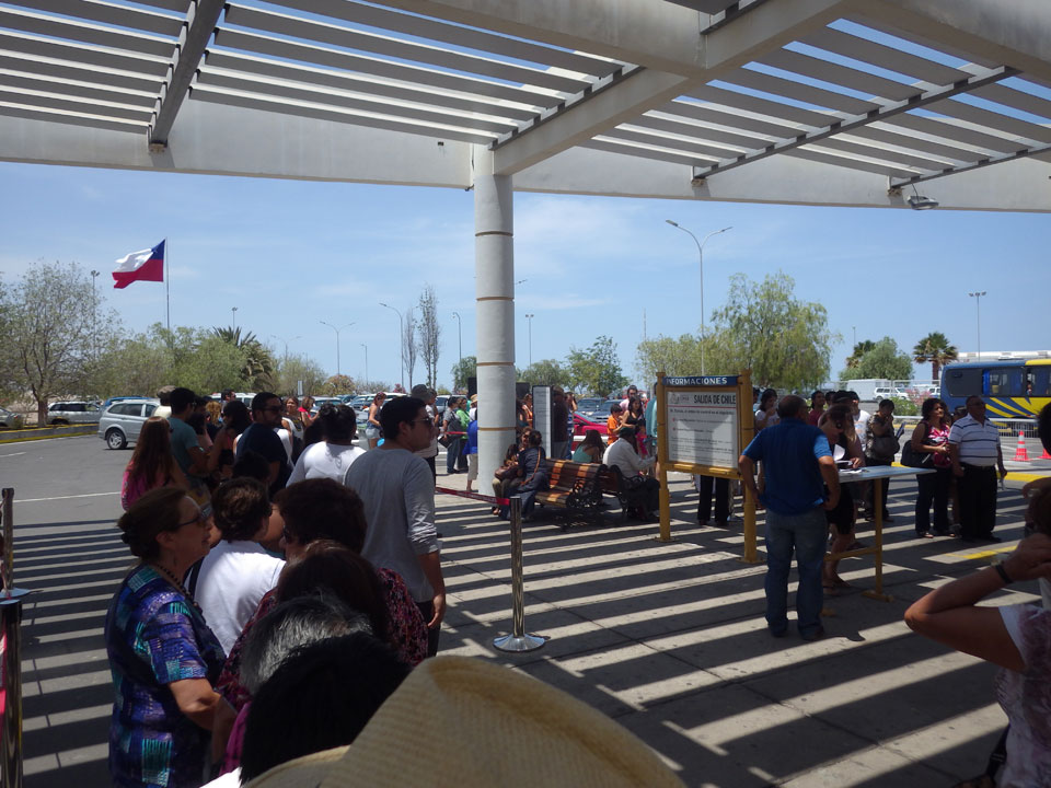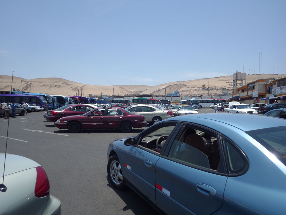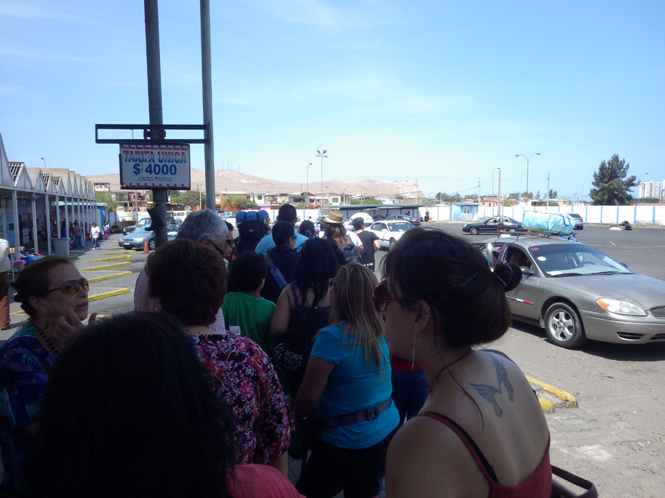 Es wurde immer später. Schließlich 11:30 machte ich los und ging zum Busbahnhof. Der internattionale ist gleich daneben. Ich wollte ein Collectivo – also ein Auto mit bis zu 5 Passagieren nehmen. Das ist schneller als der Bus, und kostet 4000 CLP statt 2500 für den Bus. Doch was war das! Eine lange Schlange vor Collectivos und Bussen. Oh Mann, ich hatte leichten Bammel, ob ich’s heute noch nach Arequipa schaffe.