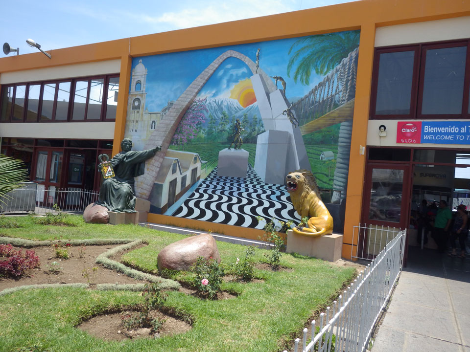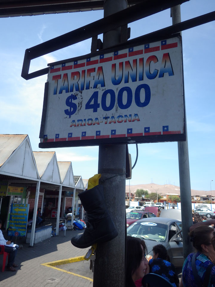 Der Taxifahrer war schnell unterwegs. An der Grenze lotste er uns auch schneller durch, sodass wir kaum anstanden. Mit den 2 Stunden Zeitunterschied waren wir um 12:00 in Tacna – in ca. 1 1/2h also nur. Ich ging zur Busstation, wollte das Ticket kaufen. Die Busfirma Flores sah OK aus. Schnell tauschte ich ARS und CLP für etwas Taschengeld. Das Ticket in der Dorado Klasse kostete teurere 38 Soles (€11) – VISA.