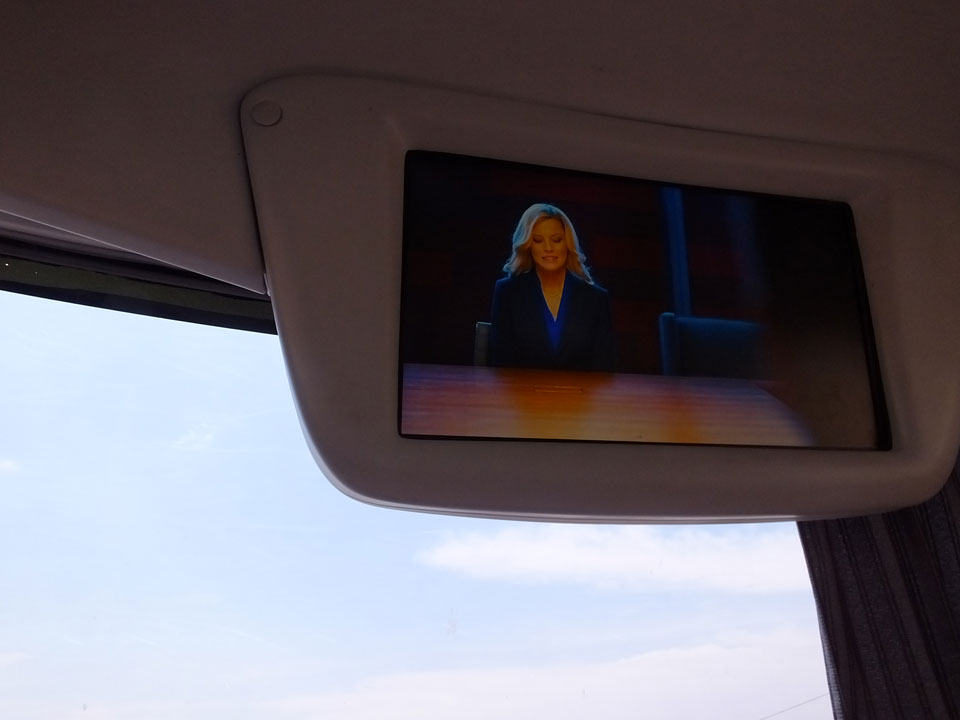 Eine ältere Frau neben mir – bequeme Sitze und viele Filme im Bus. Ganz vorne auf Sitz 2 hatte ich eine gute Sicht auf alles und Knipsmöglichkeiten.