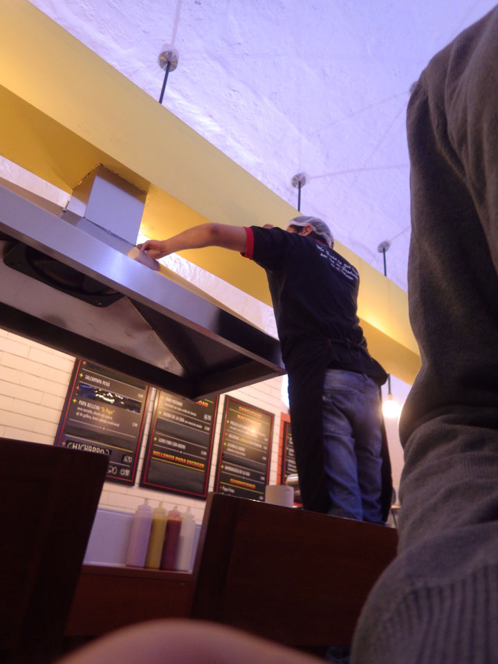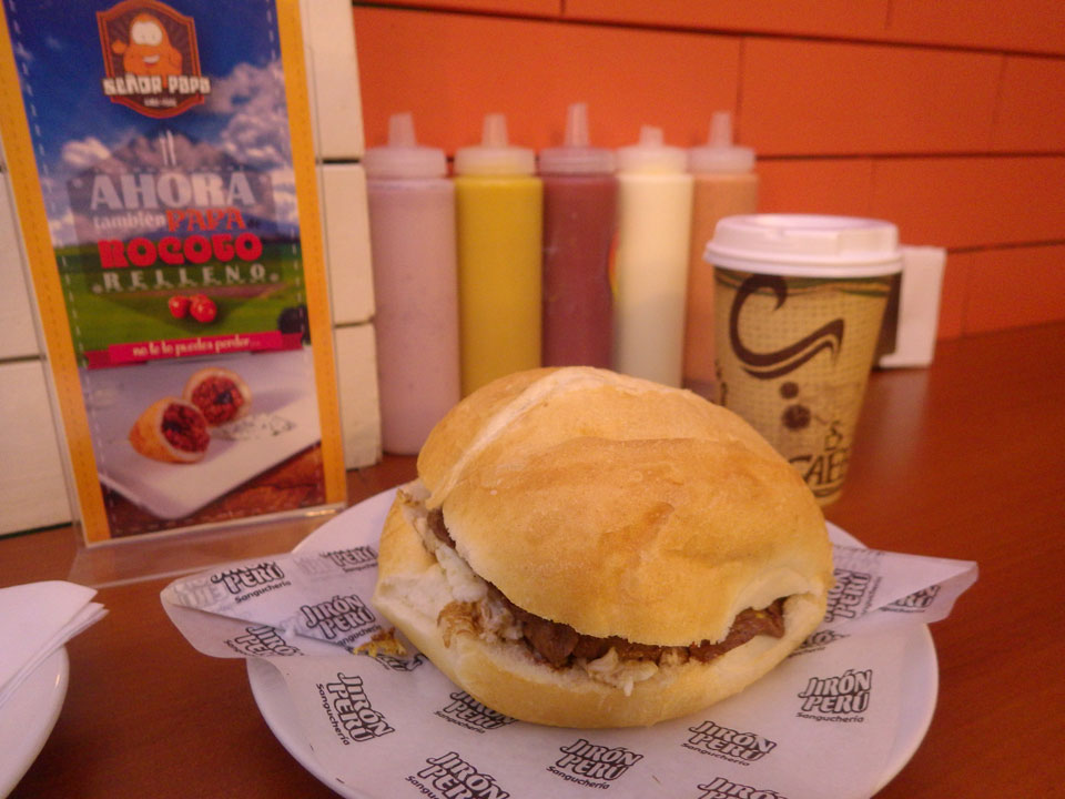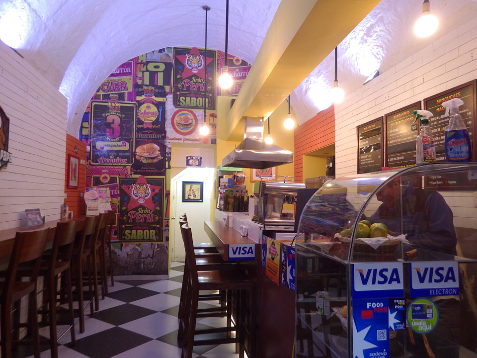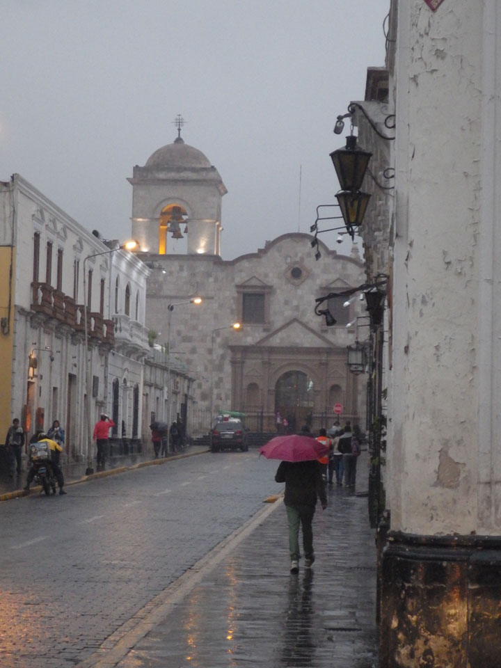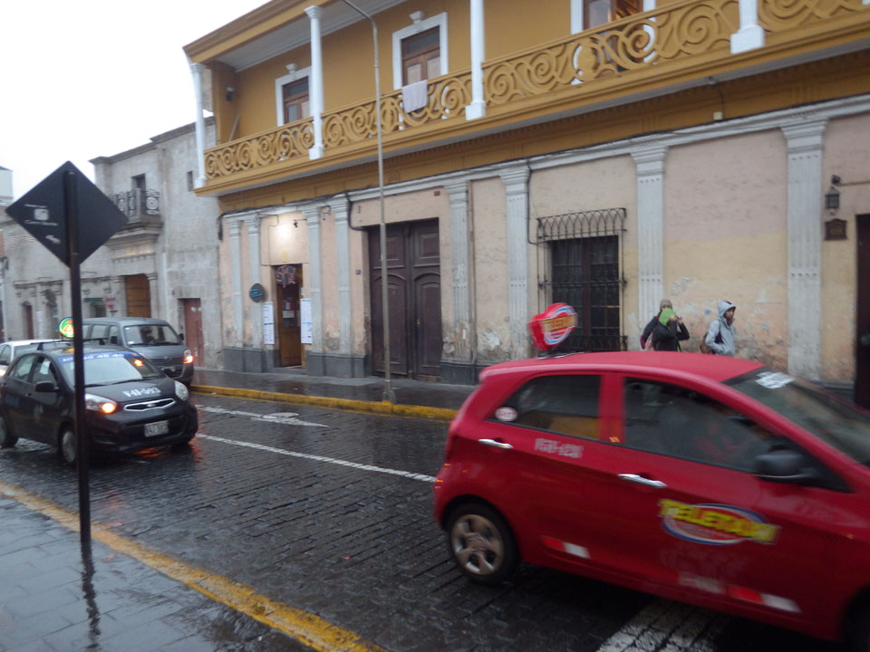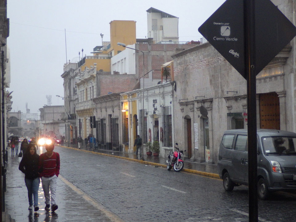 Regenwetter in Arequipa. Ich ging gerade mal um die Ecke auf ein Sandwich. Dank der scharfen Soße und Cappuccino war ich zufrieden. Internet im Zimmer ging auch – alles OK bei dem Wetter.