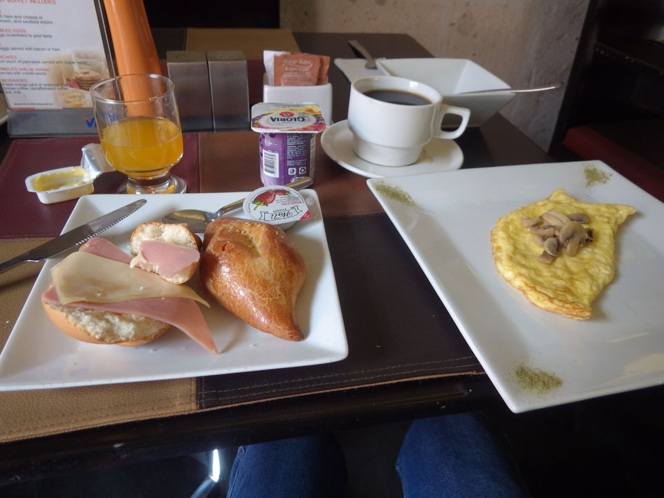 Früh erwischte ich noch schnell das Frühstück, was ganz gut war. Ein Omelett wurde noch gefixt, alles OK. Im Zimmer dann war ich unsicher, ob gestern „trece“ (13:00) oder „tres“ (3=15:00) als Abflugzeit drin war.