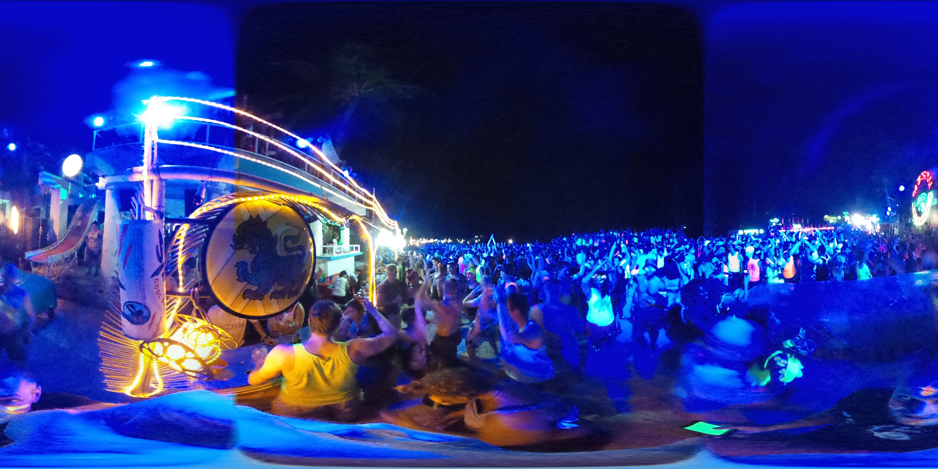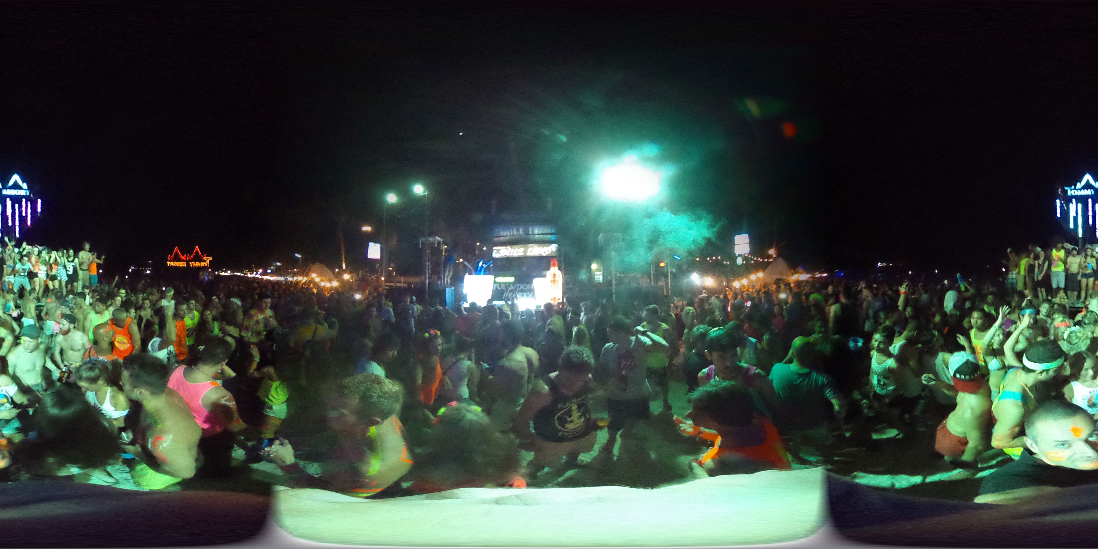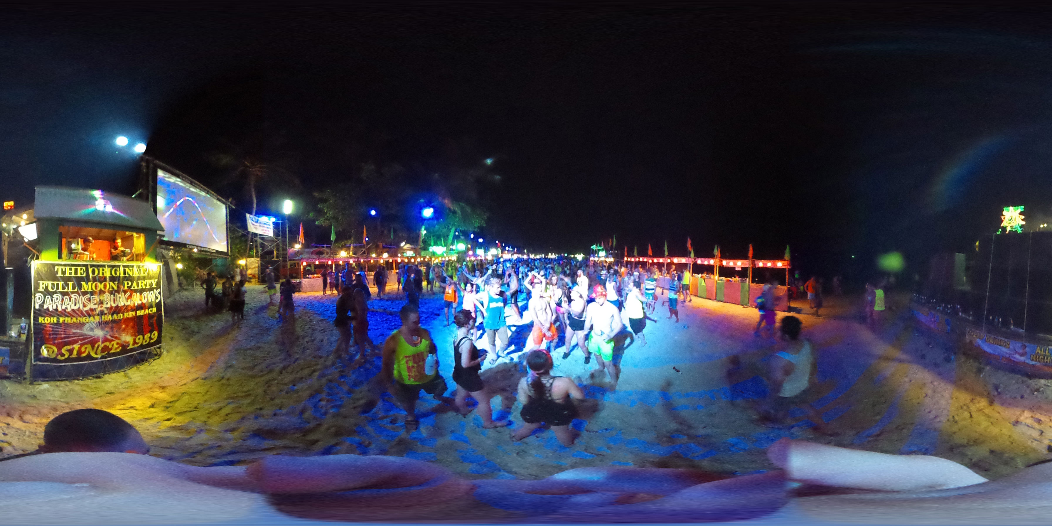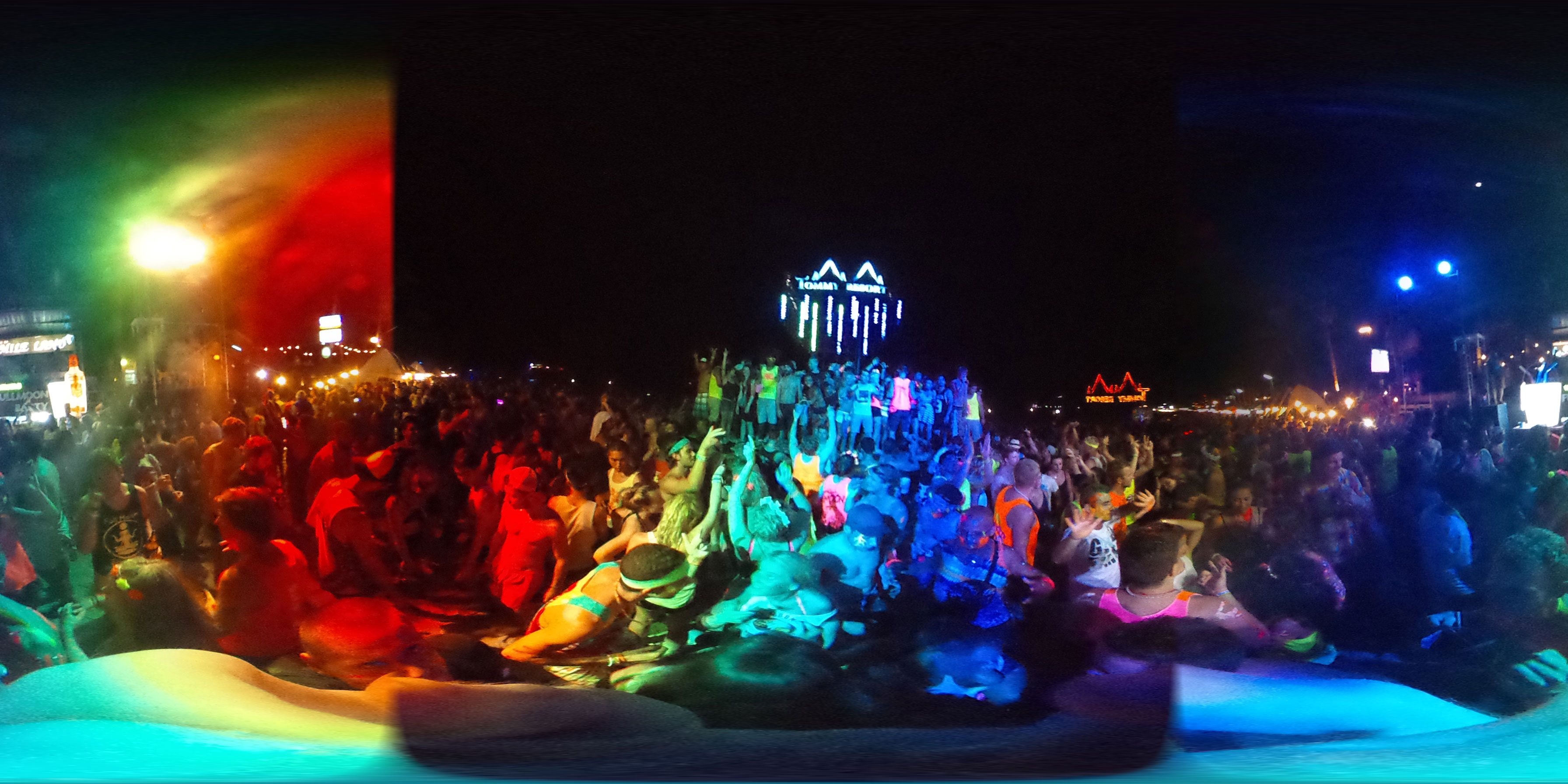 Zum Karfreitag habe ich etwas gemischte Gefühle dazu. Ich aß was in einem Corner Café – kein rotes Fleisch natürlich. Dann später bekam ich ein Bier für die zukünftigen Photos. Meine erste Bezahlung für die 360° Camera. Ich schoss ein paar Bilder, bemalte dann meine Arme mit etwas Leuchtfarbe. Alle im Hostel bemalten sich für die Party am Haad Rin Strand. Alles eben wie im Cliché.