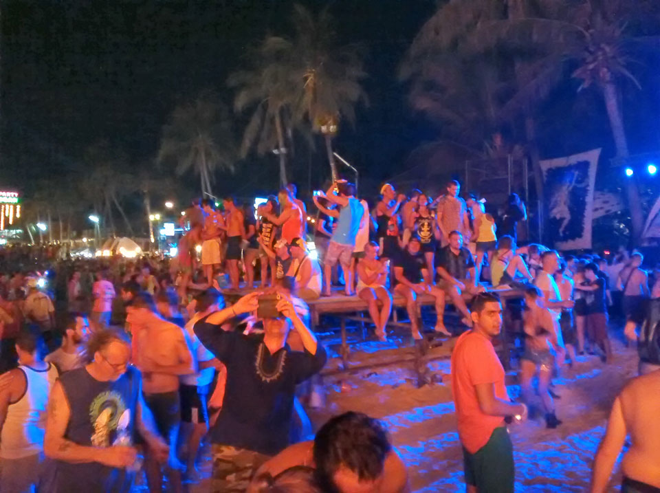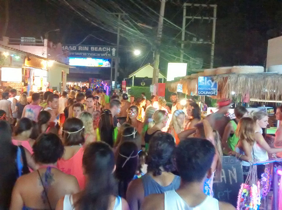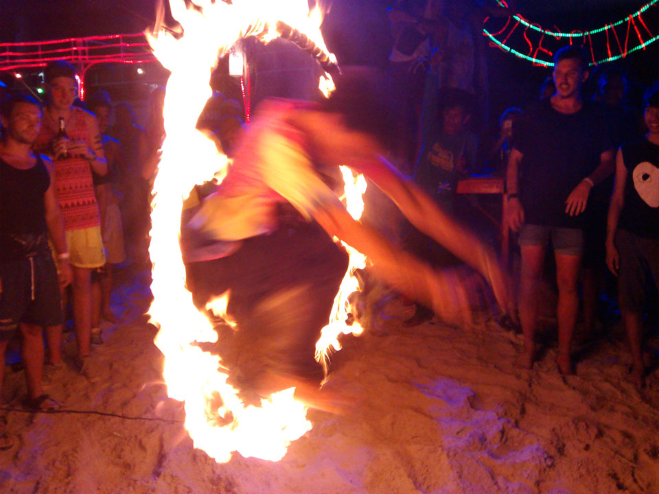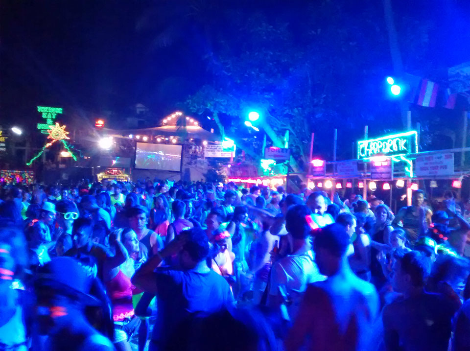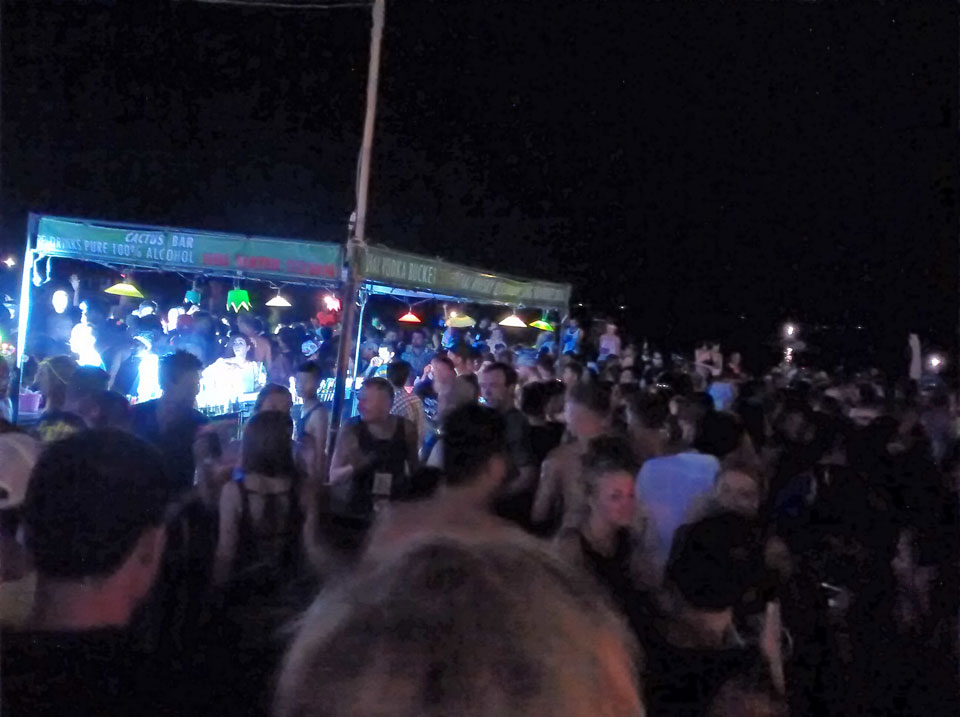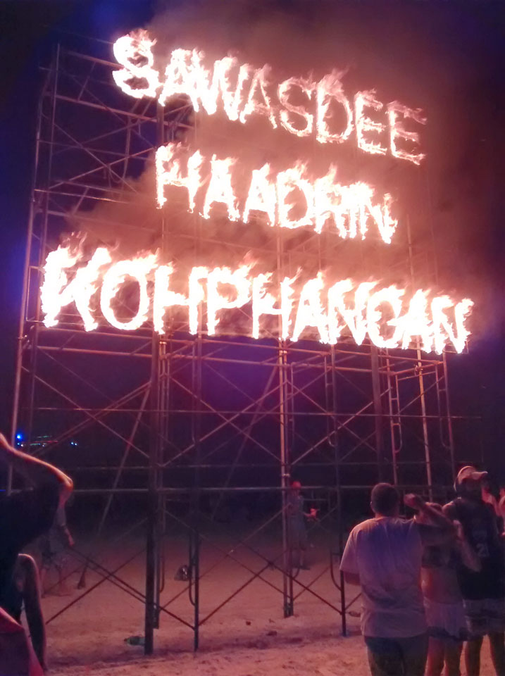 Na gut, die Nacht startete dann, Taxis kamen und brachten uns nach Haad Rin. Dort dann ging ich mit dem aus Oman. Er kannte einen Weg, um den Eintritt von 100 THB zu umgehen. Ich verlor die beiden dann doch schnell und war dann alleine. So ging ich dann gut herum, mixte mir Bier mit Red Bull und war gut drauf. Alles ziemlich trashy und touristisch aber so ist das eben mit allen netten Sachen. Ich fand’s OK, schließich bin ich auch fast nur deswegen hier.