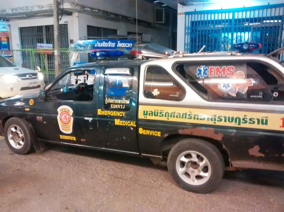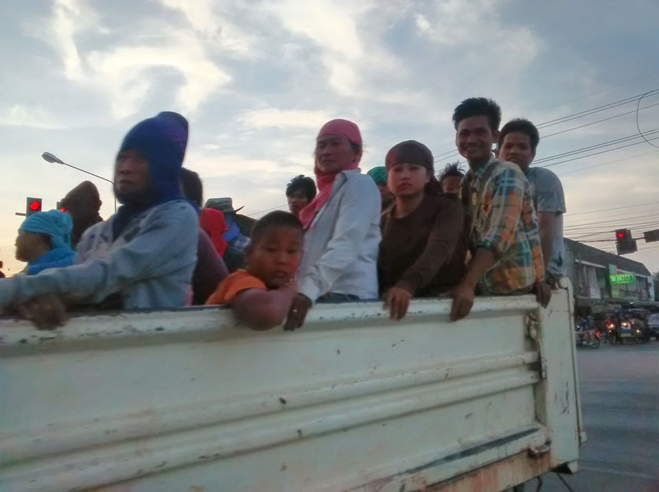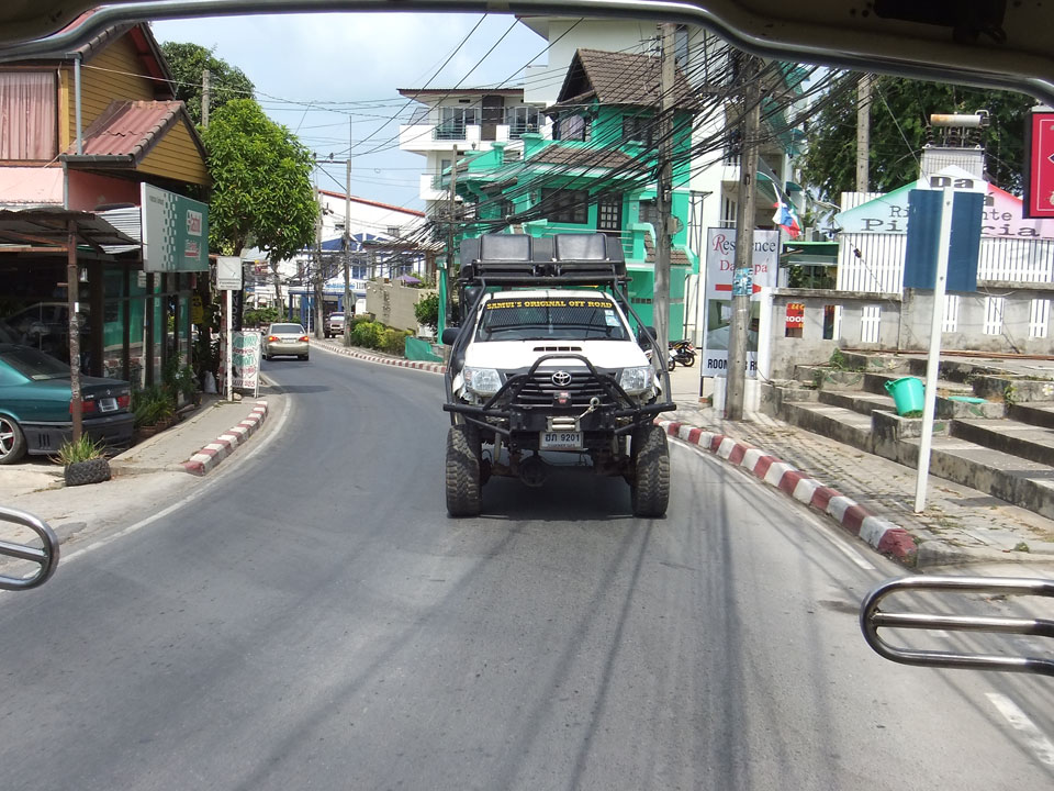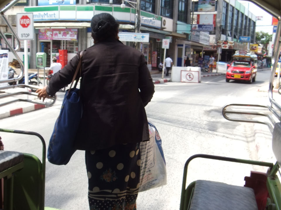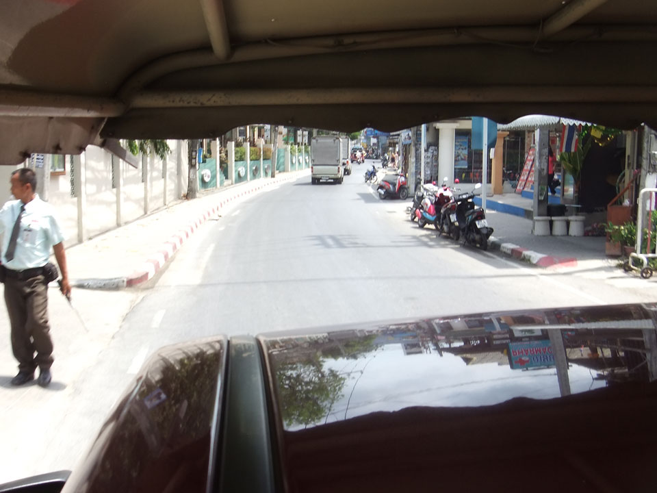 Bei der Fitnessgruppe war ein Mediziner-Dienst. Große Diskussion, welches Hotel wohl gut sei. Als Backpacker wollte ich was billigen aber das konnten sie wohl ahnen. Mein Rucksack wurde verstaut, ein paar Kinder sprangen mit hinten rein und wir fuhren los. Der Thai machte eine Abmeldung an der Zentrale, dass er einen Touri in die Stadt fährt – soweit ich das verstand.