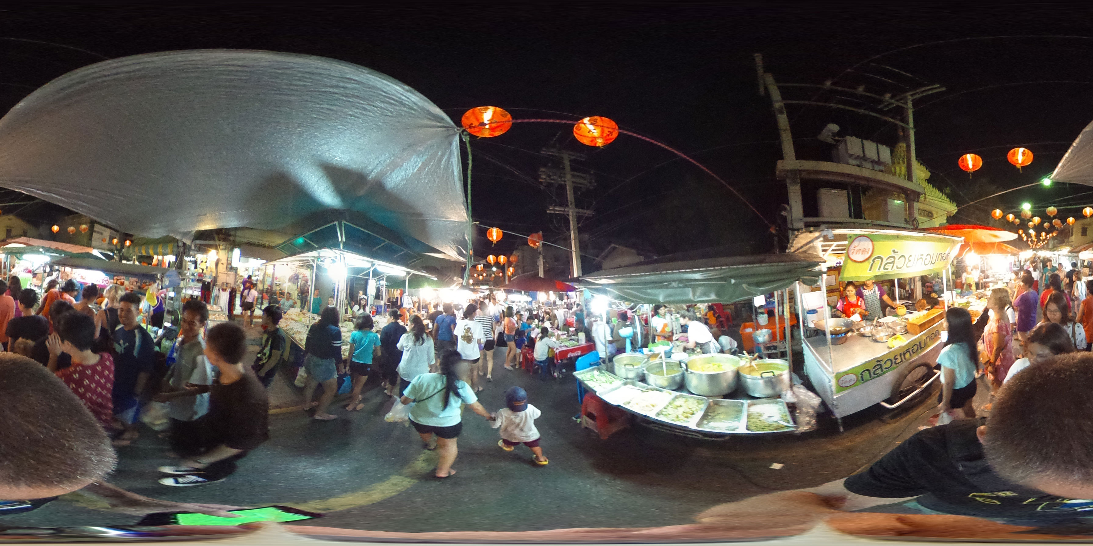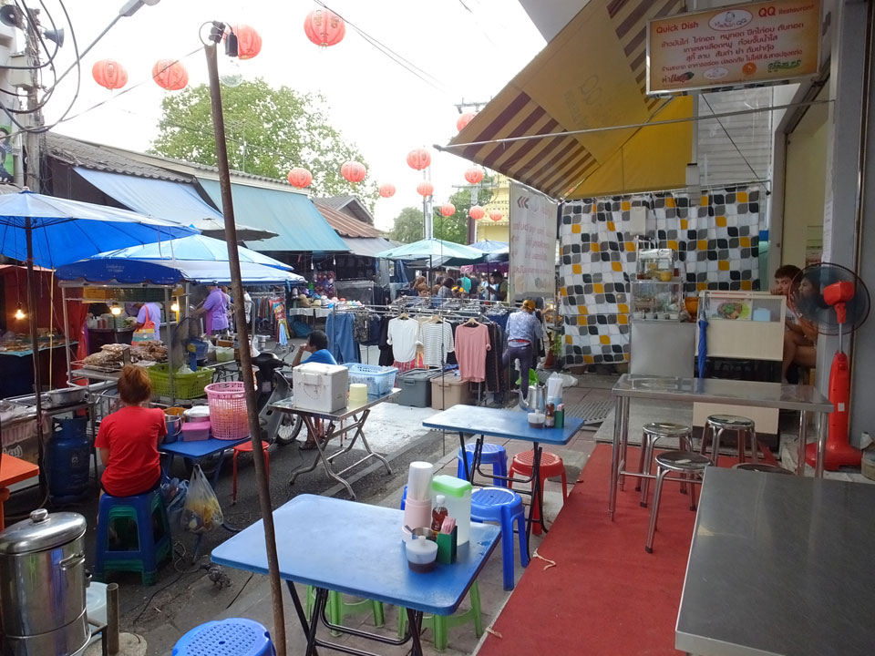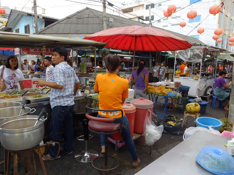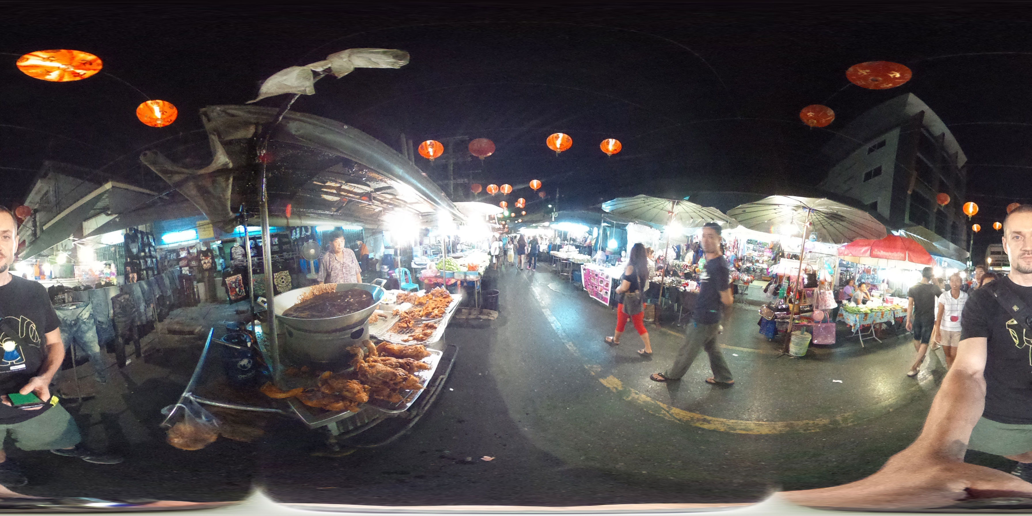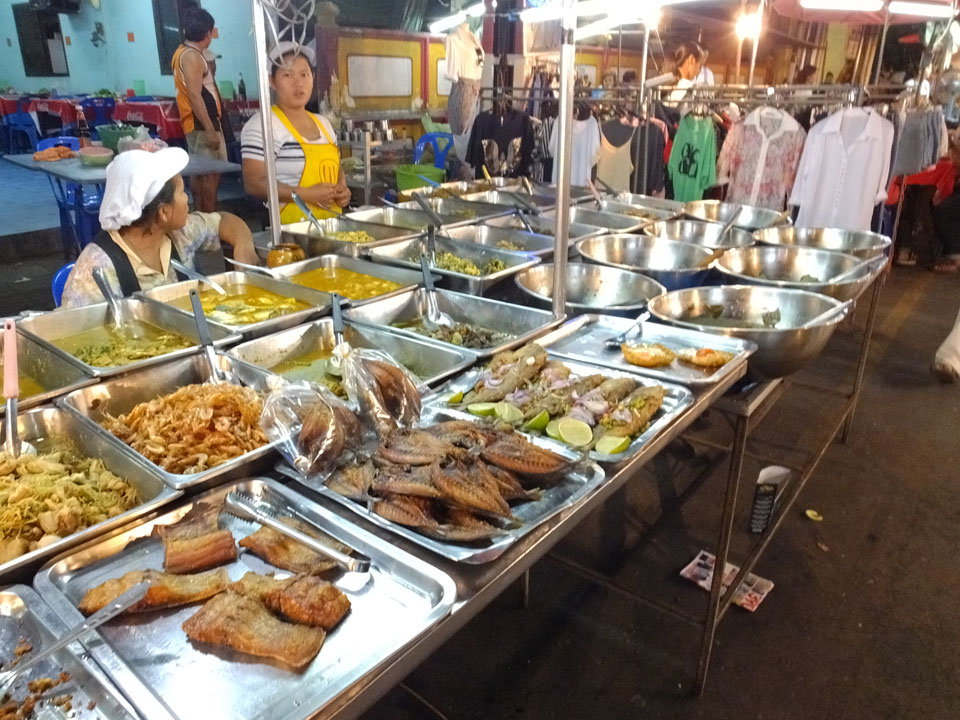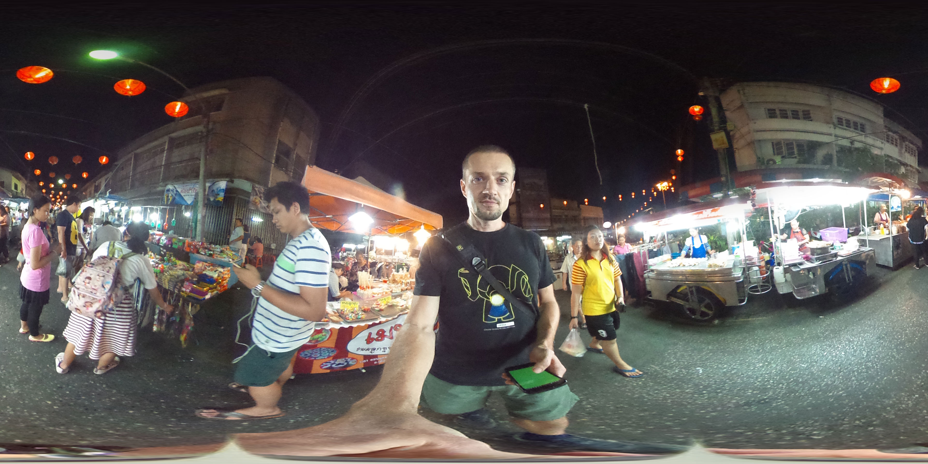 Abends dann nochmals auf den Markt. Ich knipste 360°, aß so Einiges von den Ständen. Schließlich setzte ich mich in ein Restaurant auf ein Curry. Ein Thai fing ein Gespräch an, sehr gutes Englisch. Er hat ’ne Firma in Bangkok – Shipping. Er sagte, er hat noch nie einen Foreigner das Fisch-Curry essen sehen, weil zu scharf. Das hatte ich gerade mit Chilli nachgeschärft. Meine Nase lief aber auch ordentlich, wie immer, schmeckte aber ganz gut. Hier im Süden ist eben alles spicy. Ich überlegte nur, woher der Fisch stammt. Der Fluss schien nicht gerade sauber.