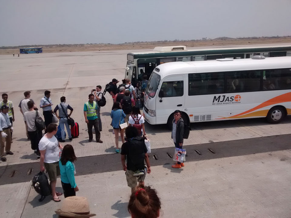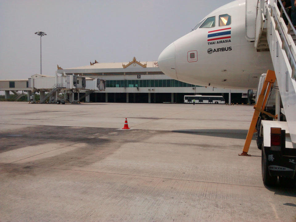 Der Anflug auf Mandalay / Myanmar zeiget schon eine andere Landschaft. Kleine Häuser mit blauen Dächern, alles sehr ländlich. Bei der Immigration klappte alles super, dann waren aber die Geldwechsler geschlossen. Hier ist auch das Neujahrsfest und so bildeten sich Schlangen vor den ATMs.