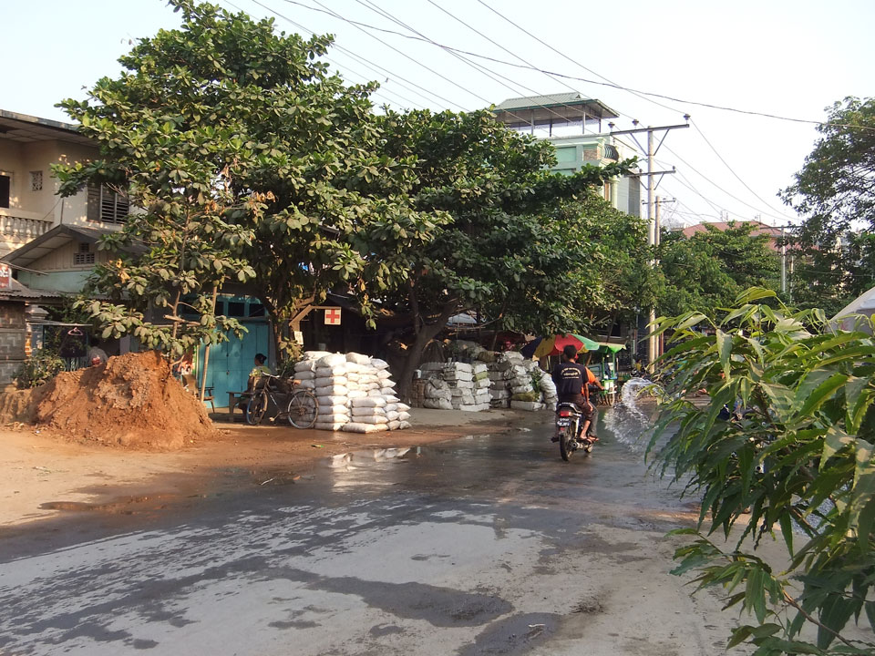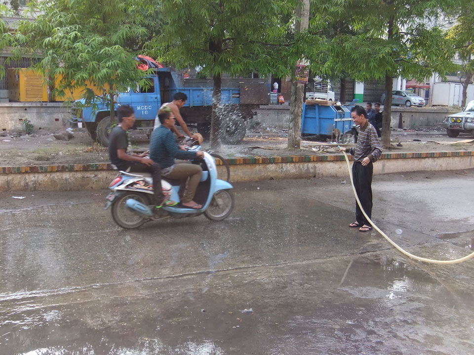 Nach etwas chillen bei der Klimaanlage packte ich mein Handy in die Songkran Tasche und ging eine Runde um den Block. Hier in Mandalay wurde auch das Wasserfest zum Neujahr gefeiert doch statt Wasserpistolen floge hier Eimer und Schüsseln Wasser durch die Luft. Ich war OK und konnte mich nicht wehren. So mancher Eimer ging mir über’s T-Shirt. Die Leute super nett, was mir etwas unangenehm und eben neu vorkam.
