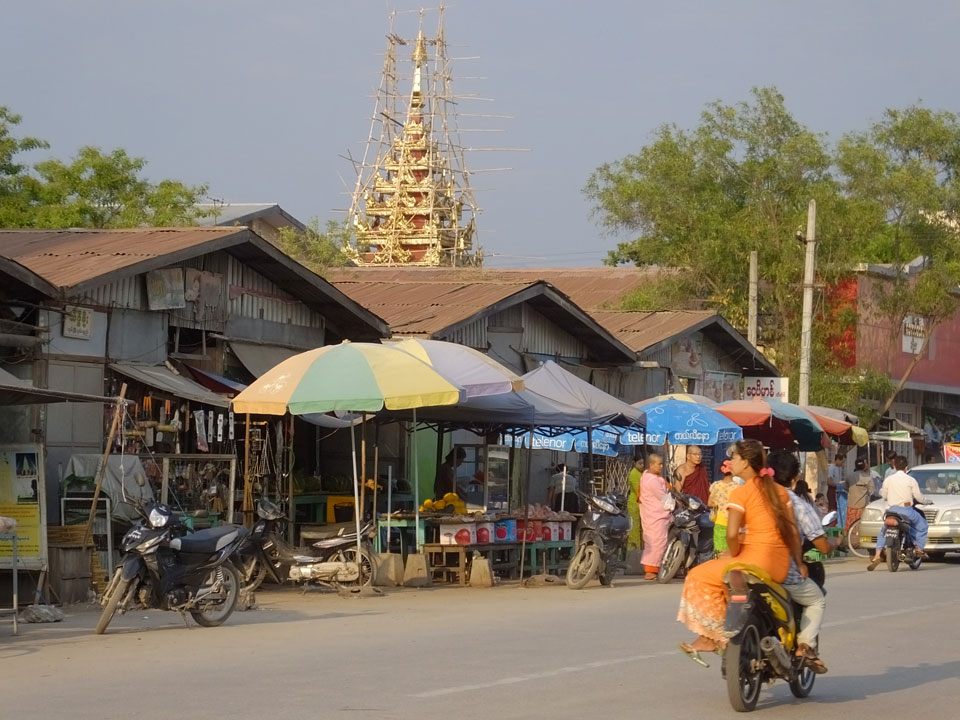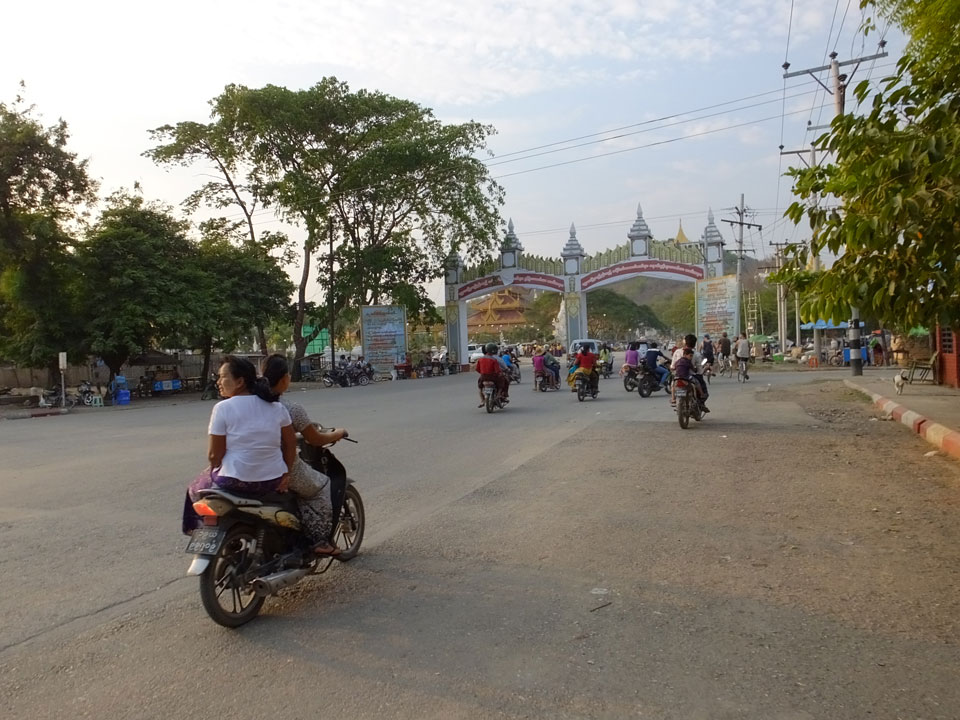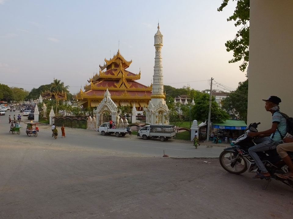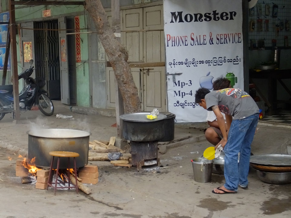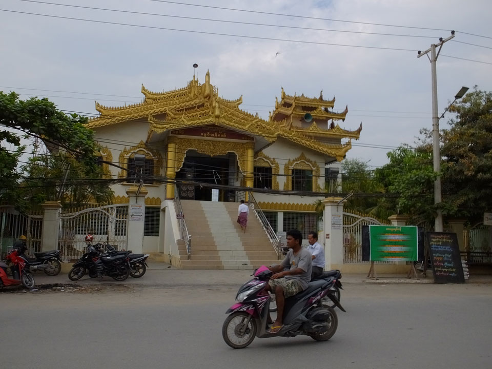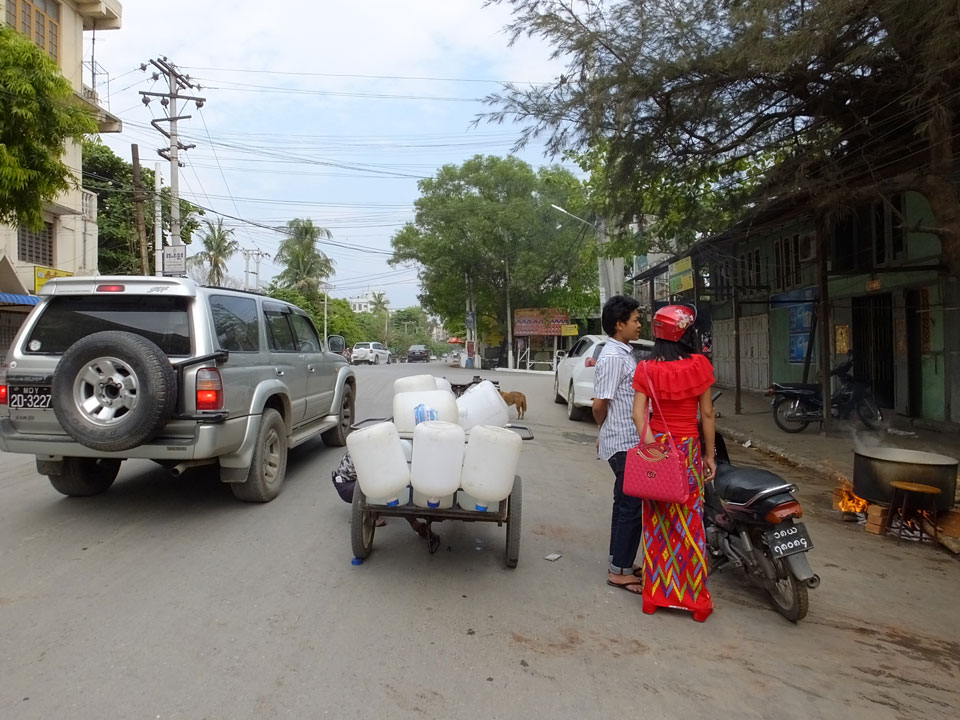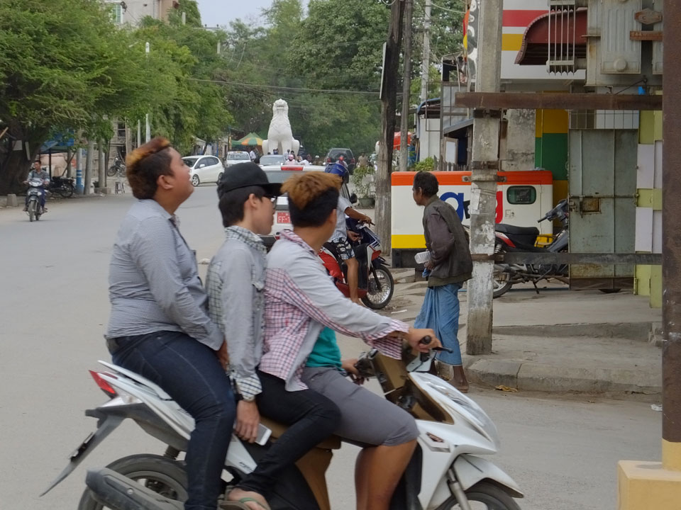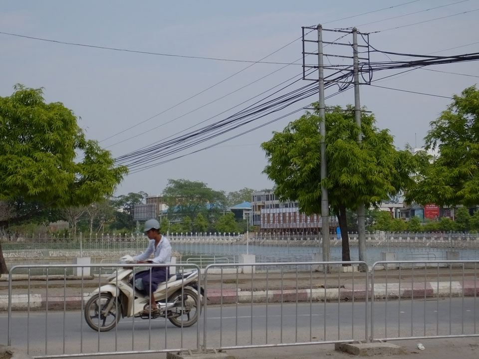 Mittags dann langsam los. Ein Mototaxi kostet 10.000 KYT pro Tag (€10), eine einfache Möglichkeit, die Stadt zu sehen. Ich bekam Reis in meinem Handybeutel – SUper! Dann sagte man mir, dass es eine halbe Stunde dauert, bis der Fahrer hier wäre – es gäbe Stau. Also mietete ich mir ein Fahrrad für den halben zu 3.000 und radelte los.
