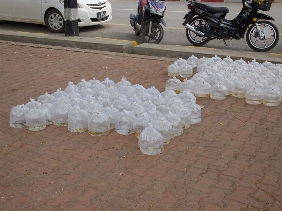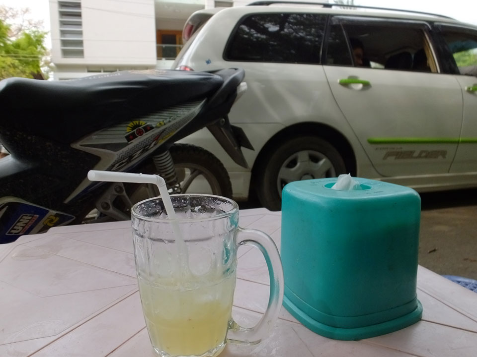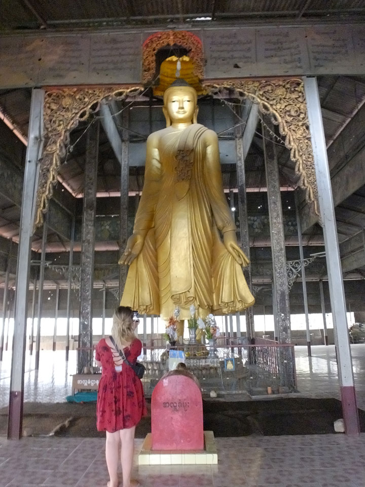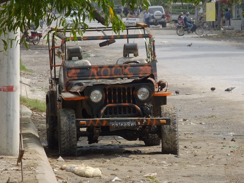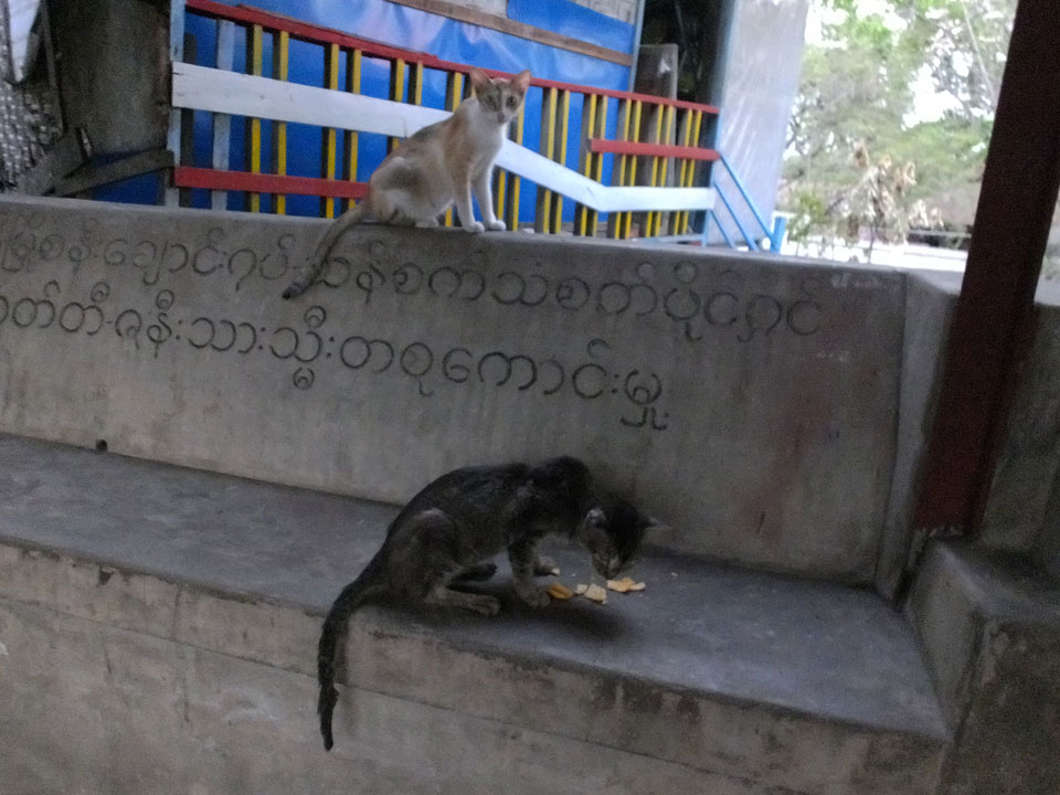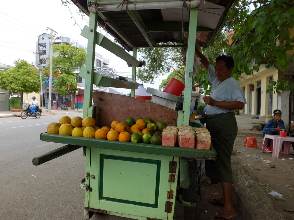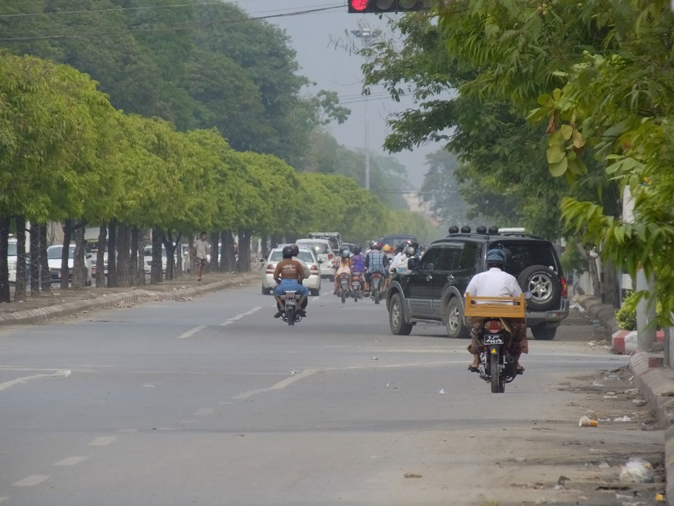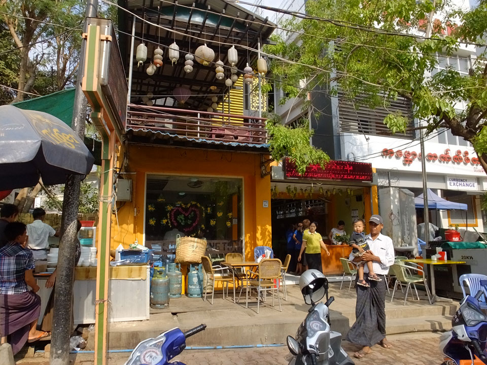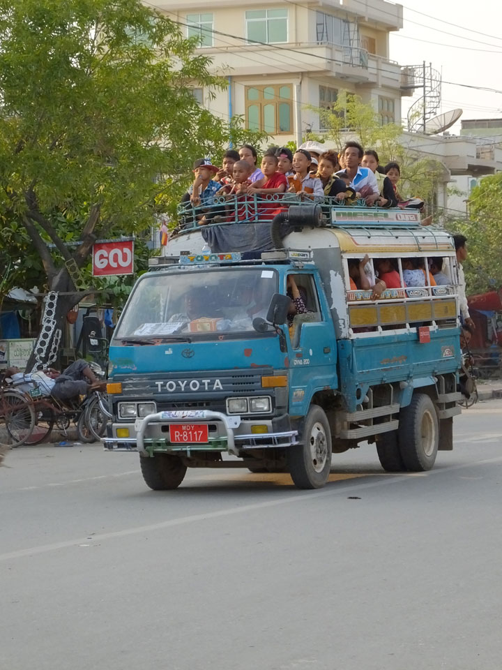 Mittags dann langsam los. Ein Mototaxi kostet 10.000 KYT pro Tag (€10), eine einfache Möglichkeit, die Stadt zu sehen. Ich bekam Reis in meinem Handybeutel – SUper! Dann sagte man mir, dass es eine halbe Stunde dauert, bis der Fahrer hier wäre – es gäbe Stau. Also mietete ich mir ein Fahrrad für den halben zu 3.000 und radelte los.
