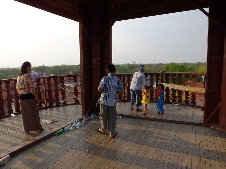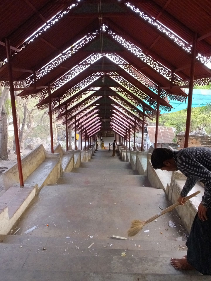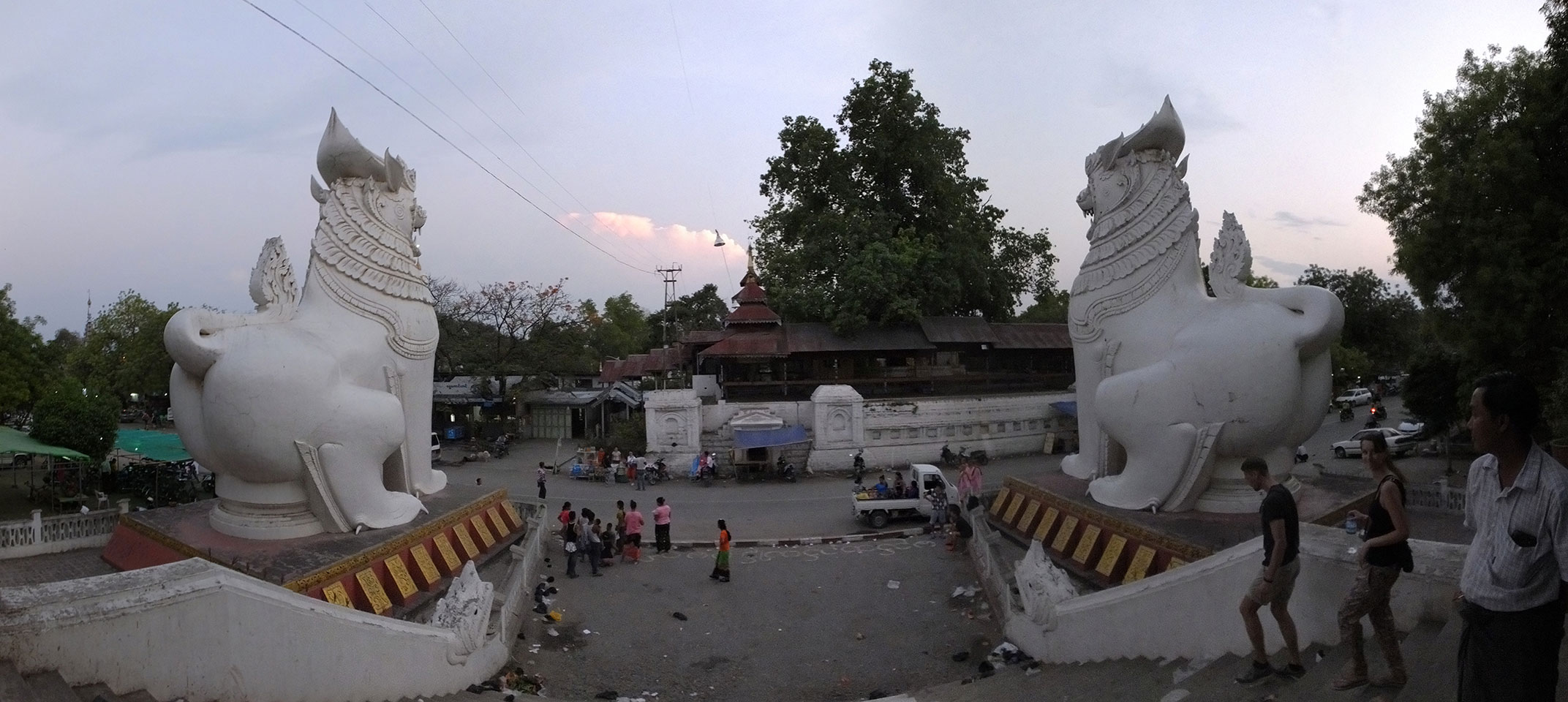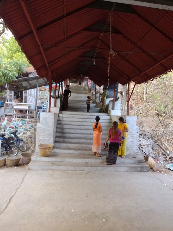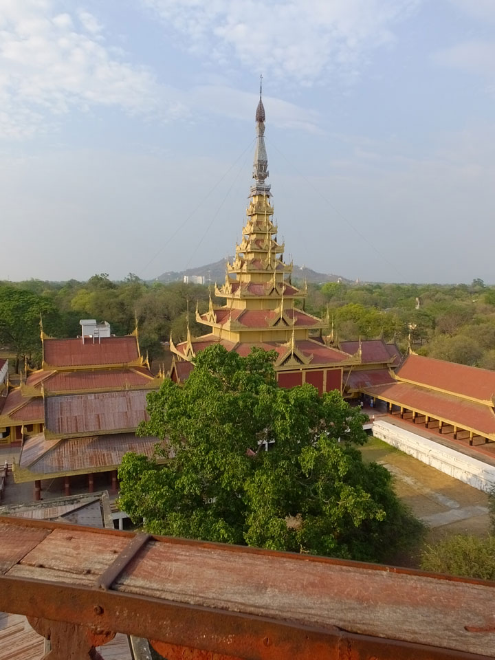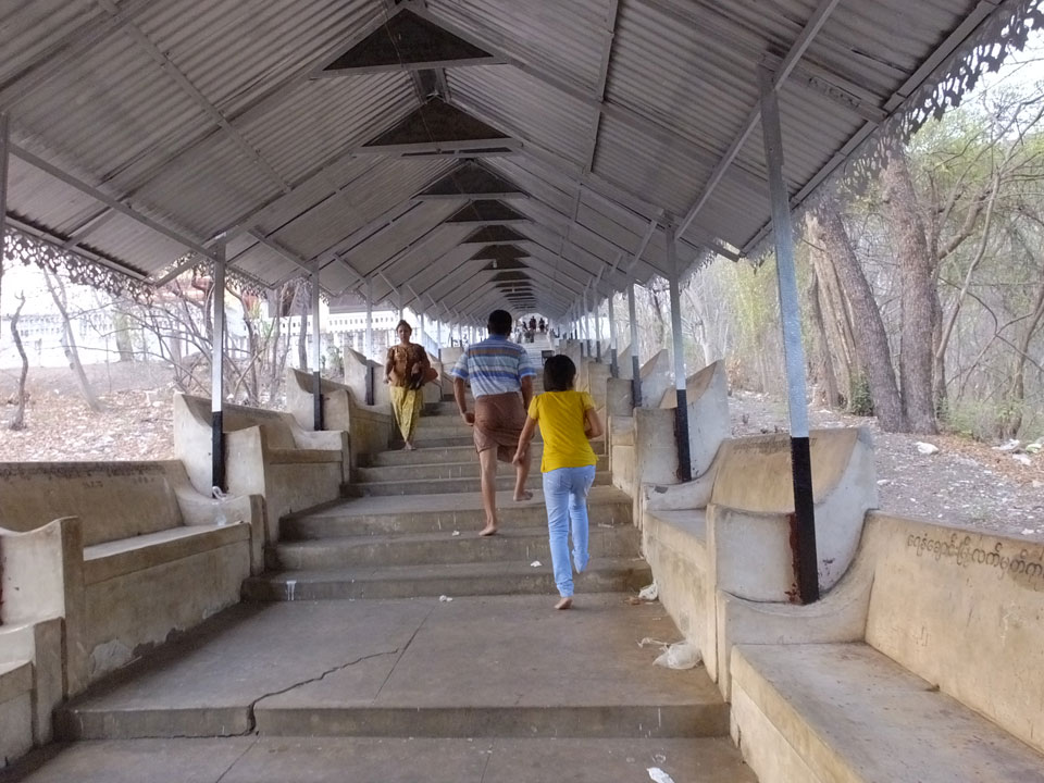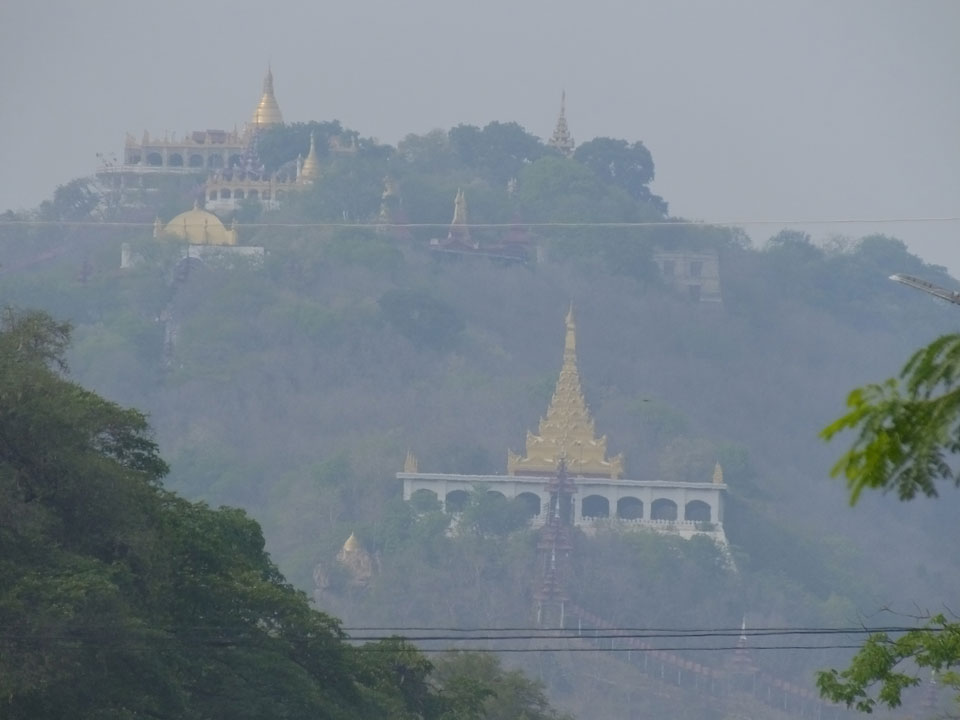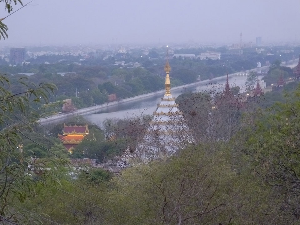 Was man alles aus Holz bauen kann… Viele große und kleine Gebäude sahen nett aus in der Hitze. Ich stieg auch auf den Wachturm hoch, knipste viel. Nach einer Weile ging’s weiter. Über Umwege in der Gegend mit Einblicken in das normale burmesische Leben, kam ich schließlich zum Mandalay Hill. Da fand ich schließlich auch den Eingang zu dem Treppen Richtung Sonnenuntergangs-Aussicht. Für 200 stellte ich mein Rad ab, 200 meine Flip-Flops. Inzwischen war ch super knapp bei Kasse. Die 30.000 vom Mittwoch waren nun fast verbraucht. Ich musste laufen, Angebote zum Mopedtransport gab’s auch.
