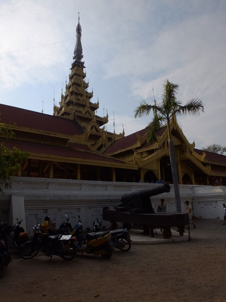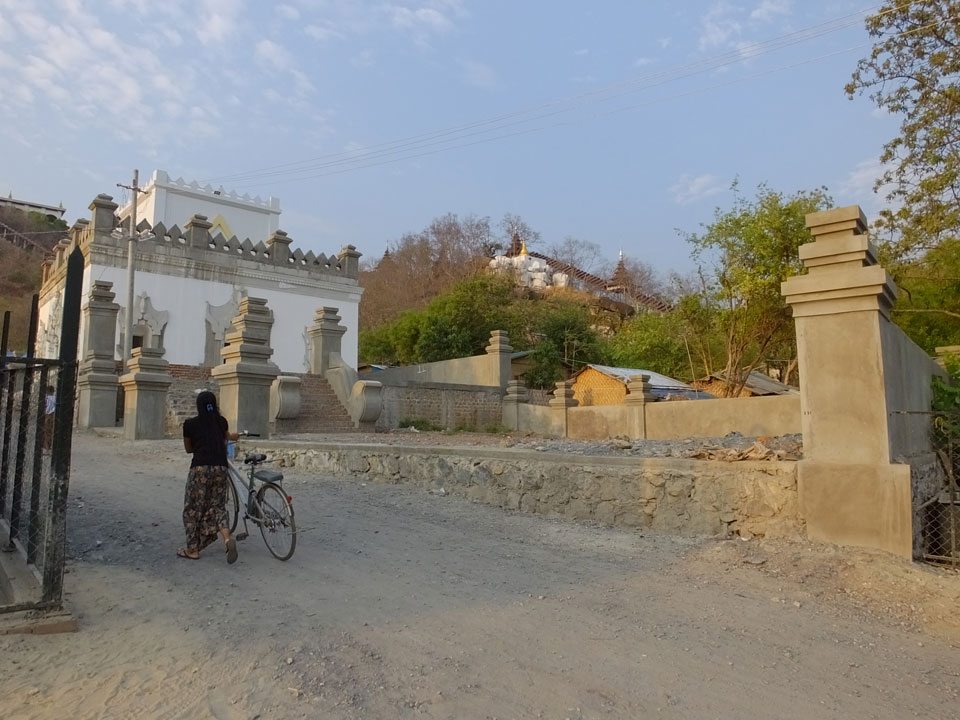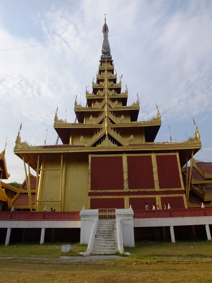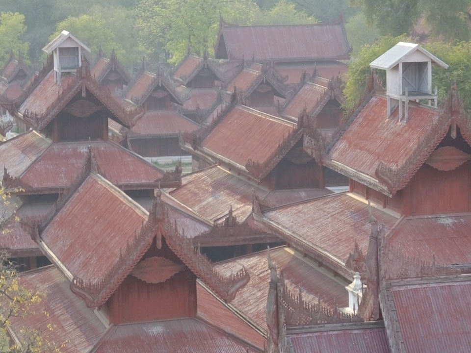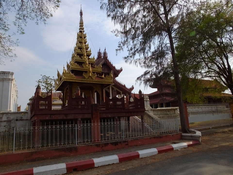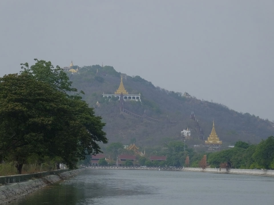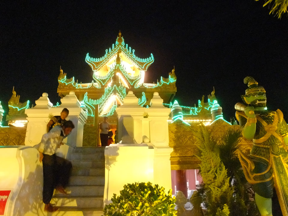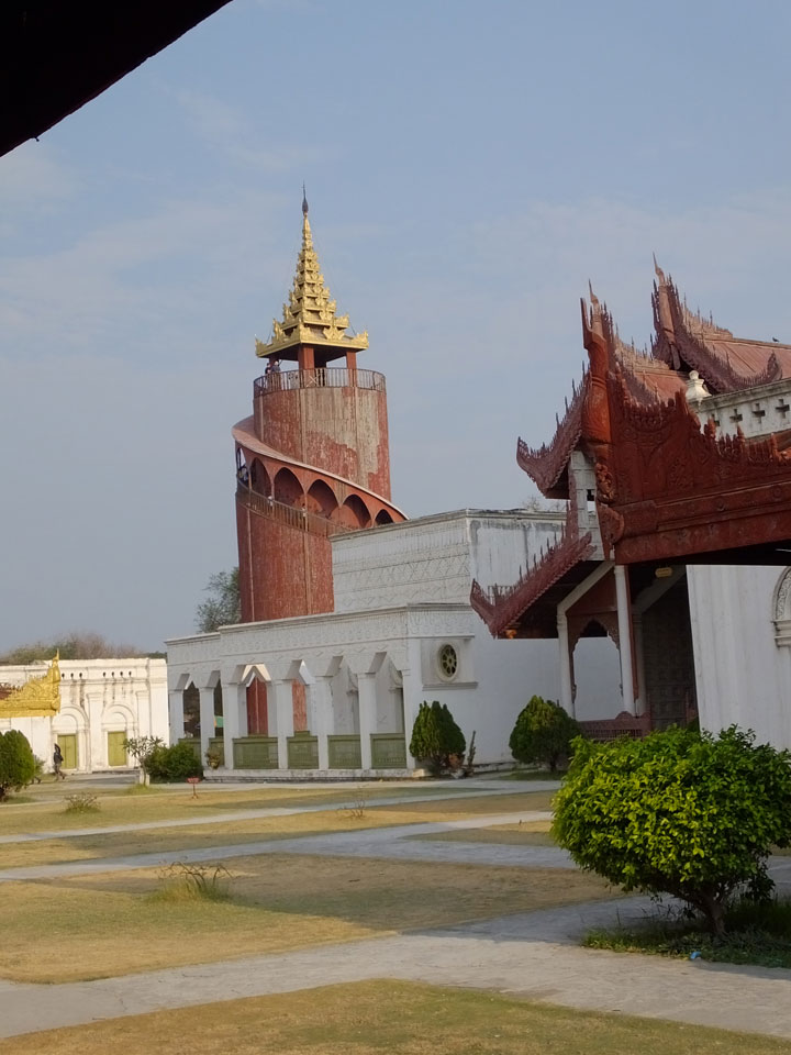 Was man alles aus Holz bauen kann… Viele große und kleine Gebäude sahen nett aus in der Hitze. Ich stieg auch auf den Wachturm hoch, knipste viel. Nach einer Weile ging’s weiter. Über Umwege in der Gegend mit Einblicken in das normale burmesische Leben, kam ich schließlich zum Mandalay Hill. Da fand ich schließlich auch den Eingang zu dem Treppen Richtung Sonnenuntergangs-Aussicht. Für 200 stellte ich mein Rad ab, 200 meine Flip-Flops. Inzwischen war ch super knapp bei Kasse. Die 30.000 vom Mittwoch waren nun fast verbraucht. Ich musste laufen, Angebote zum Mopedtransport gab’s auch.