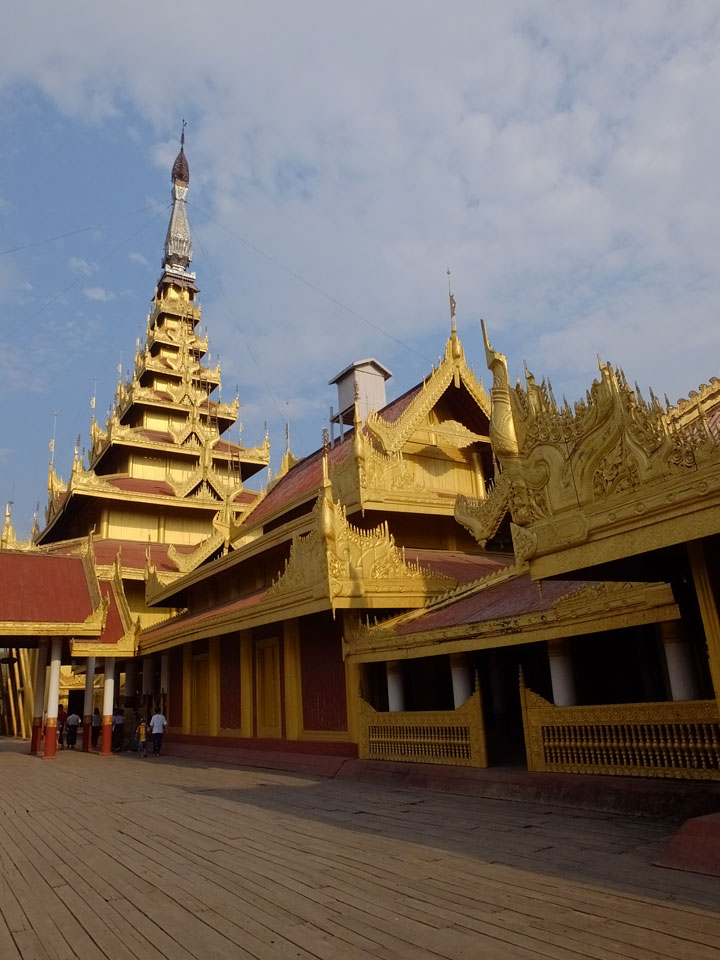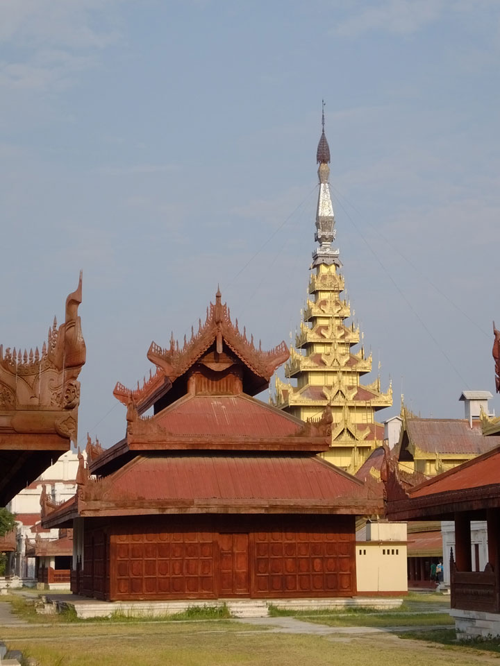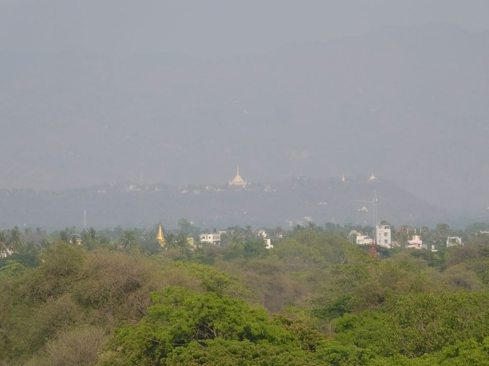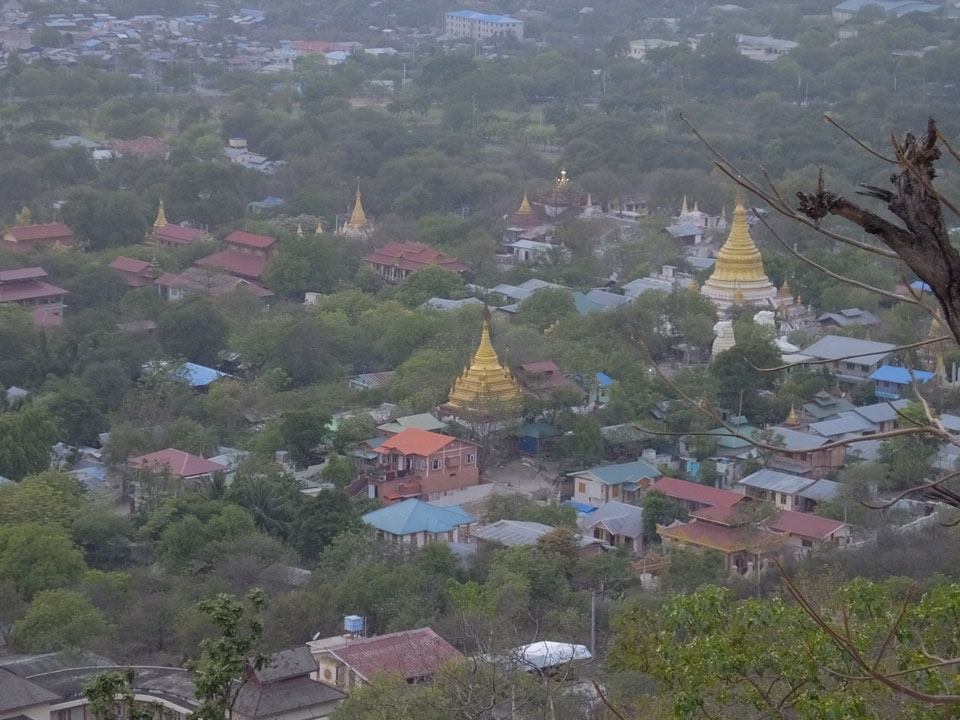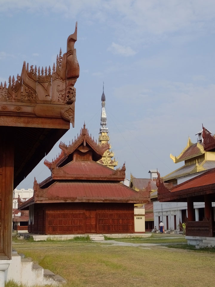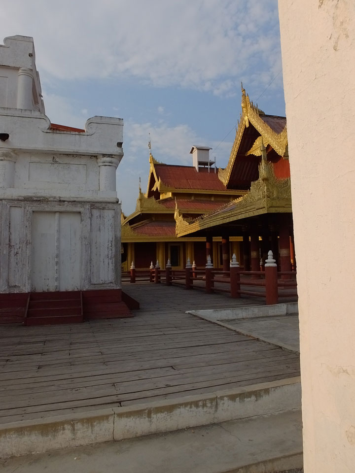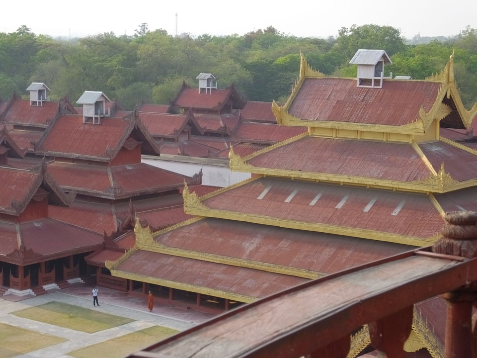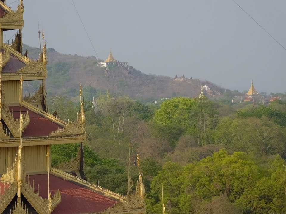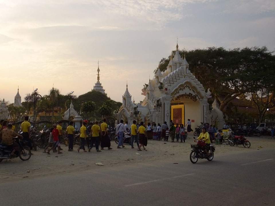 Was man alles aus Holz bauen kann… Viele große und kleine Gebäude sahen nett aus in der Hitze. Ich stieg auch auf den Wachturm hoch, knipste viel. Nach einer Weile ging’s weiter. Über Umwege in der Gegend mit Einblicken in das normale burmesische Leben, kam ich schließlich zum Mandalay Hill. Da fand ich schließlich auch den Eingang zu dem Treppen Richtung Sonnenuntergangs-Aussicht. Für 200 stellte ich mein Rad ab, 200 meine Flip-Flops. Inzwischen war ch super knapp bei Kasse. Die 30.000 vom Mittwoch waren nun fast verbraucht. Ich musste laufen, Angebote zum Mopedtransport gab’s auch.