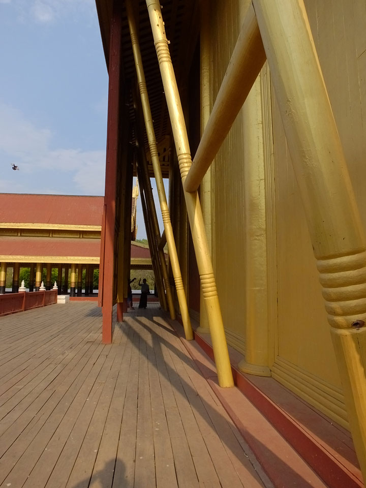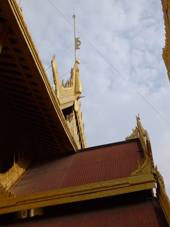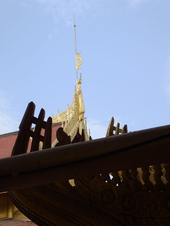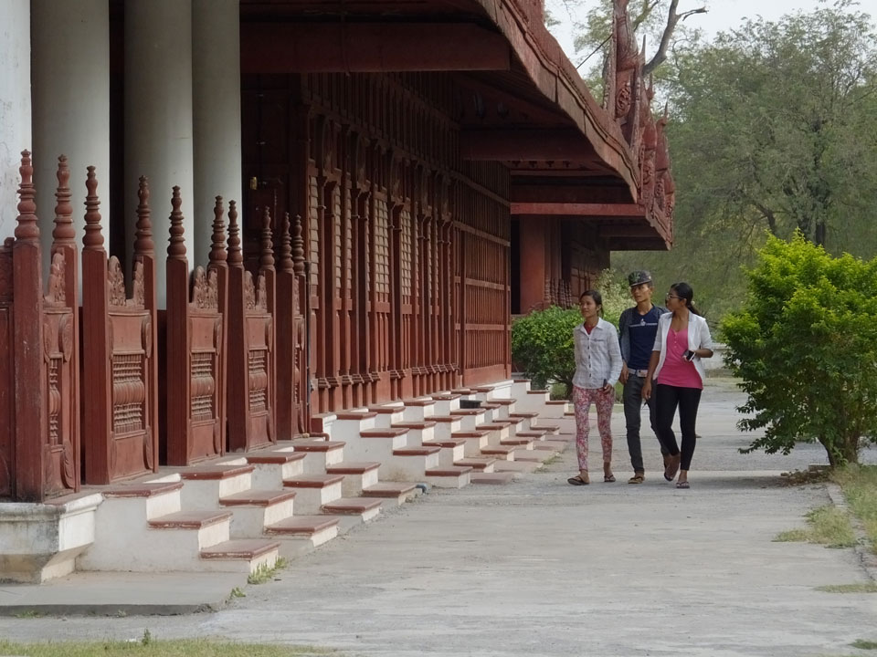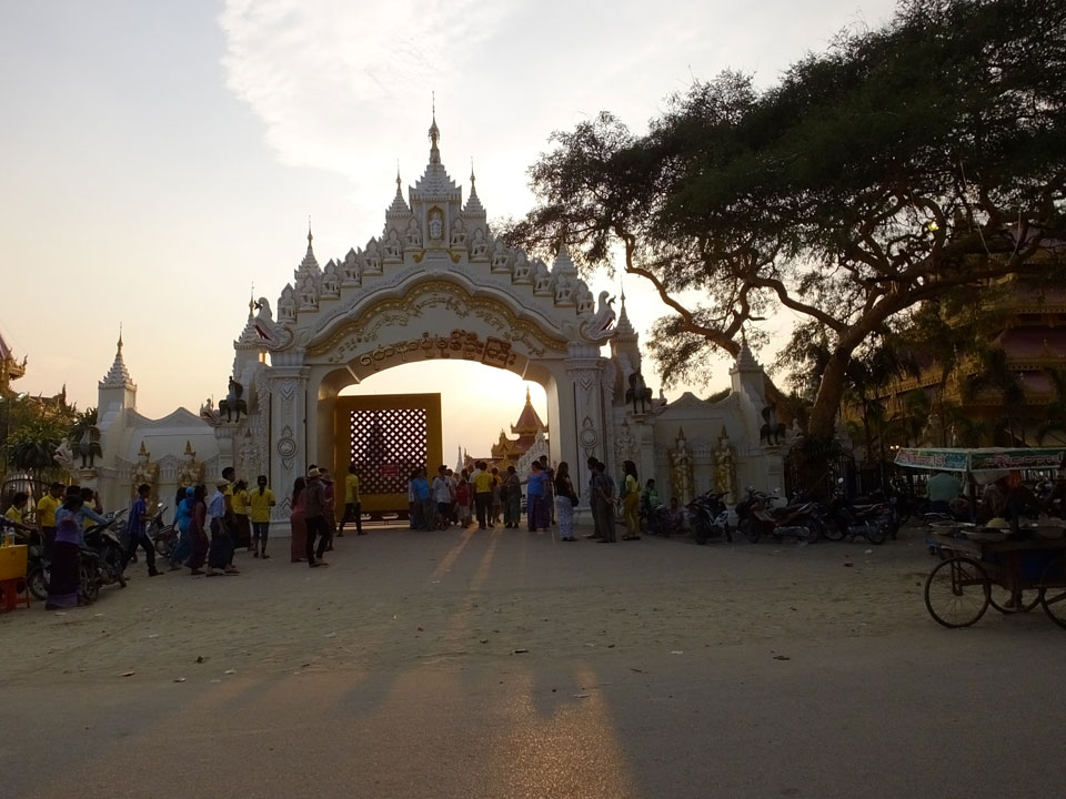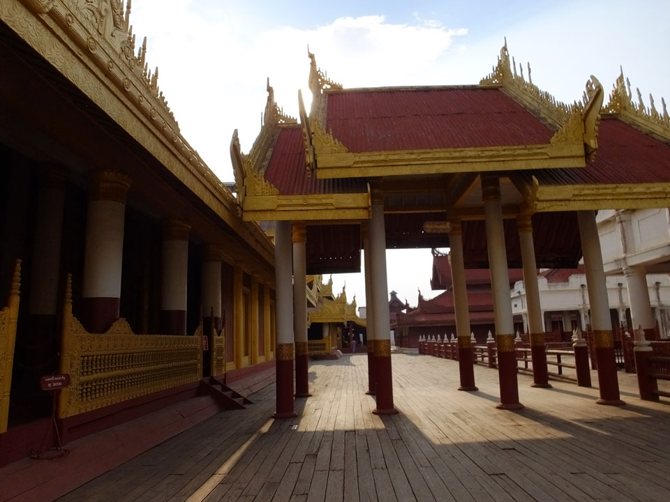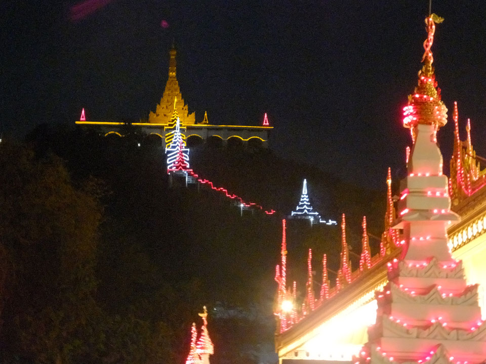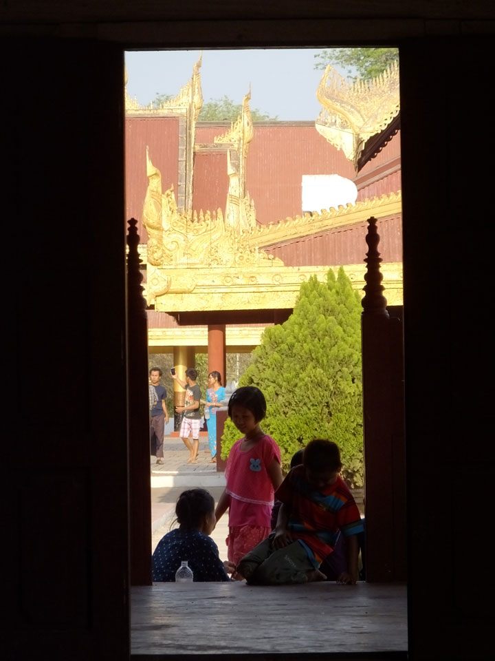 Was man alles aus Holz bauen kann… Viele große und kleine Gebäude sahen nett aus in der Hitze. Ich stieg auch auf den Wachturm hoch, knipste viel. Nach einer Weile ging’s weiter. Über Umwege in der Gegend mit Einblicken in das normale burmesische Leben, kam ich schließlich zum Mandalay Hill. Da fand ich schließlich auch den Eingang zu dem Treppen Richtung Sonnenuntergangs-Aussicht. Für 200 stellte ich mein Rad ab, 200 meine Flip-Flops. Inzwischen war ch super knapp bei Kasse. Die 30.000 vom Mittwoch waren nun fast verbraucht. Ich musste laufen, Angebote zum Mopedtransport gab’s auch.