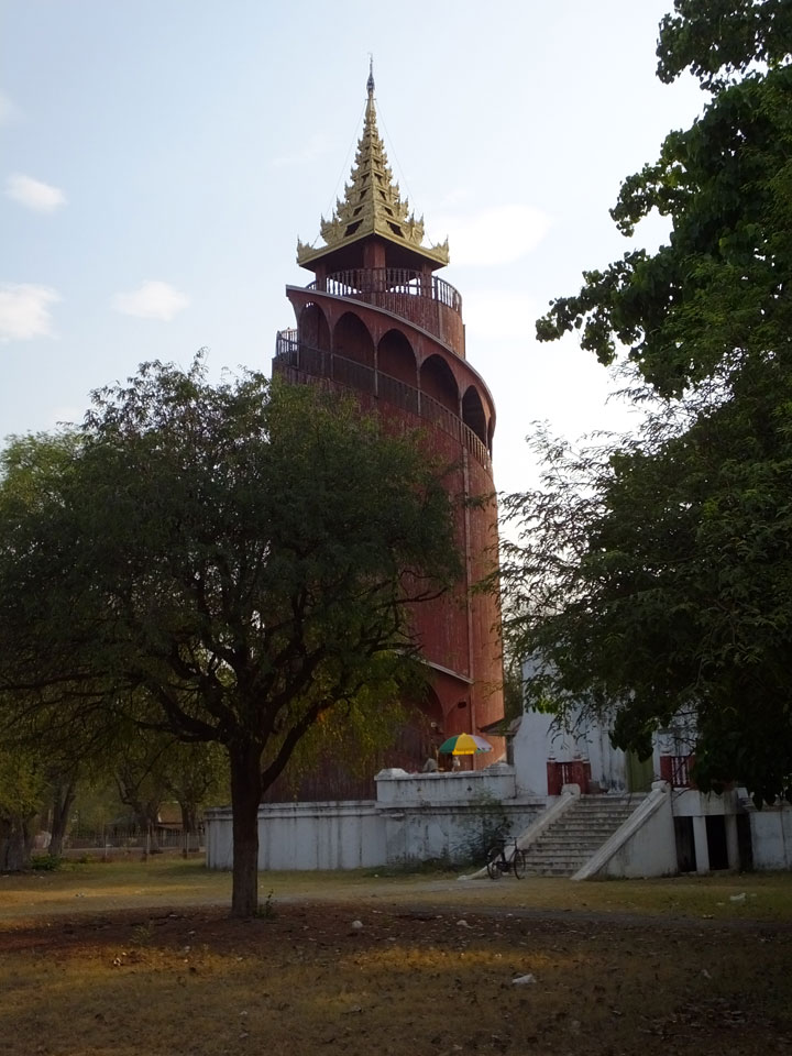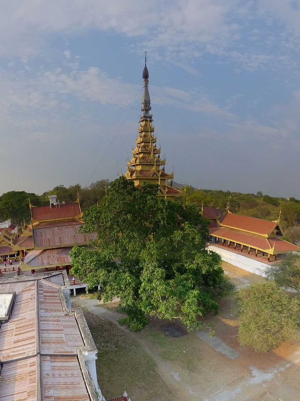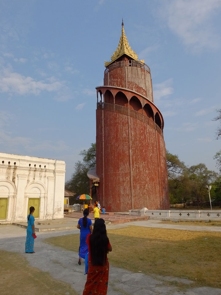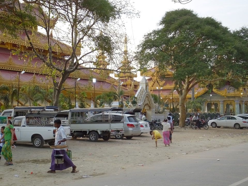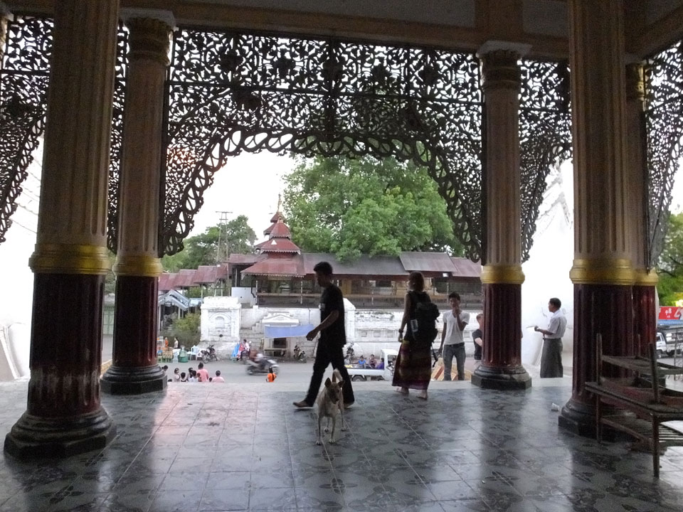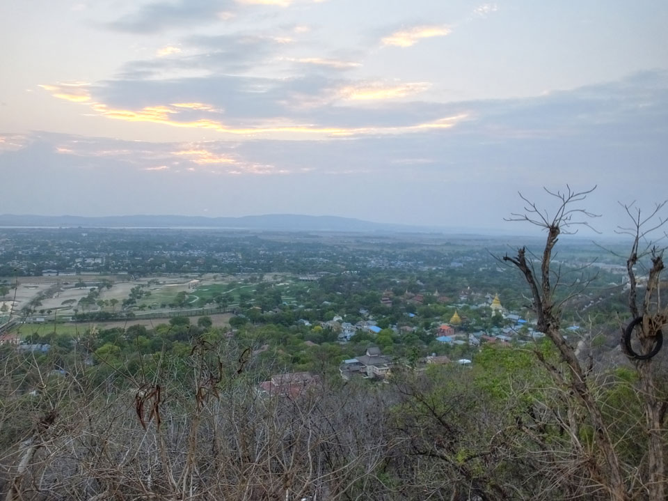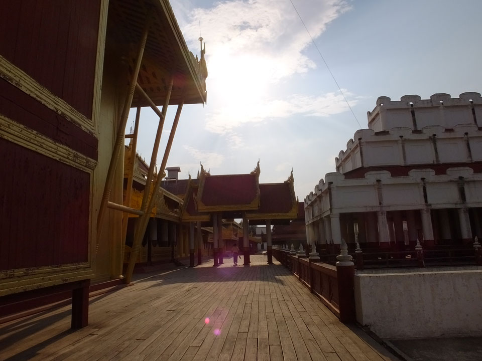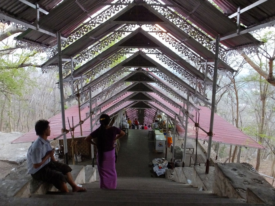 Was man alles aus Holz bauen kann… Viele große und kleine Gebäude sahen nett aus in der Hitze. Ich stieg auch auf den Wachturm hoch, knipste viel. Nach einer Weile ging’s weiter. Über Umwege in der Gegend mit Einblicken in das normale burmesische Leben, kam ich schließlich zum Mandalay Hill. Da fand ich schließlich auch den Eingang zu dem Treppen Richtung Sonnenuntergangs-Aussicht. Für 200 stellte ich mein Rad ab, 200 meine Flip-Flops. Inzwischen war ch super knapp bei Kasse. Die 30.000 vom Mittwoch waren nun fast verbraucht. Ich musste laufen, Angebote zum Mopedtransport gab’s auch.