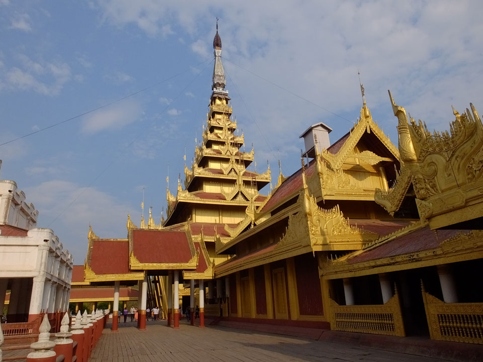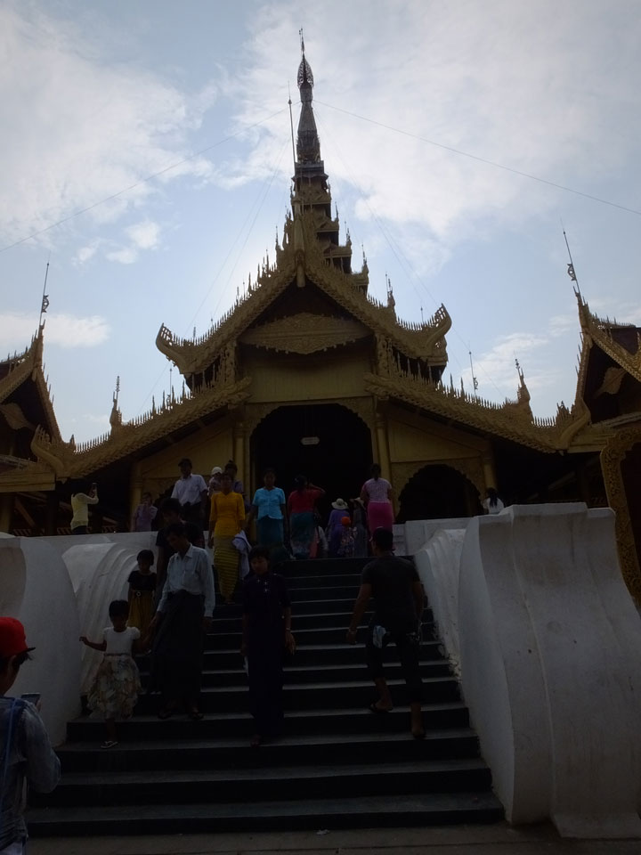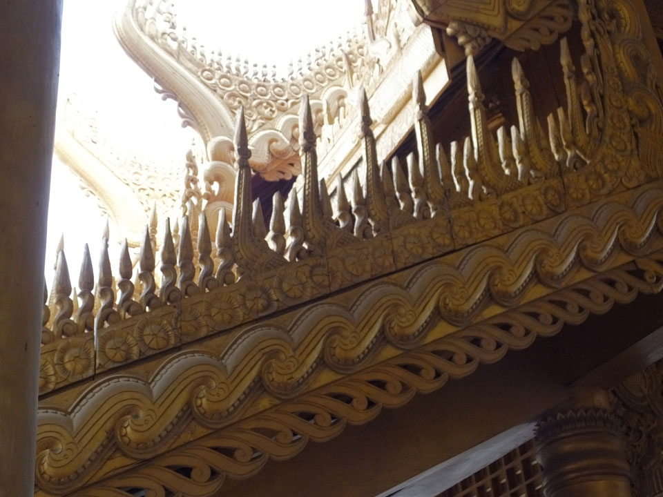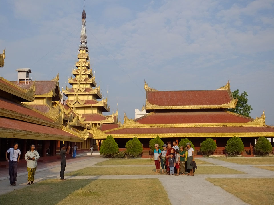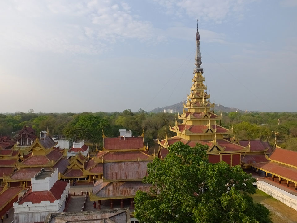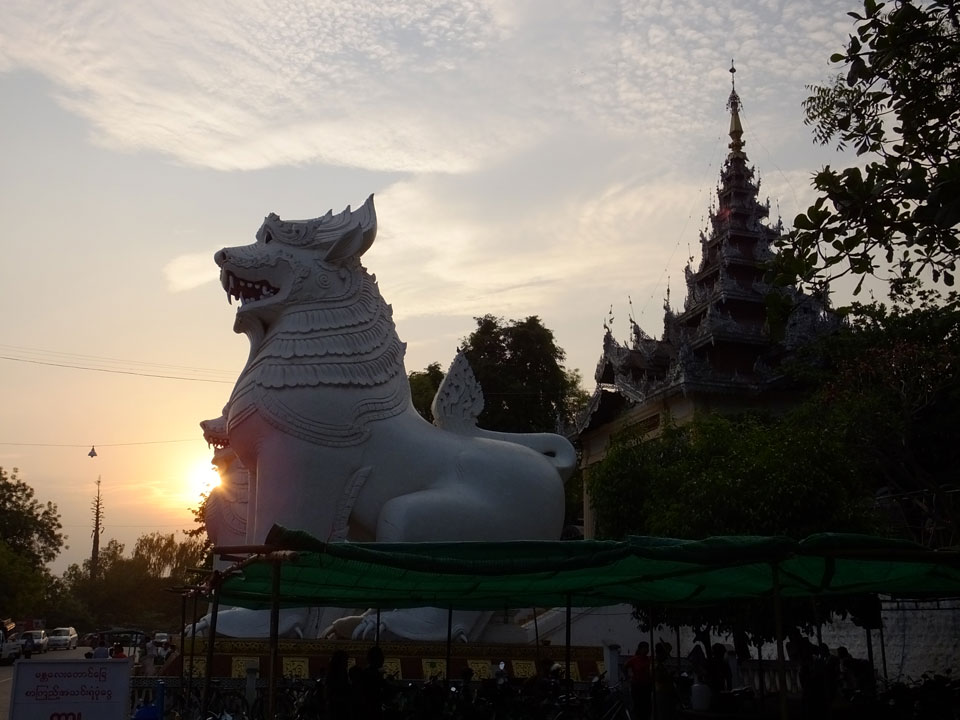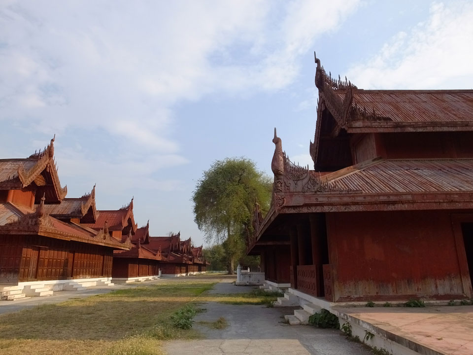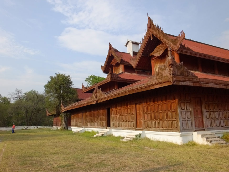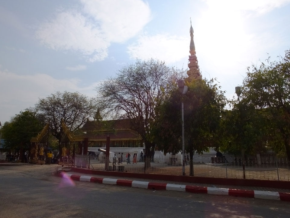 Was man alles aus Holz bauen kann… Viele große und kleine Gebäude sahen nett aus in der Hitze. Ich stieg auch auf den Wachturm hoch, knipste viel. Nach einer Weile ging’s weiter. Über Umwege in der Gegend mit Einblicken in das normale burmesische Leben, kam ich schließlich zum Mandalay Hill. Da fand ich schließlich auch den Eingang zu dem Treppen Richtung Sonnenuntergangs-Aussicht. Für 200 stellte ich mein Rad ab, 200 meine Flip-Flops. Inzwischen war ch super knapp bei Kasse. Die 30.000 vom Mittwoch waren nun fast verbraucht. Ich musste laufen, Angebote zum Mopedtransport gab’s auch.