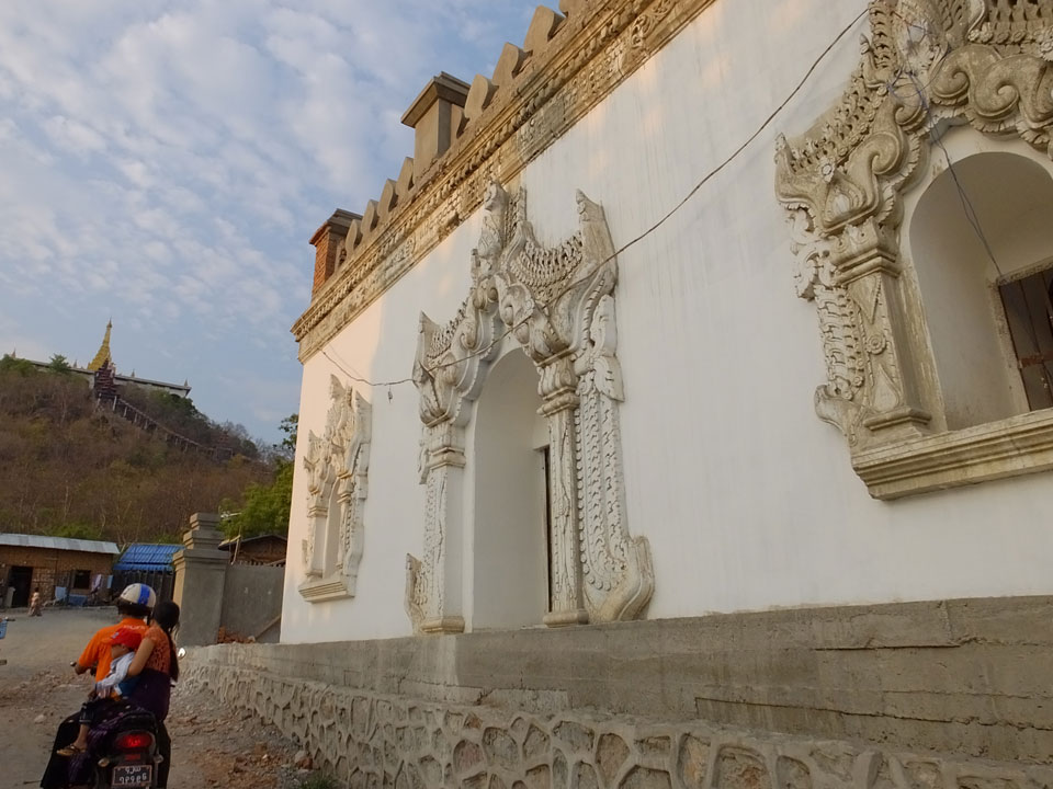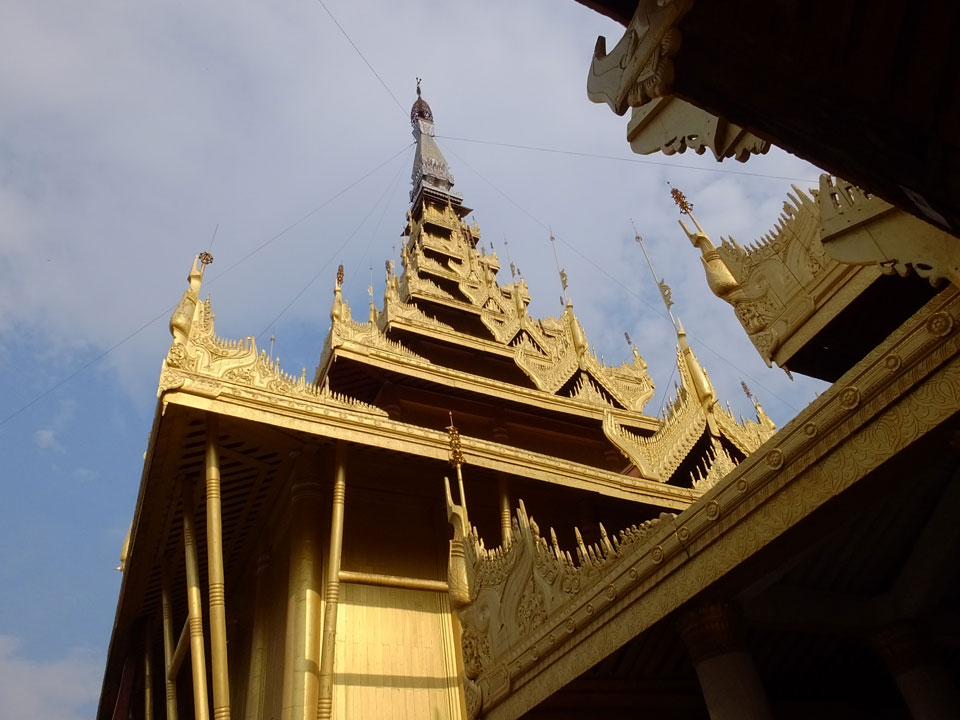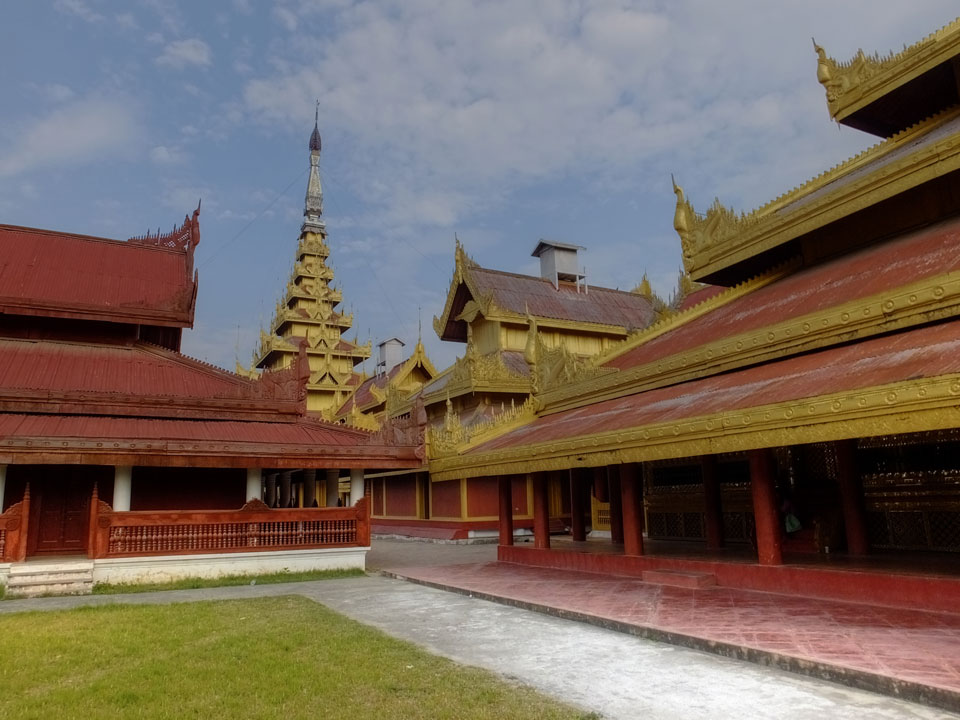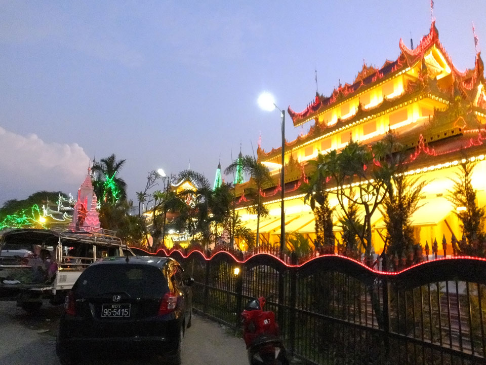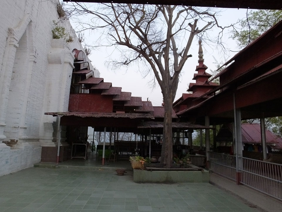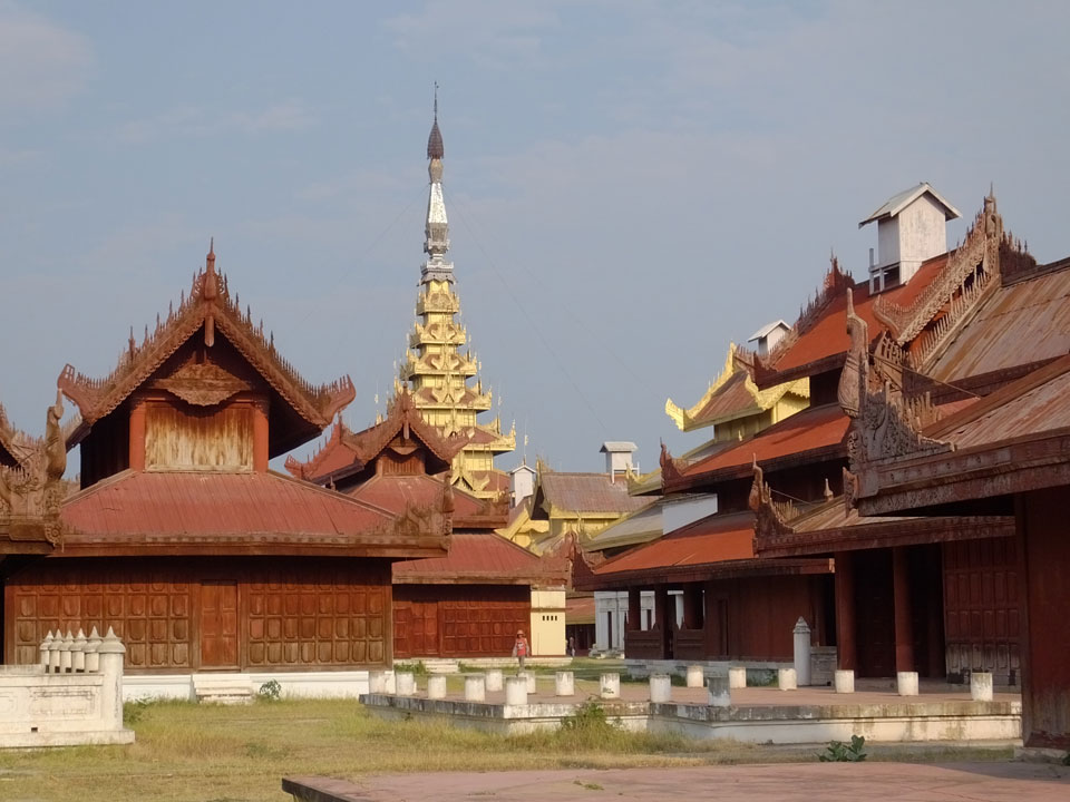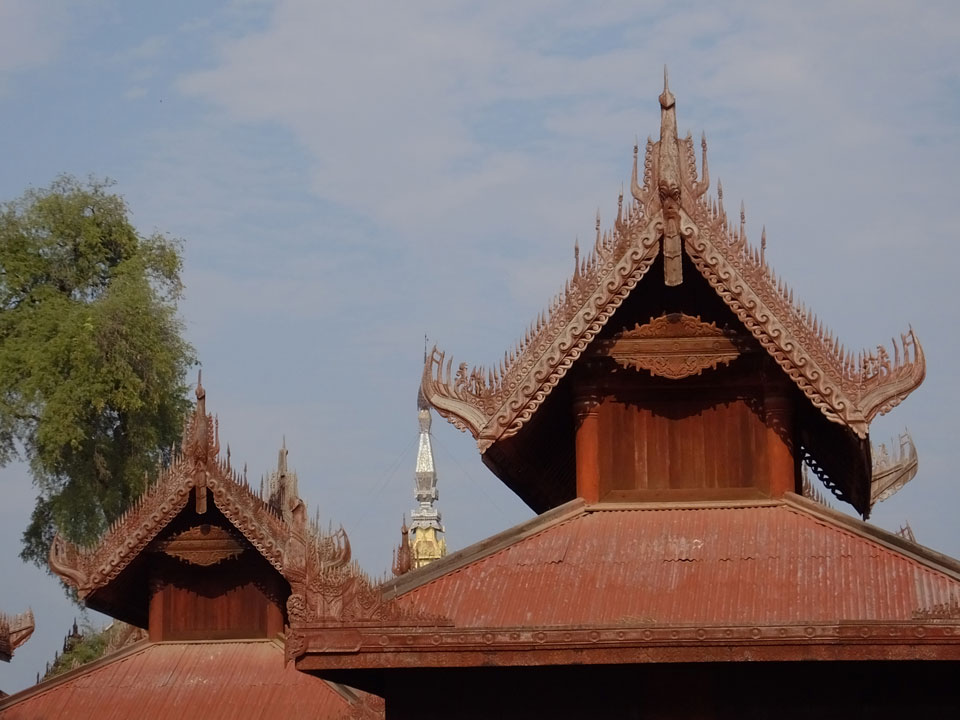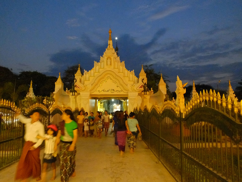 Was man alles aus Holz bauen kann… Viele große und kleine Gebäude sahen nett aus in der Hitze. Ich stieg auch auf den Wachturm hoch, knipste viel. Nach einer Weile ging’s weiter. Über Umwege in der Gegend mit Einblicken in das normale burmesische Leben, kam ich schließlich zum Mandalay Hill. Da fand ich schließlich auch den Eingang zu dem Treppen Richtung Sonnenuntergangs-Aussicht. Für 200 stellte ich mein Rad ab, 200 meine Flip-Flops. Inzwischen war ch super knapp bei Kasse. Die 30.000 vom Mittwoch waren nun fast verbraucht. Ich musste laufen, Angebote zum Mopedtransport gab’s auch.