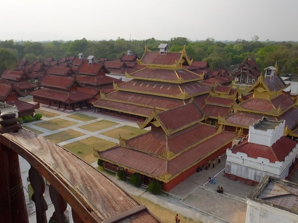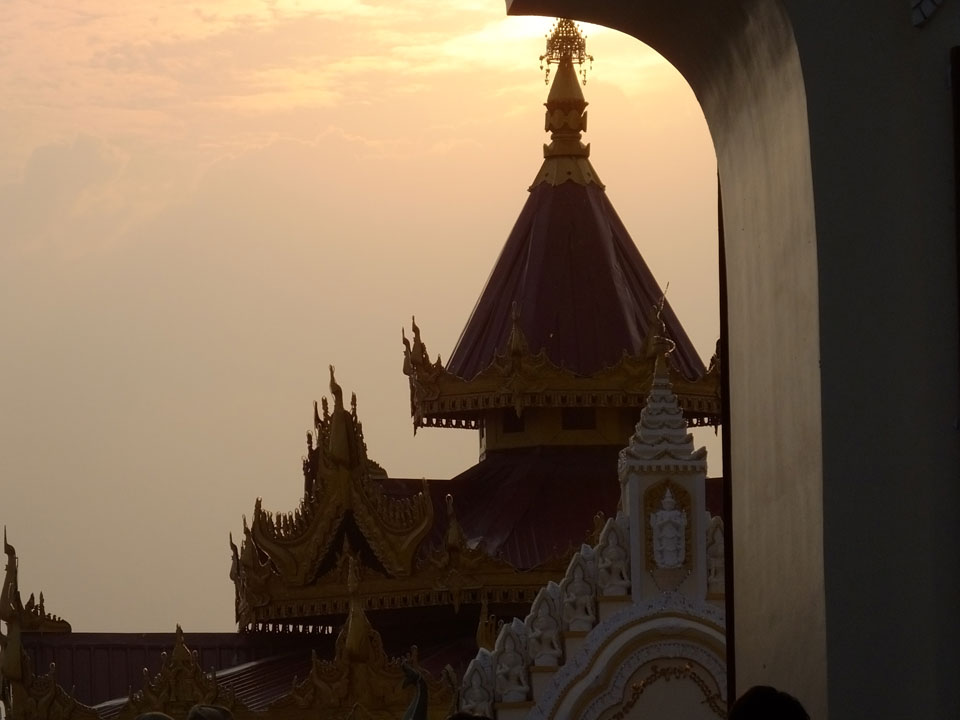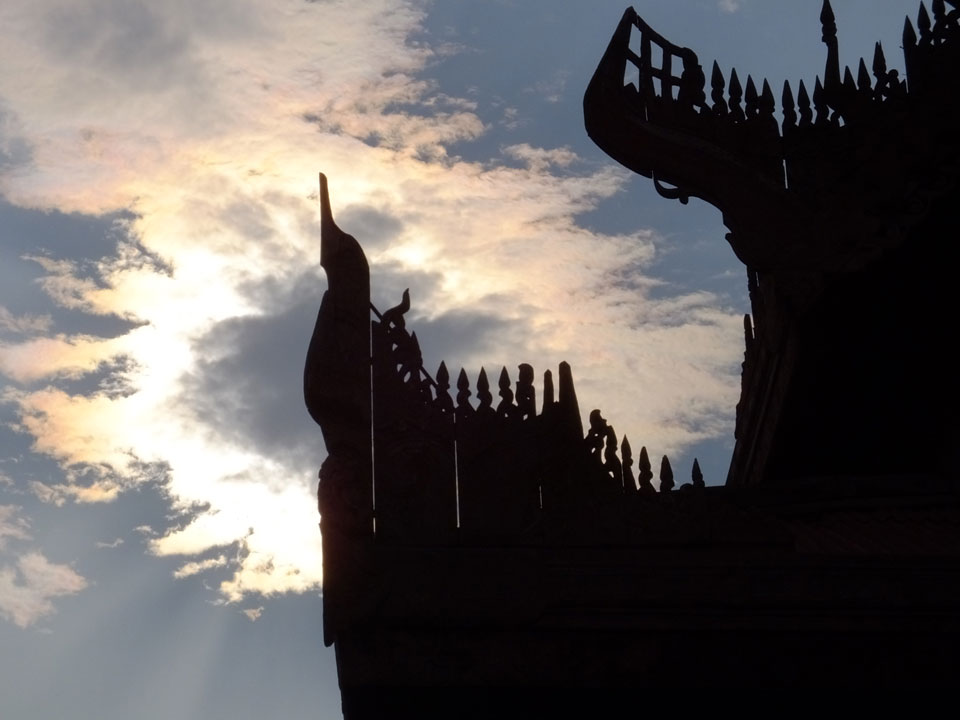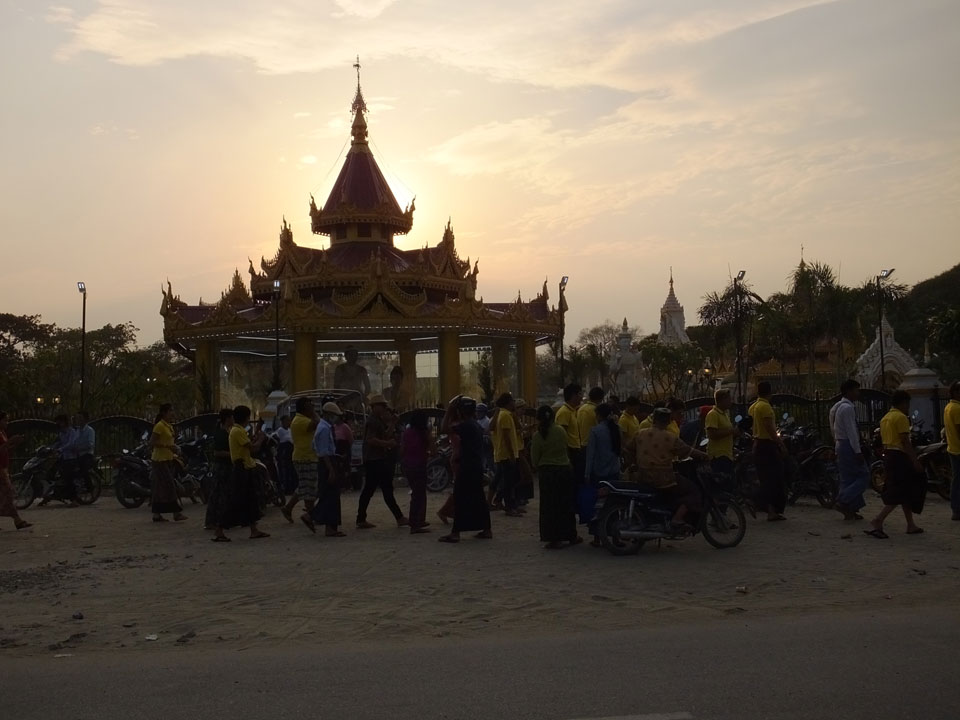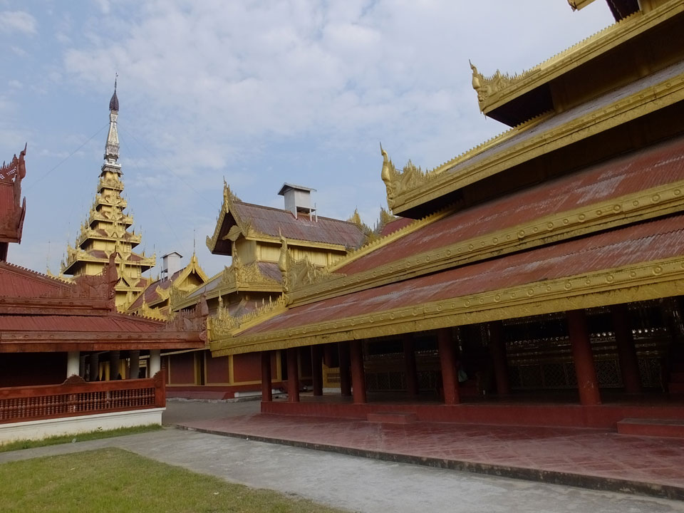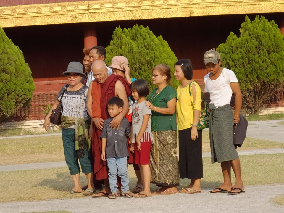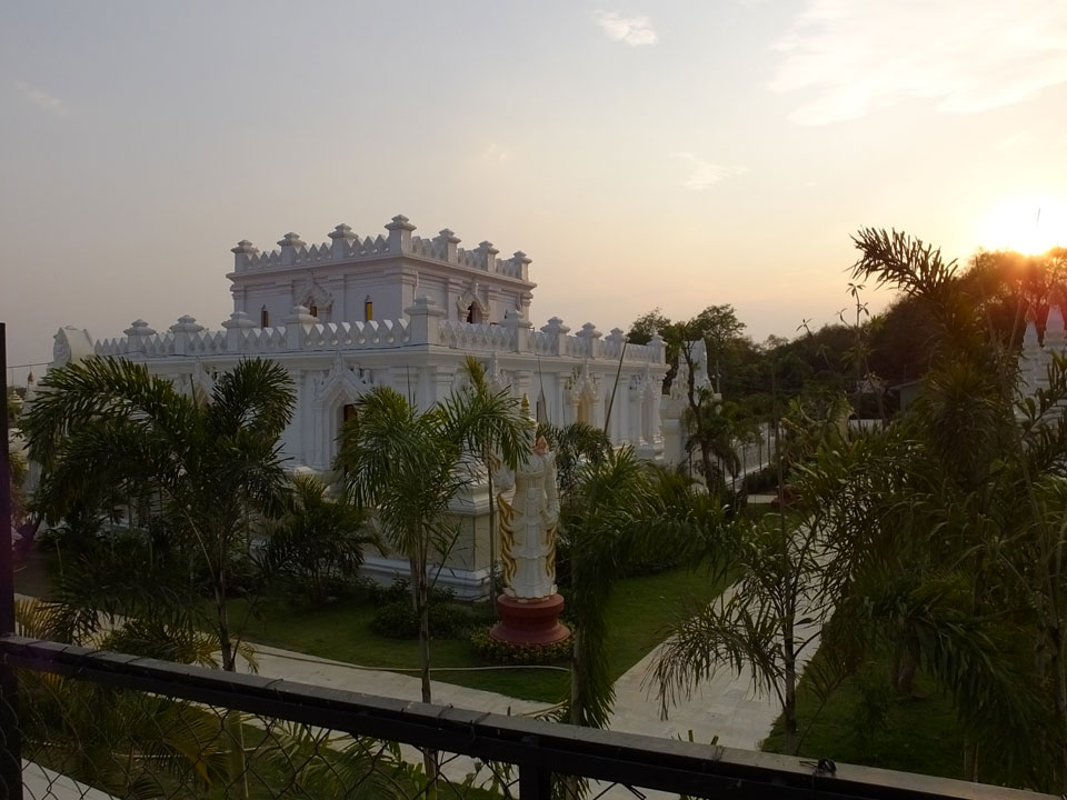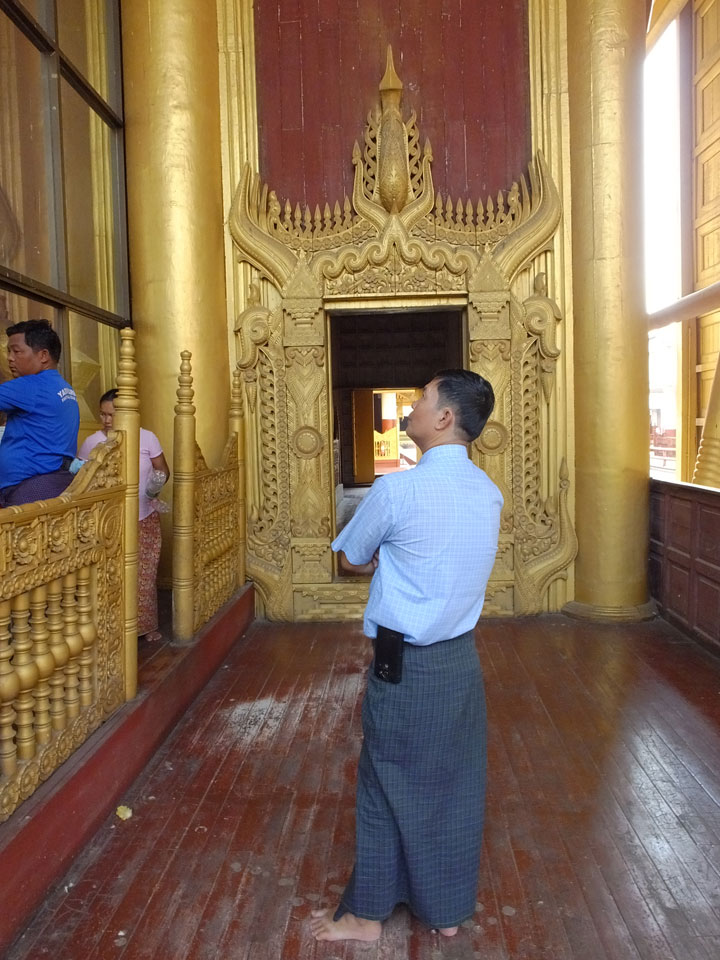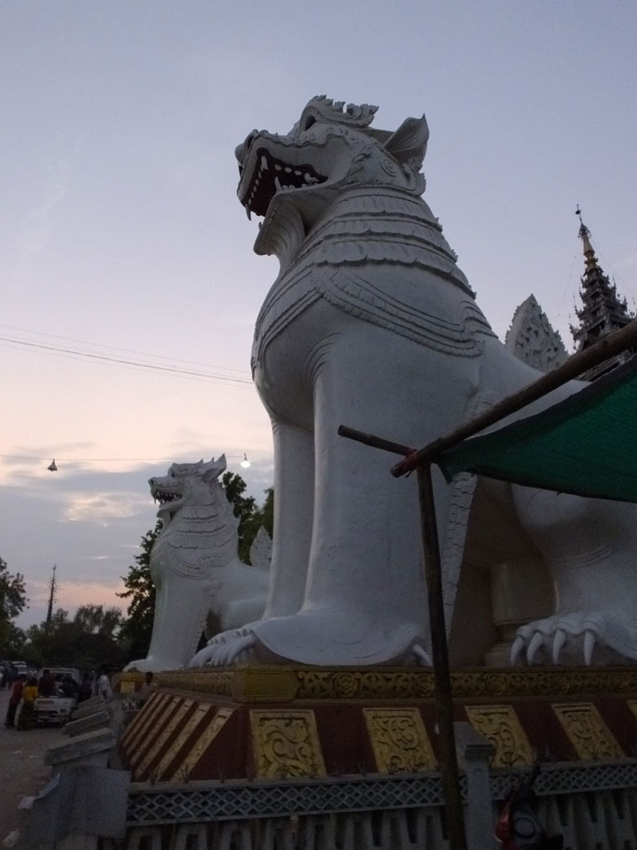 Was man alles aus Holz bauen kann… Viele große und kleine Gebäude sahen nett aus in der Hitze. Ich stieg auch auf den Wachturm hoch, knipste viel. Nach einer Weile ging’s weiter. Über Umwege in der Gegend mit Einblicken in das normale burmesische Leben, kam ich schließlich zum Mandalay Hill. Da fand ich schließlich auch den Eingang zu dem Treppen Richtung Sonnenuntergangs-Aussicht. Für 200 stellte ich mein Rad ab, 200 meine Flip-Flops. Inzwischen war ch super knapp bei Kasse. Die 30.000 vom Mittwoch waren nun fast verbraucht. Ich musste laufen, Angebote zum Mopedtransport gab’s auch.