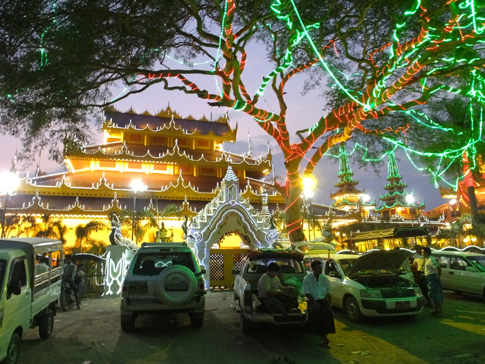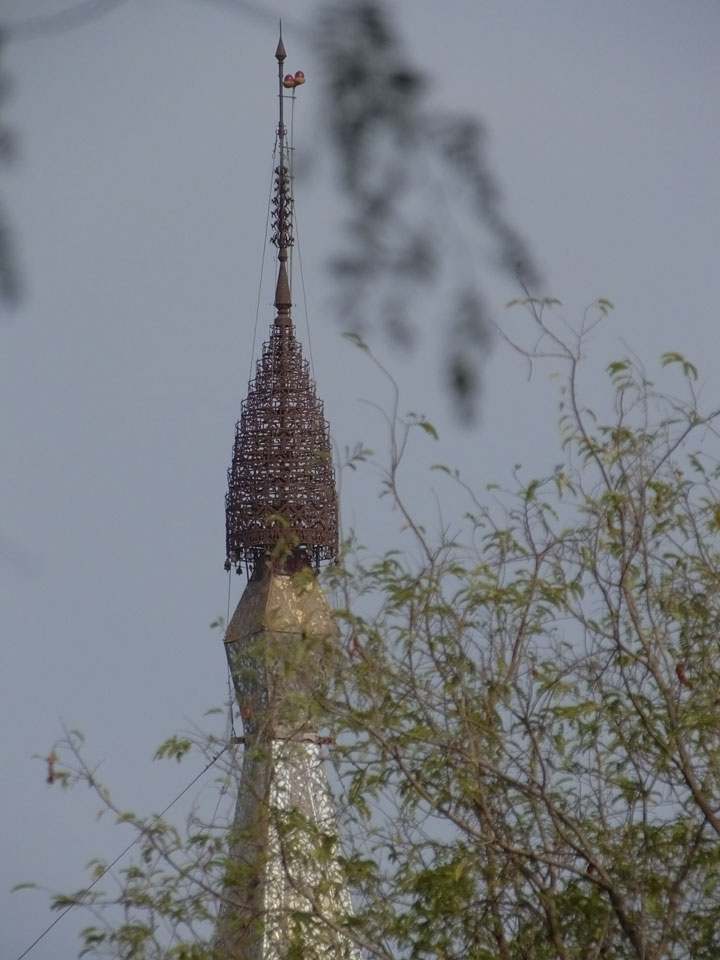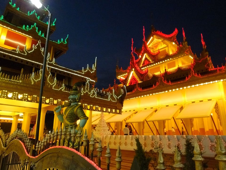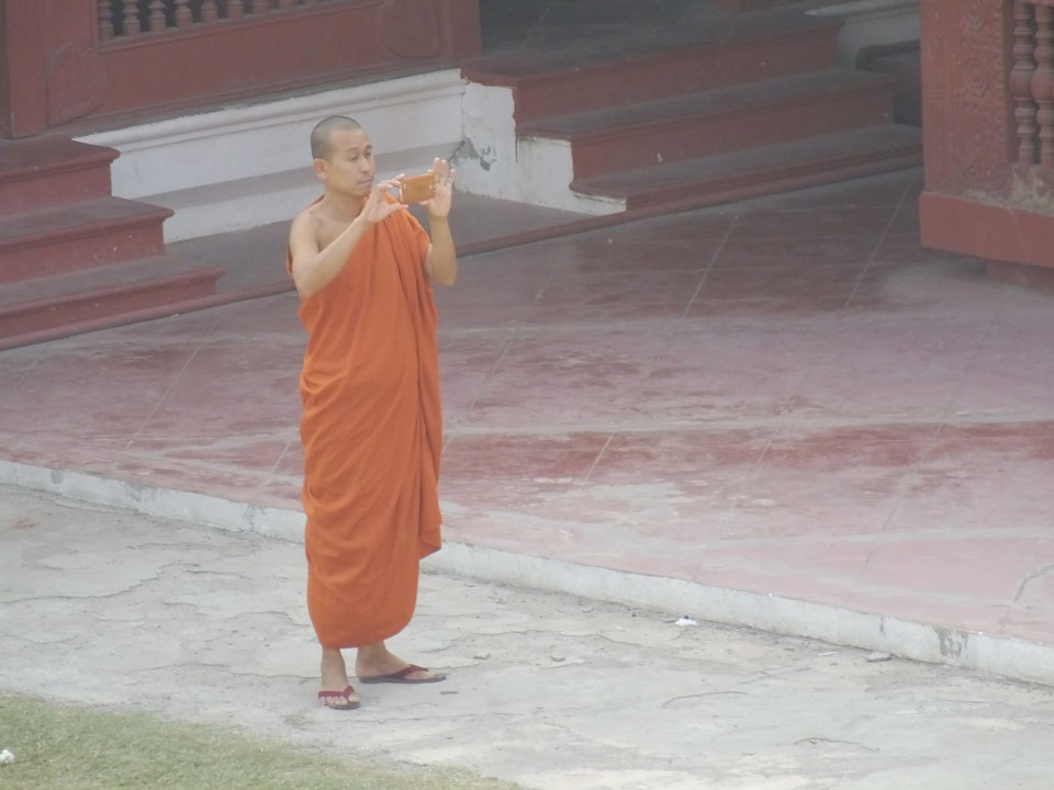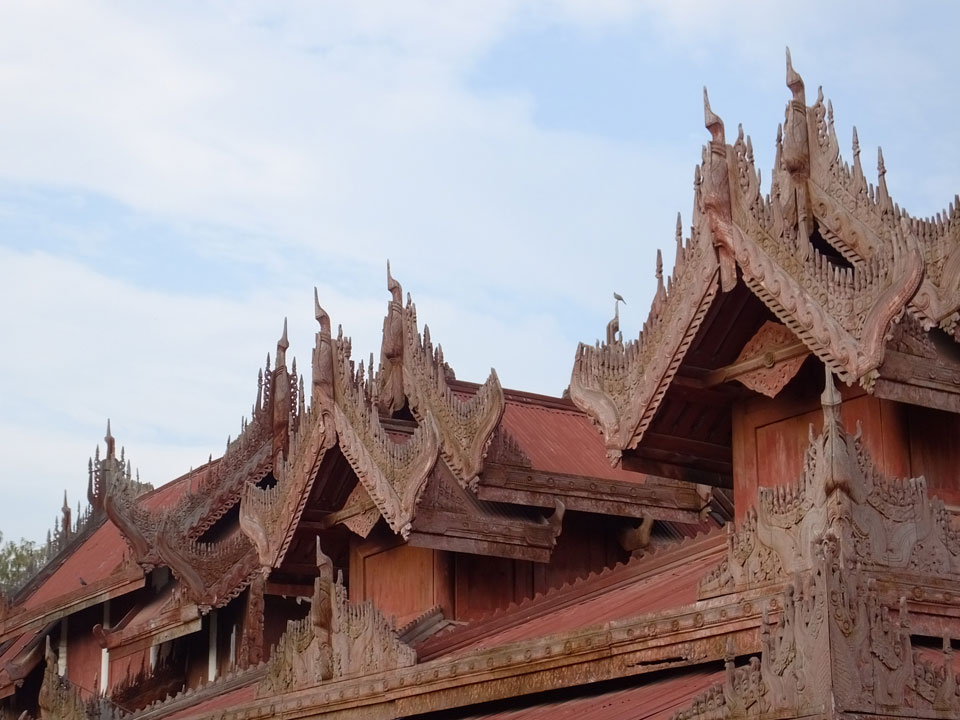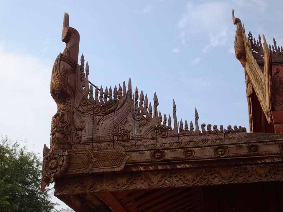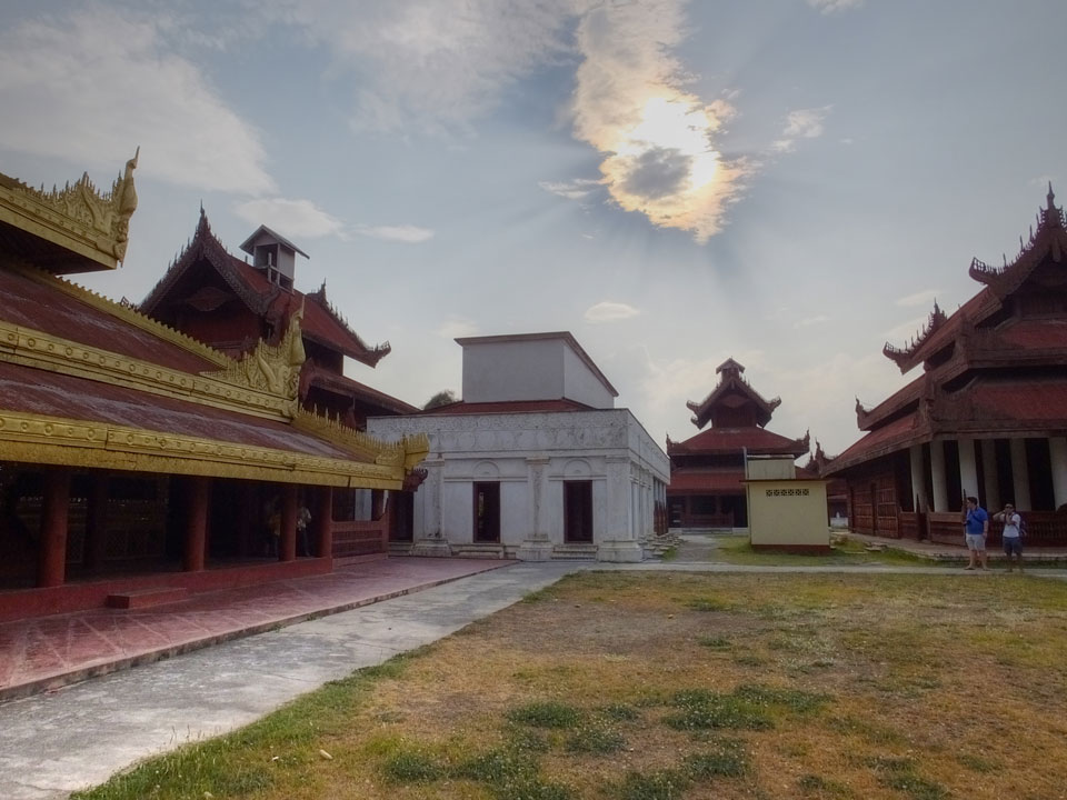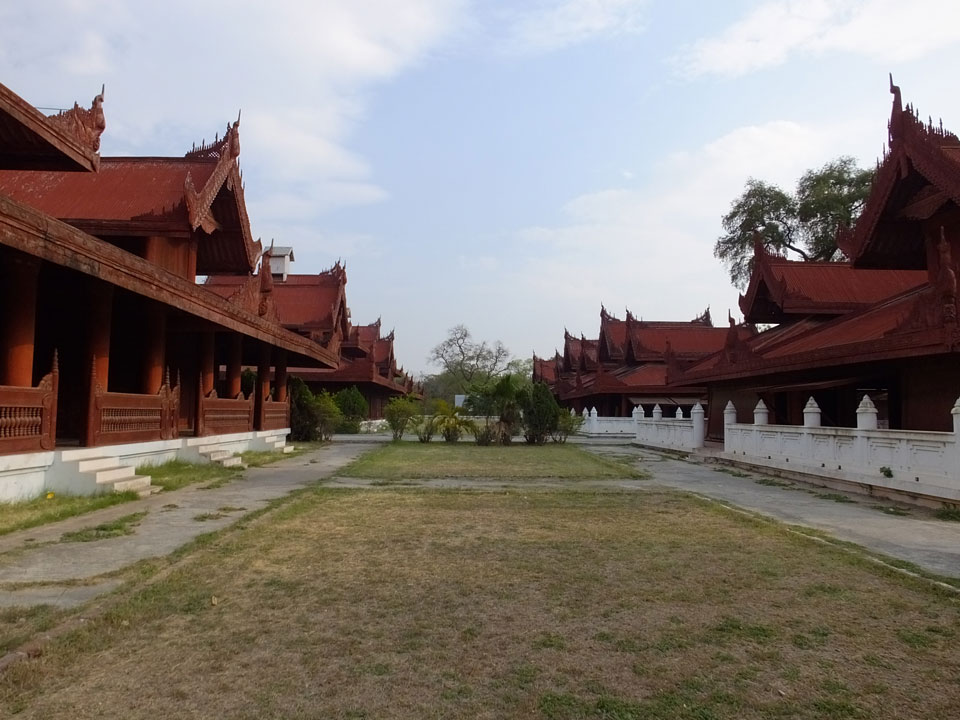 Was man alles aus Holz bauen kann… Viele große und kleine Gebäude sahen nett aus in der Hitze. Ich stieg auch auf den Wachturm hoch, knipste viel. Nach einer Weile ging’s weiter. Über Umwege in der Gegend mit Einblicken in das normale burmesische Leben, kam ich schließlich zum Mandalay Hill. Da fand ich schließlich auch den Eingang zu dem Treppen Richtung Sonnenuntergangs-Aussicht. Für 200 stellte ich mein Rad ab, 200 meine Flip-Flops. Inzwischen war ch super knapp bei Kasse. Die 30.000 vom Mittwoch waren nun fast verbraucht. Ich musste laufen, Angebote zum Mopedtransport gab’s auch.