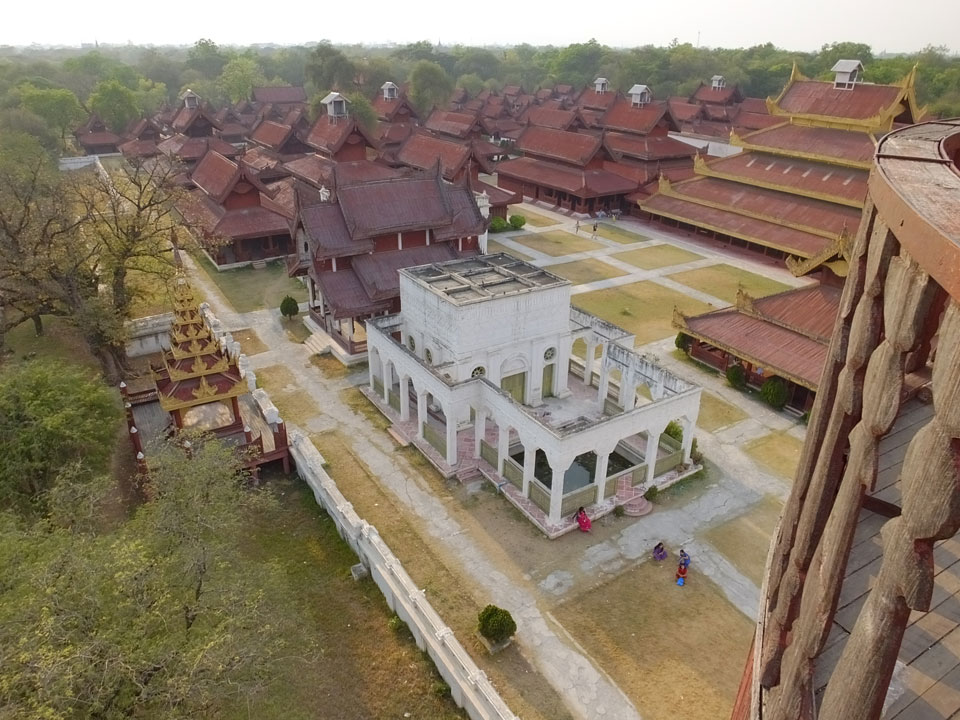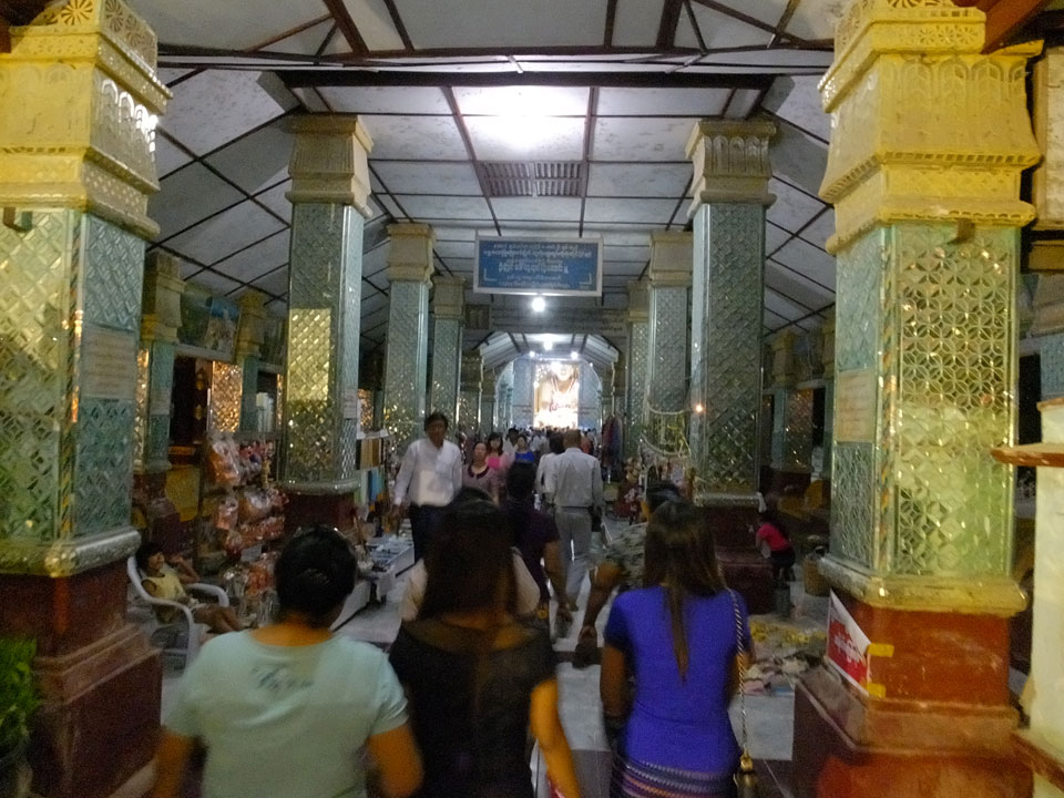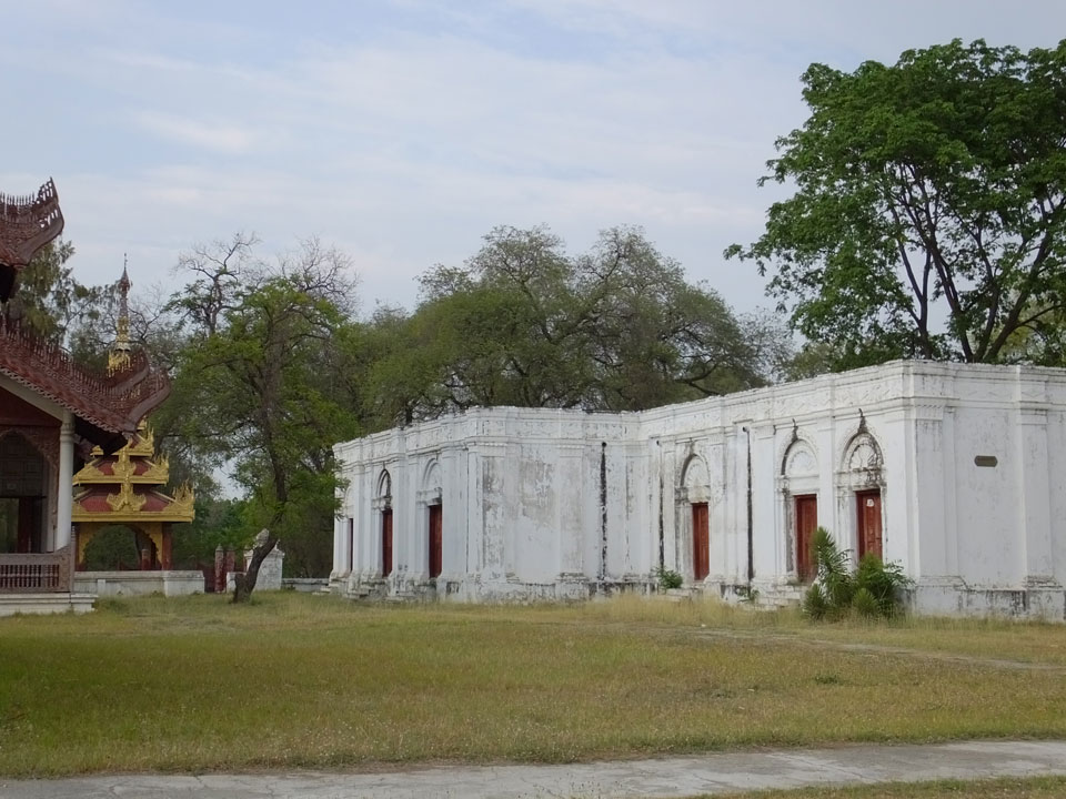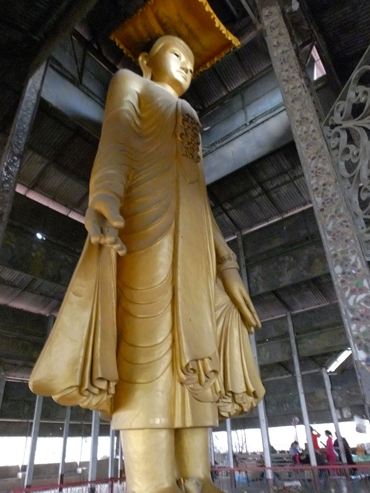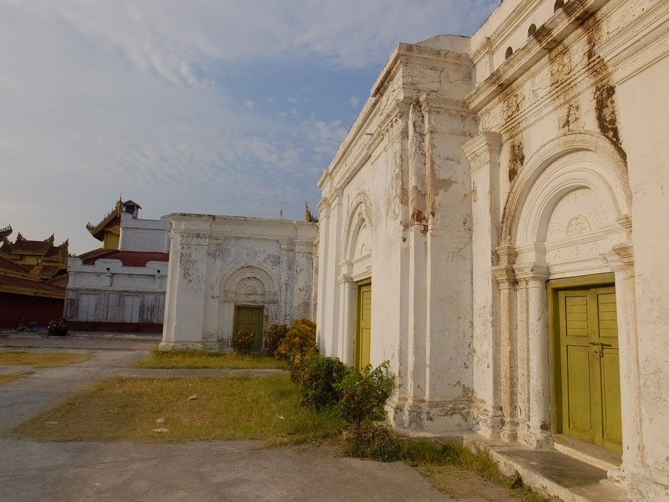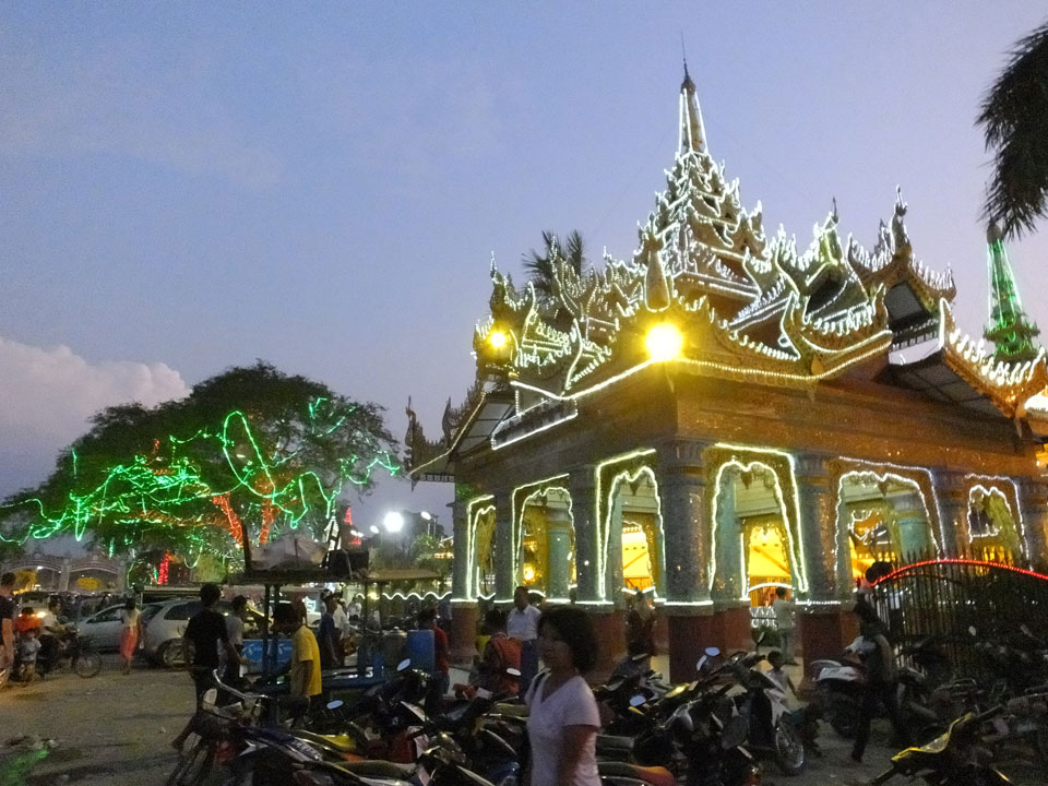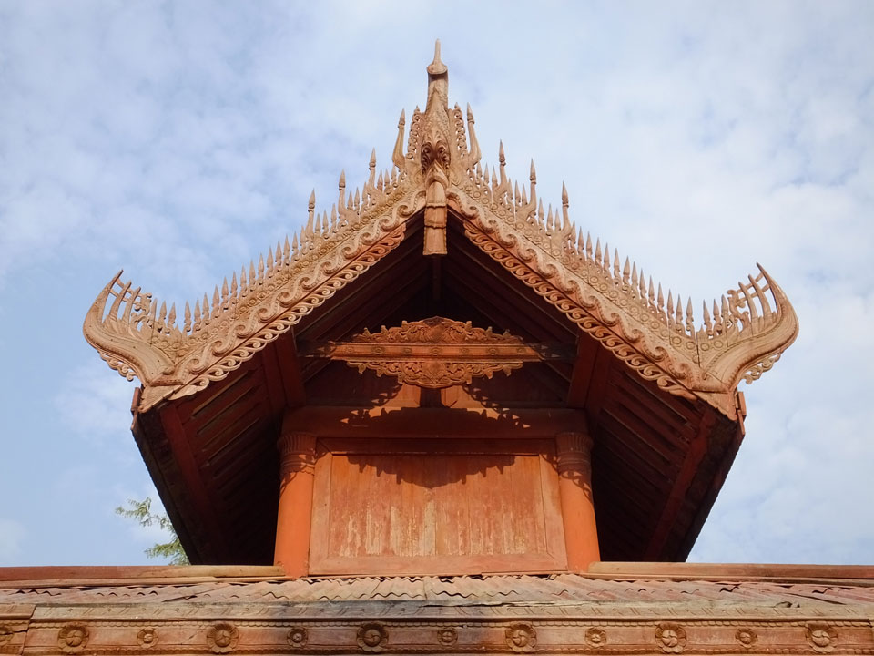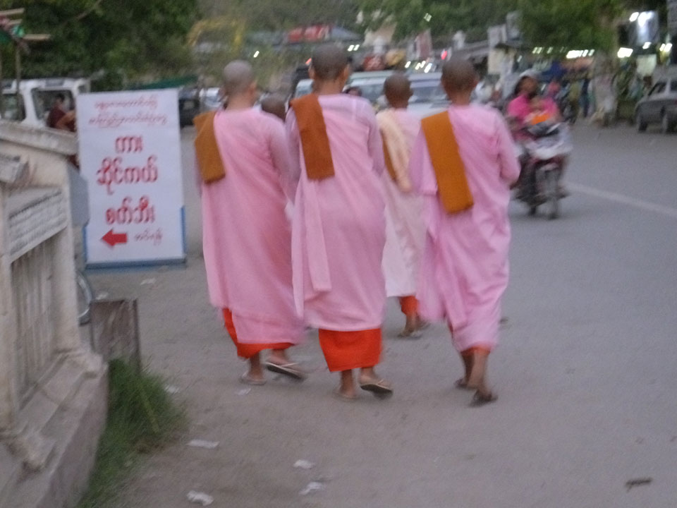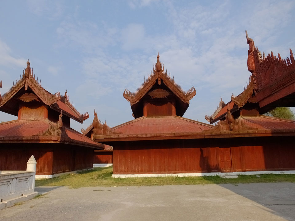 Was man alles aus Holz bauen kann… Viele große und kleine Gebäude sahen nett aus in der Hitze. Ich stieg auch auf den Wachturm hoch, knipste viel. Nach einer Weile ging’s weiter. Über Umwege in der Gegend mit Einblicken in das normale burmesische Leben, kam ich schließlich zum Mandalay Hill. Da fand ich schließlich auch den Eingang zu dem Treppen Richtung Sonnenuntergangs-Aussicht. Für 200 stellte ich mein Rad ab, 200 meine Flip-Flops. Inzwischen war ch super knapp bei Kasse. Die 30.000 vom Mittwoch waren nun fast verbraucht. Ich musste laufen, Angebote zum Mopedtransport gab’s auch.