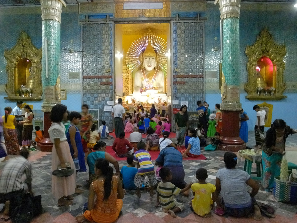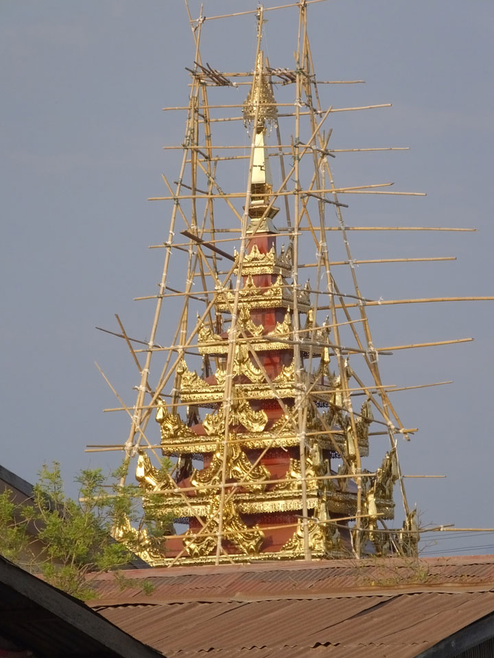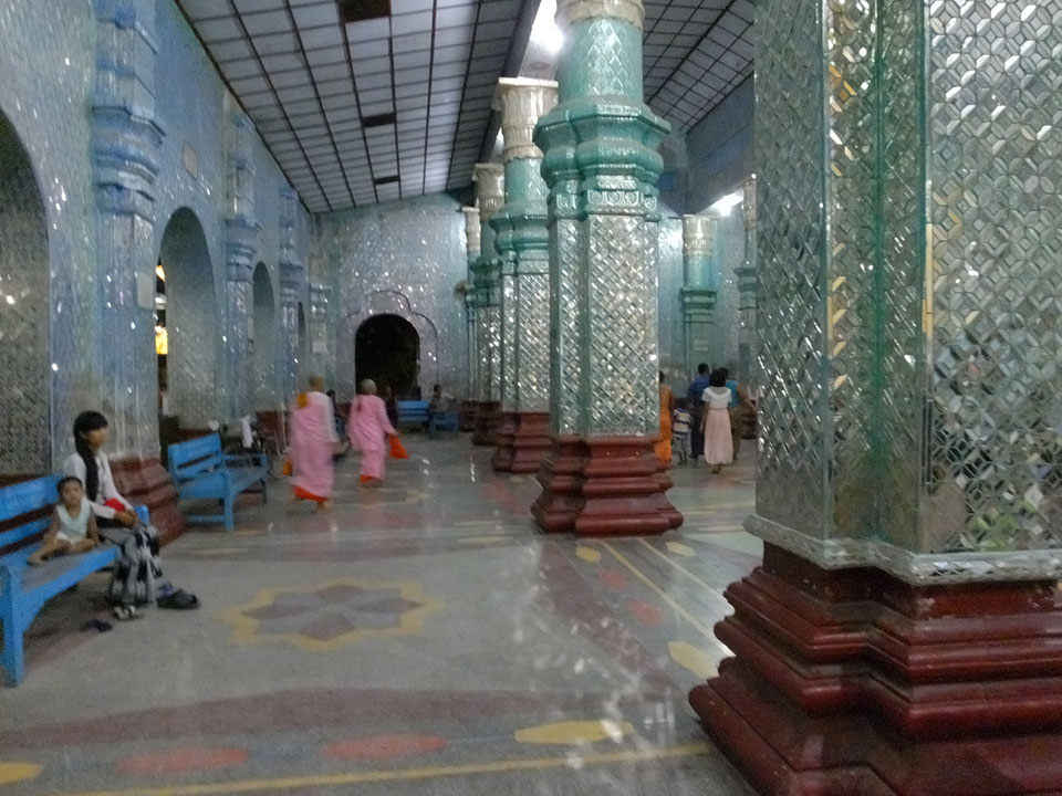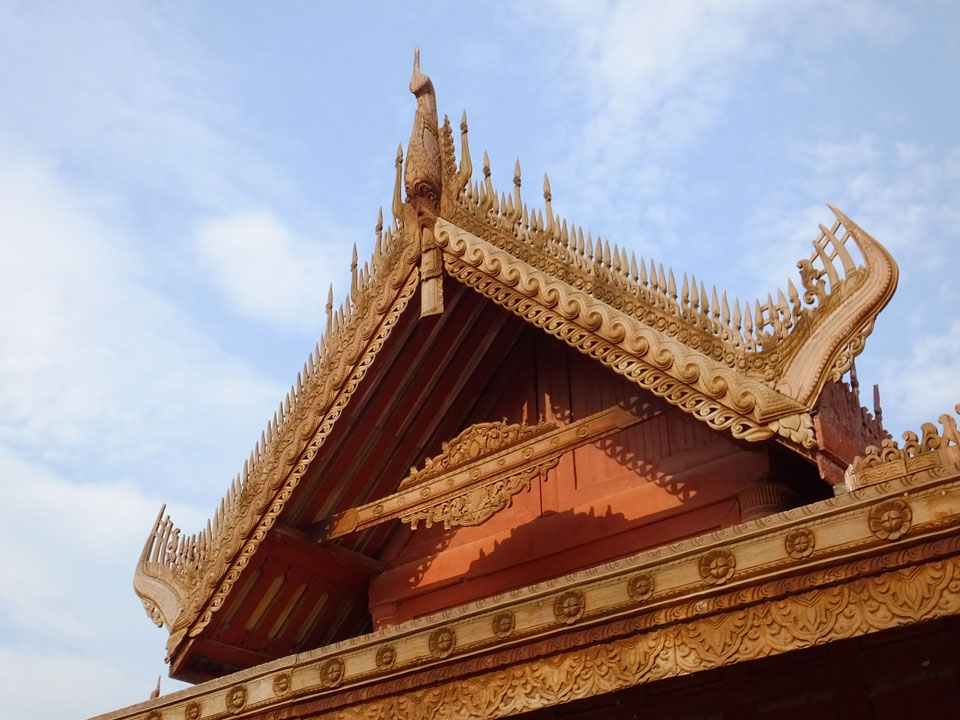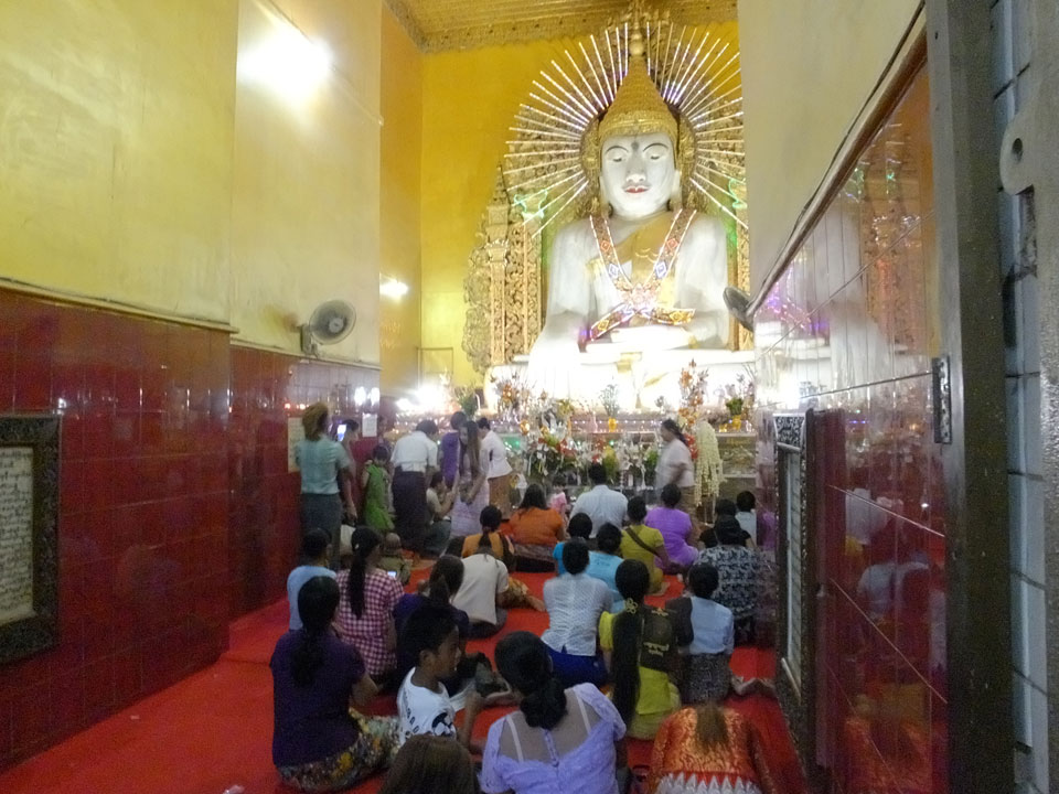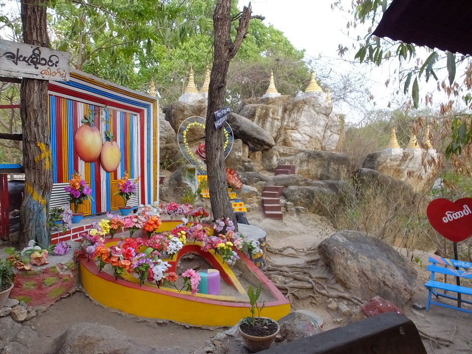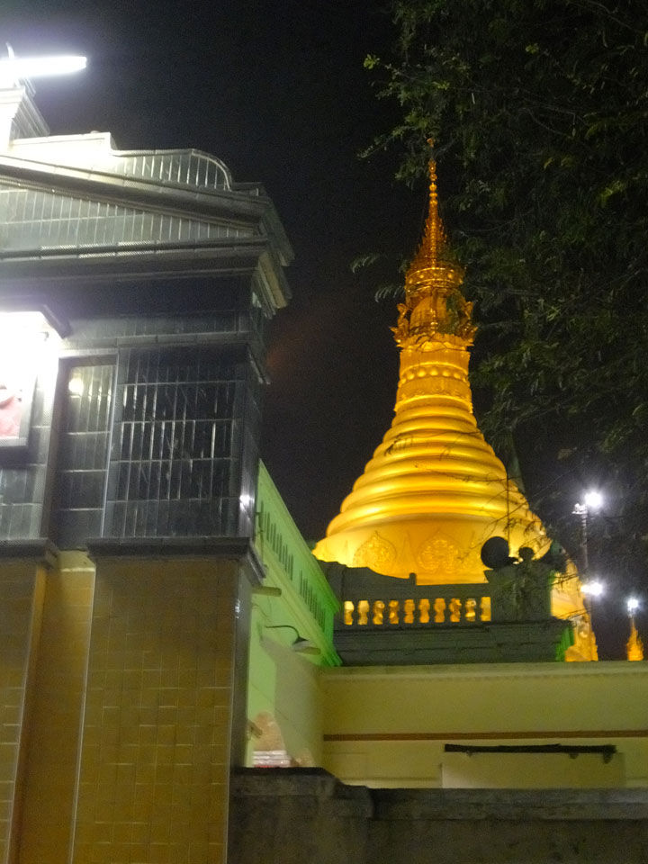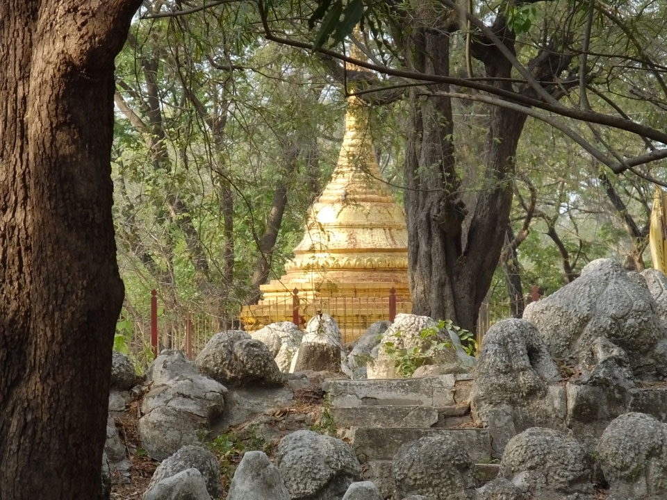 Was man alles aus Holz bauen kann… Viele große und kleine Gebäude sahen nett aus in der Hitze. Ich stieg auch auf den Wachturm hoch, knipste viel. Nach einer Weile ging’s weiter. Über Umwege in der Gegend mit Einblicken in das normale burmesische Leben, kam ich schließlich zum Mandalay Hill. Da fand ich schließlich auch den Eingang zu dem Treppen Richtung Sonnenuntergangs-Aussicht. Für 200 stellte ich mein Rad ab, 200 meine Flip-Flops. Inzwischen war ch super knapp bei Kasse. Die 30.000 vom Mittwoch waren nun fast verbraucht. Ich musste laufen, Angebote zum Mopedtransport gab’s auch.