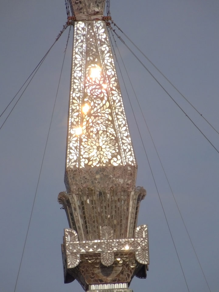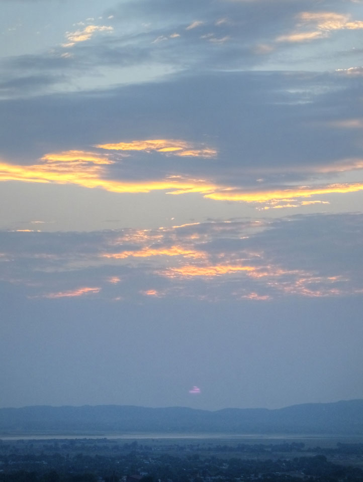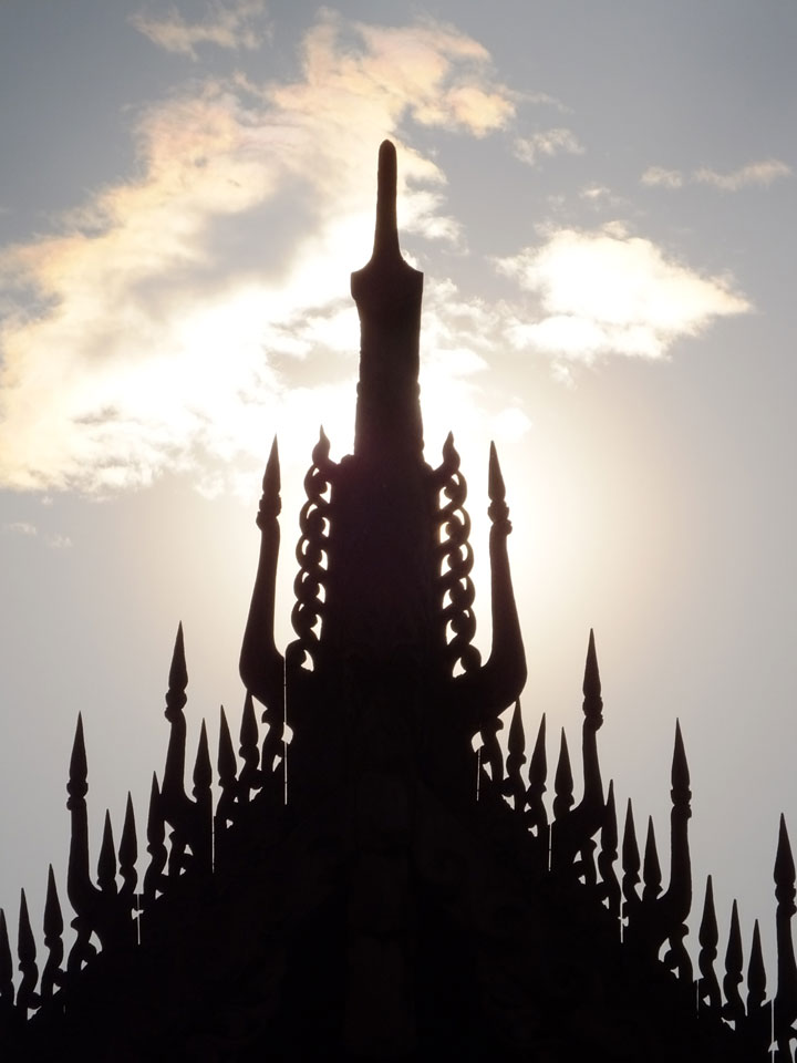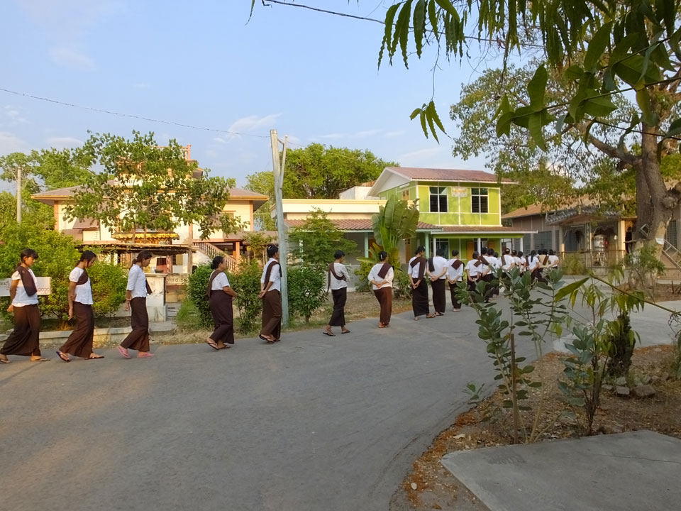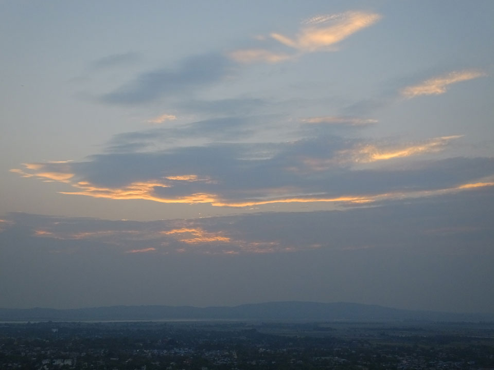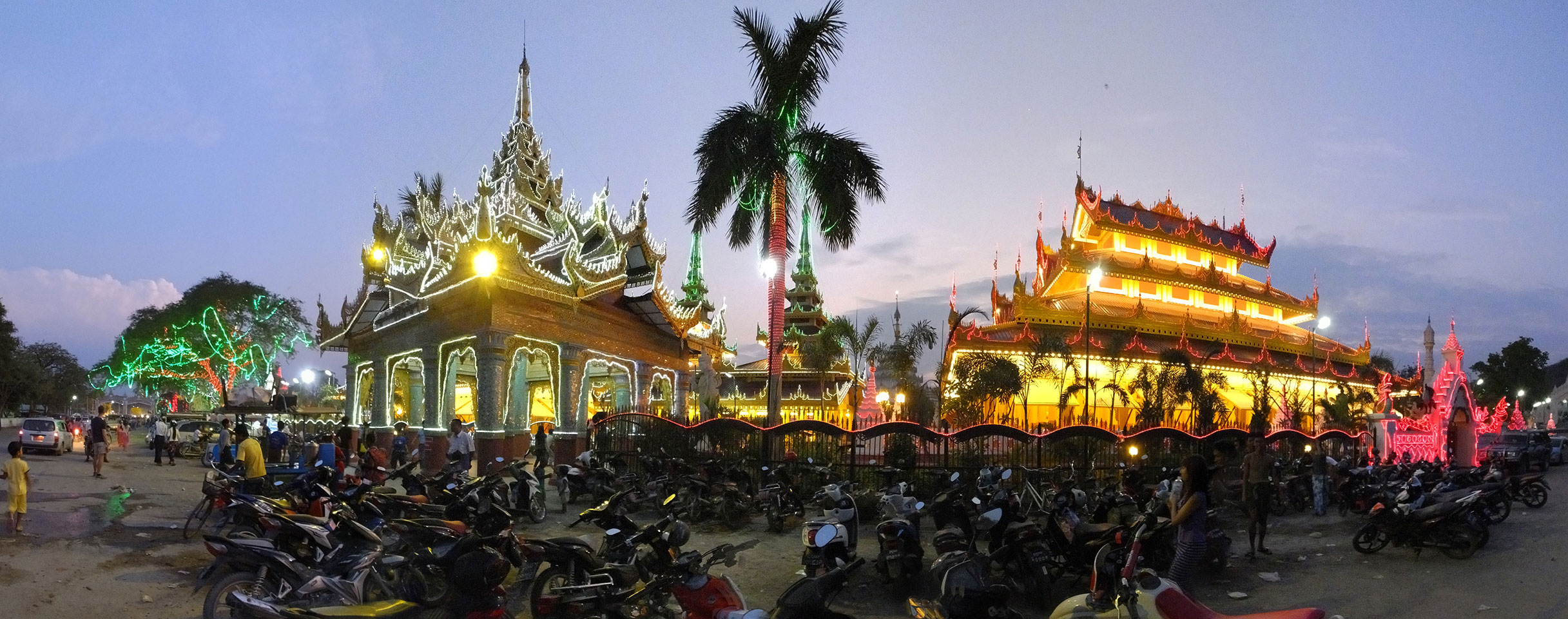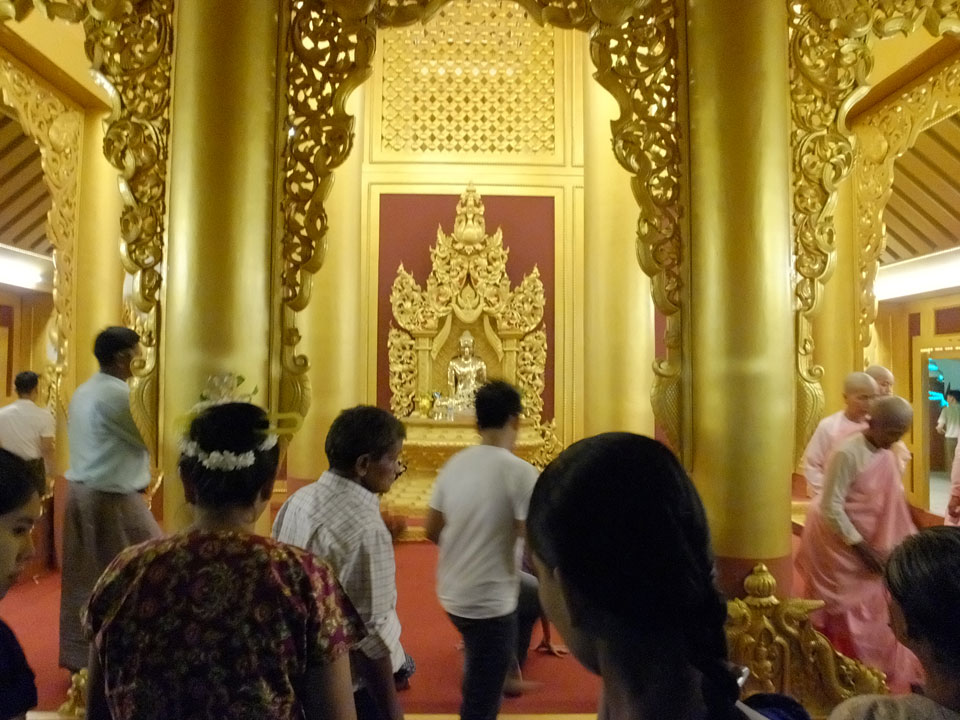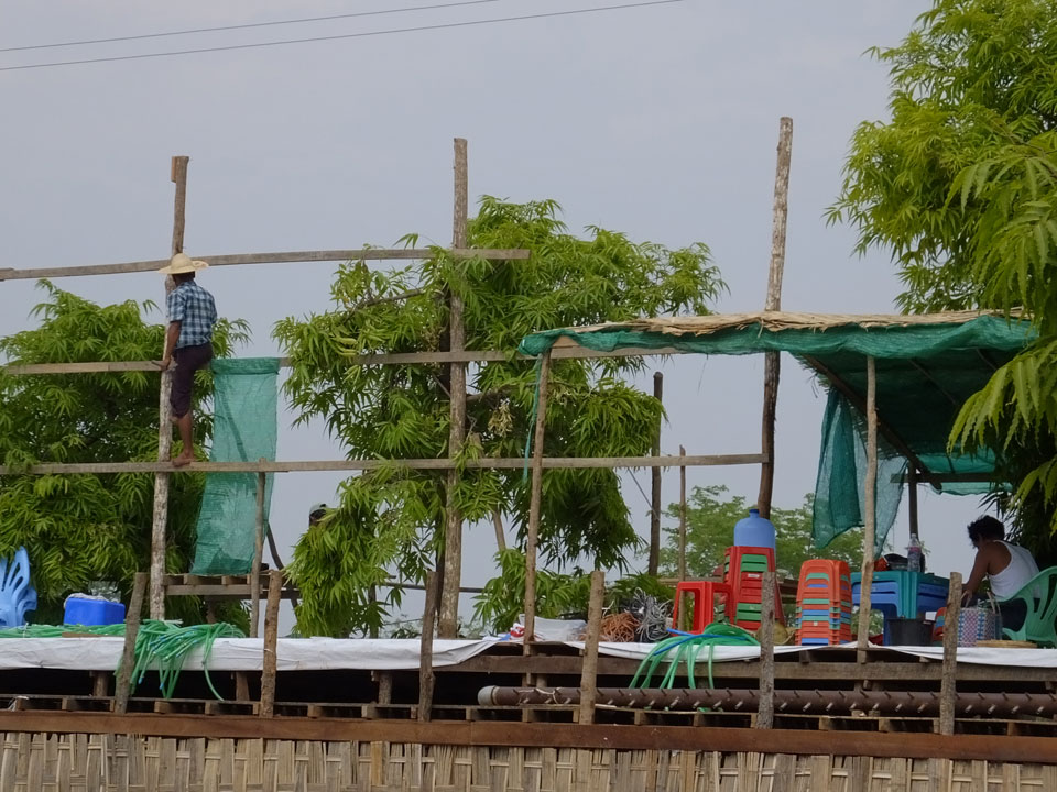 Was man alles aus Holz bauen kann… Viele große und kleine Gebäude sahen nett aus in der Hitze. Ich stieg auch auf den Wachturm hoch, knipste viel. Nach einer Weile ging’s weiter. Über Umwege in der Gegend mit Einblicken in das normale burmesische Leben, kam ich schließlich zum Mandalay Hill. Da fand ich schließlich auch den Eingang zu dem Treppen Richtung Sonnenuntergangs-Aussicht. Für 200 stellte ich mein Rad ab, 200 meine Flip-Flops. Inzwischen war ch super knapp bei Kasse. Die 30.000 vom Mittwoch waren nun fast verbraucht. Ich musste laufen, Angebote zum Mopedtransport gab’s auch.