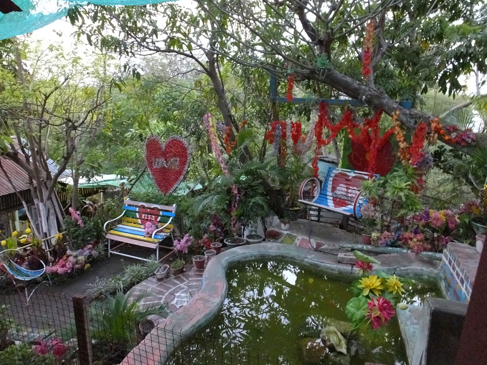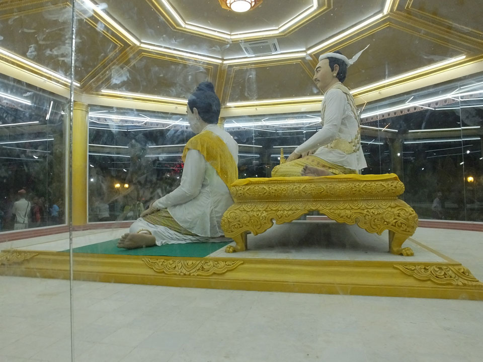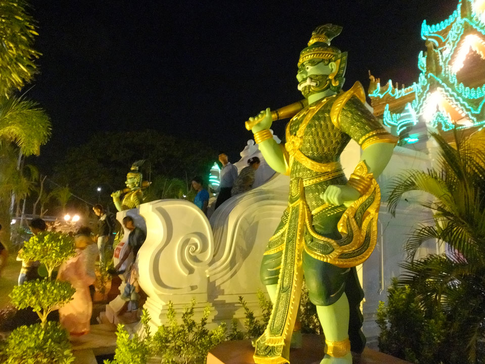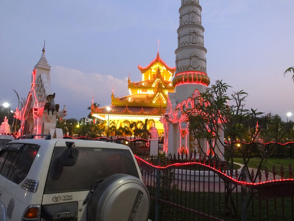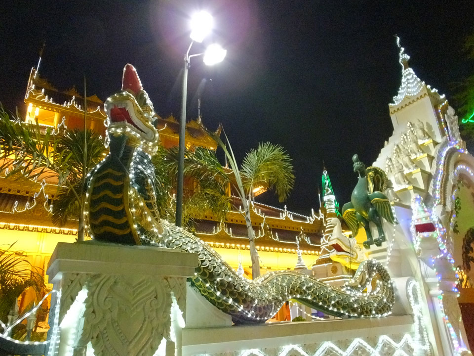 Wieder runter vom Hügel hatte ich meine Schuhe und Drahtesel wieder eingesammelt. In einem Tempelpark, der mehr nach Vergnügungspark aussah, flackerten LED-Schnüre an den Gebäuden. ICh schaute mir das auch an, viele Buddhas, viel Glitzer – Bling bling.