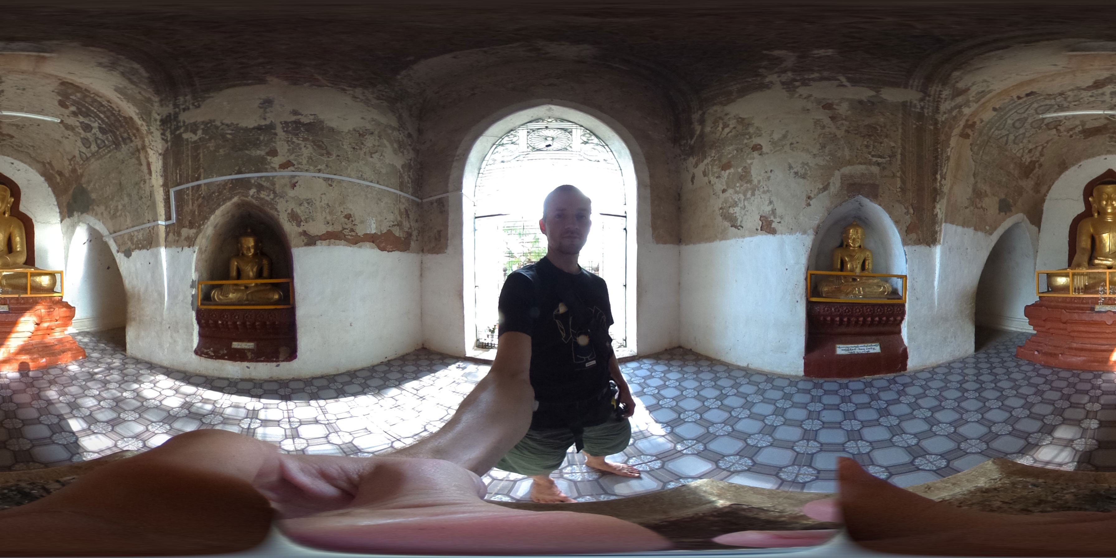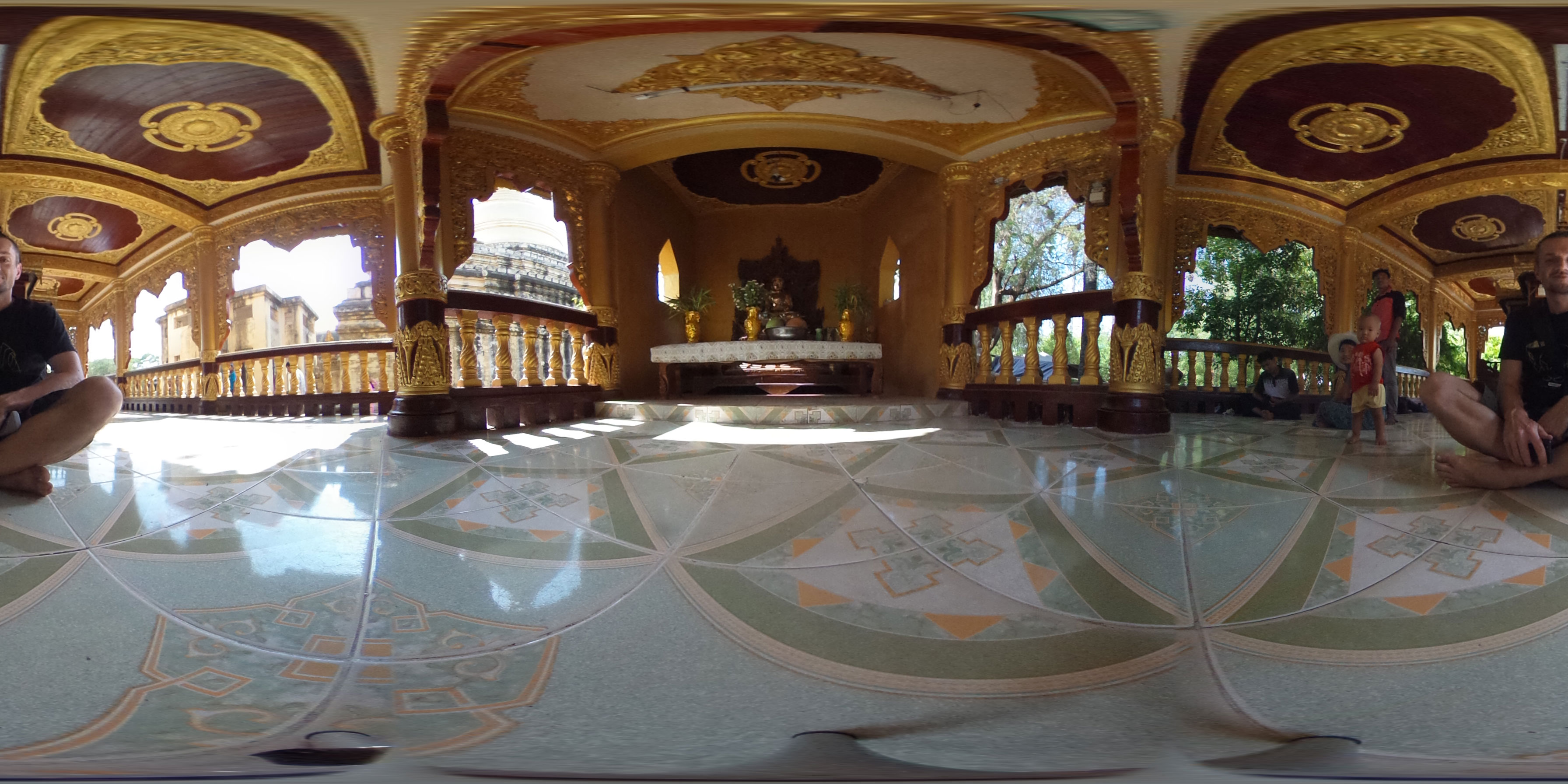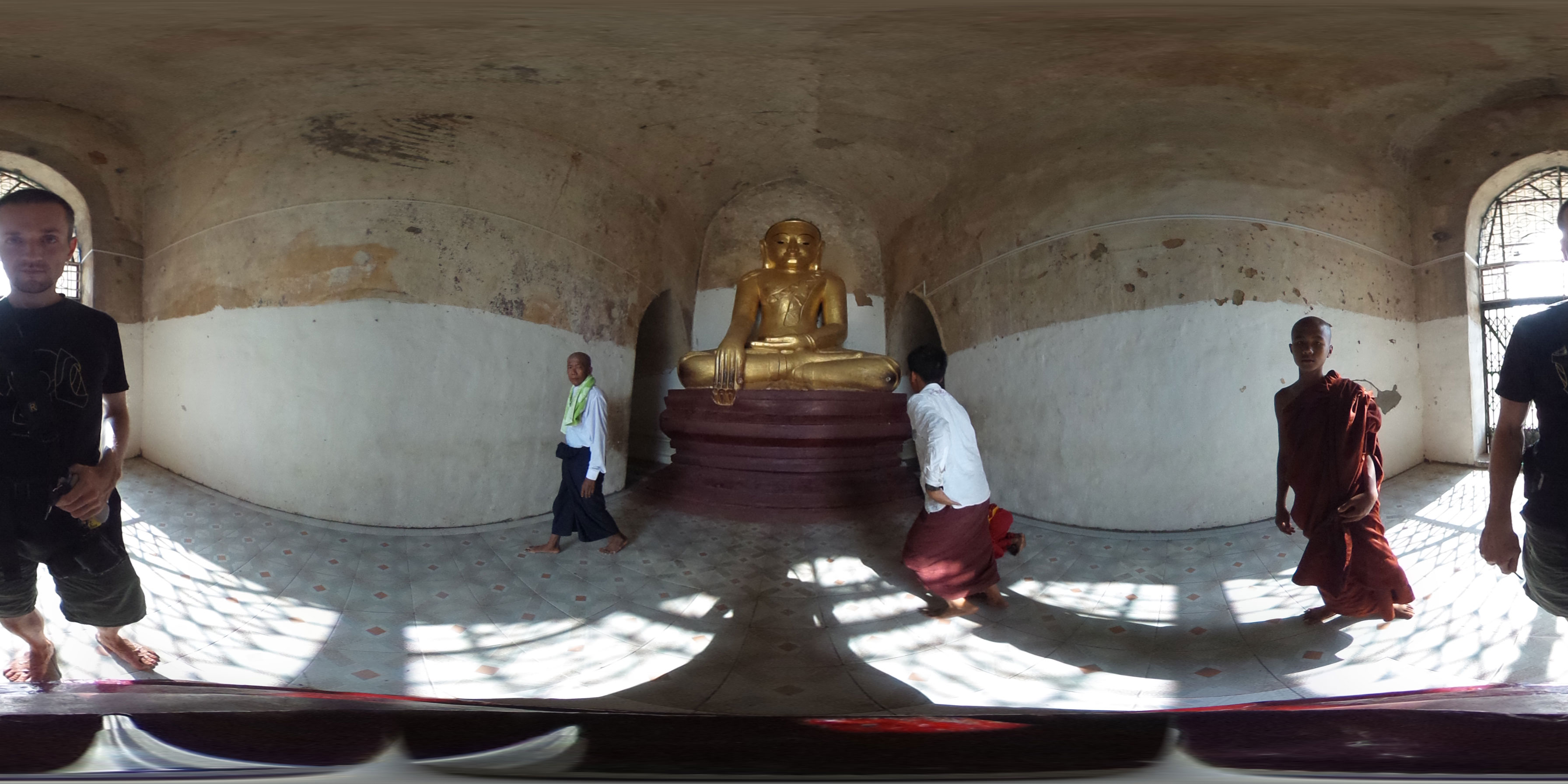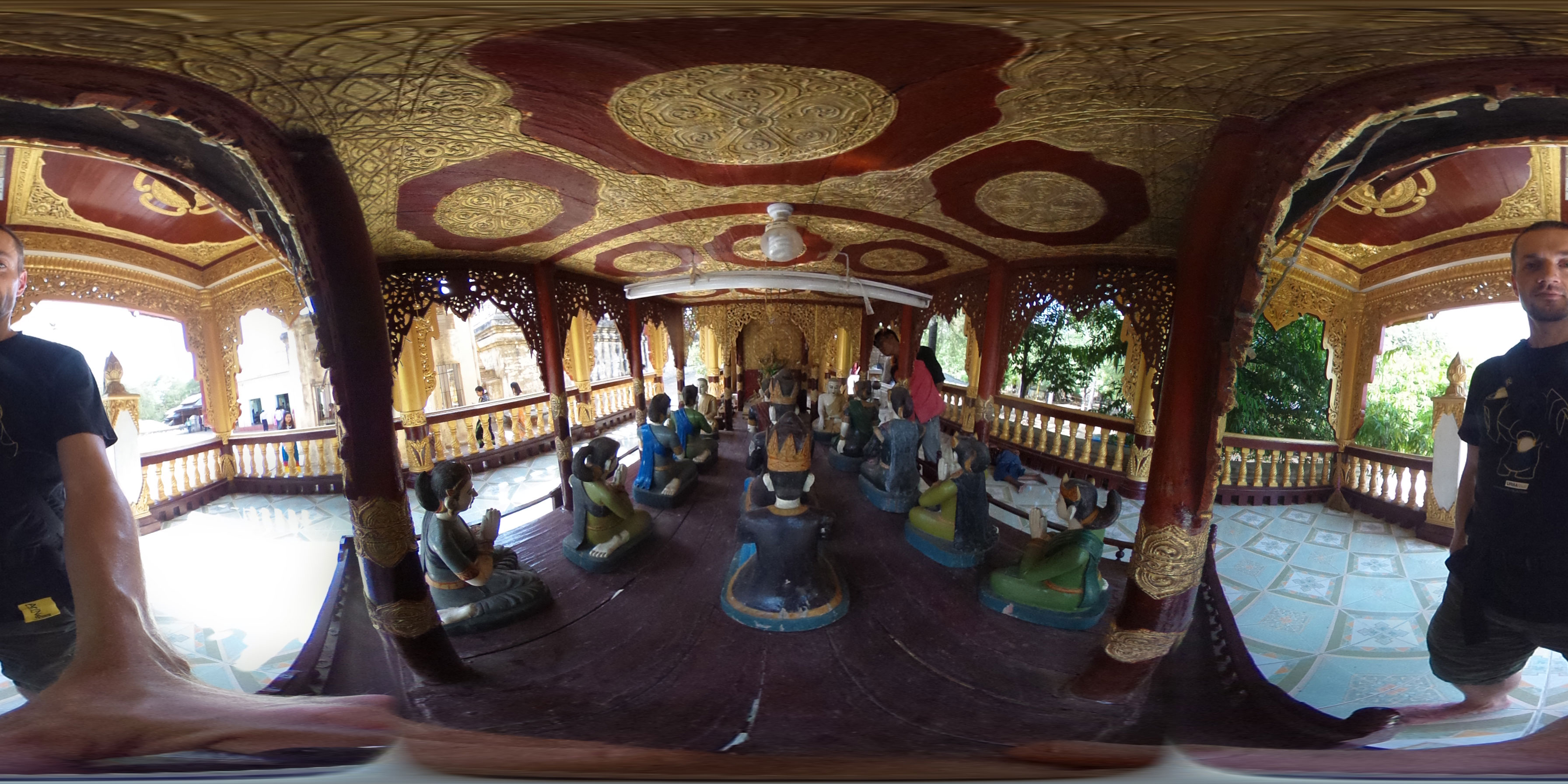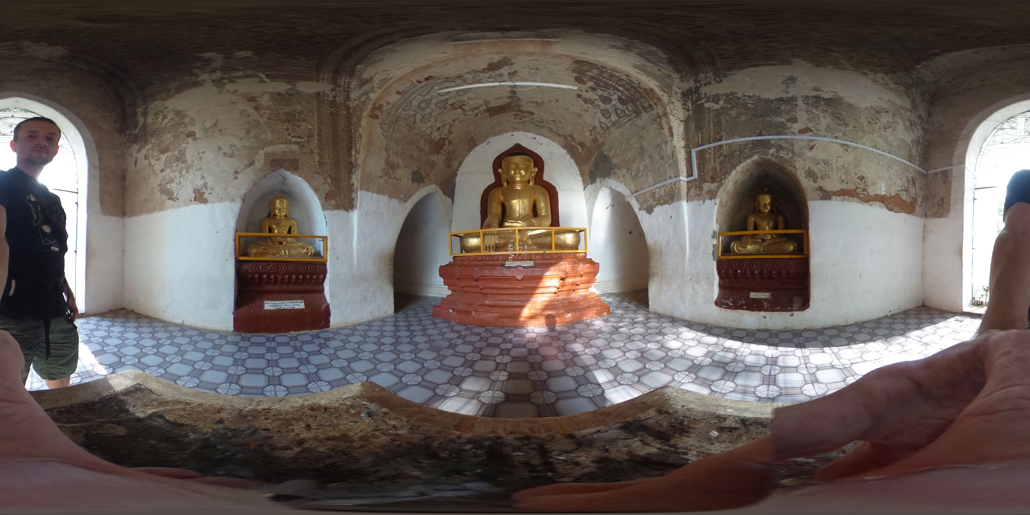 Ich fuhr zu vielen Tempeln, ging in einige und drehte auch so manche Runde durch die Pampa. Sandfahrten sind etwas schwerer zu beherrschen aber ich sah viel. Innen sind die Tempel einander ähnlich. Meine Theta wird immer beäugt. Sowas haben die Leute halt noch nicht gesehen, wenn ich sie auf einem Stativ hinstelle. Die Burmesen sind nett und neugierig. Alles super. Bei meiner Fahrt kam ich öfters an den gleichen Orten vorbei und sah Sachen doppelt. Die Tempel ähneln sich sehr und ich hatte mich gegen Abend schon satt gesehen.
