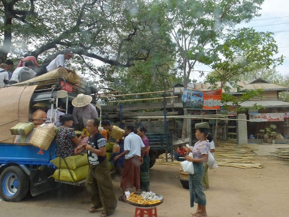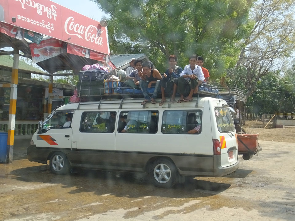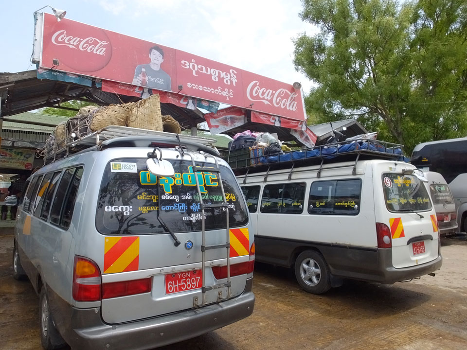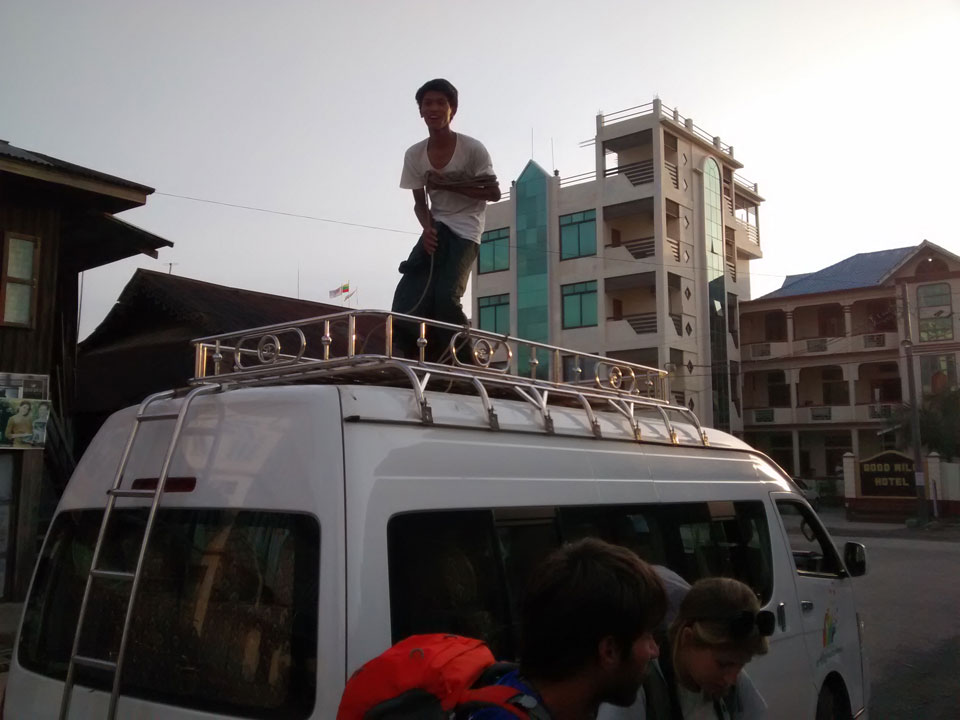 Morgens klappte mal wieder alles: Frühstück, Auschecken und Bus. Ein paar Leute aus dem Hostel wollten auch zum Inle-See und so wurde mein Rucksack auf dem Dach verstaut. Ich hatte aber eine andere Firma, also Rewind.
