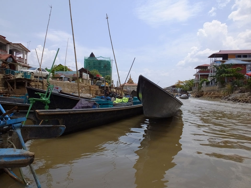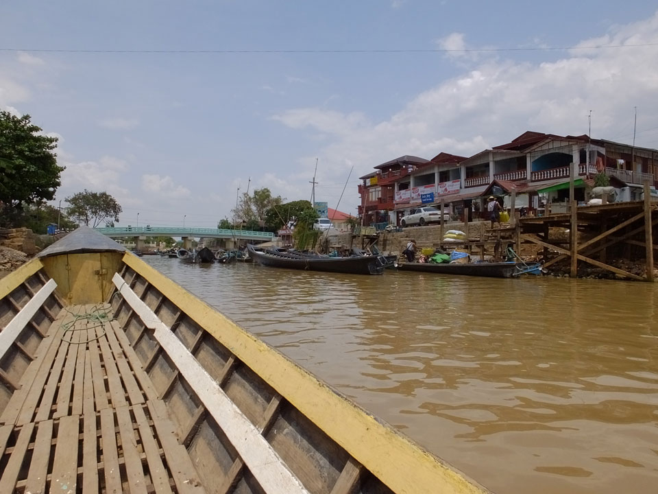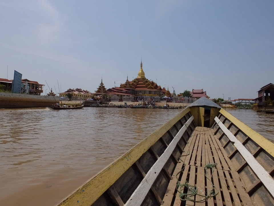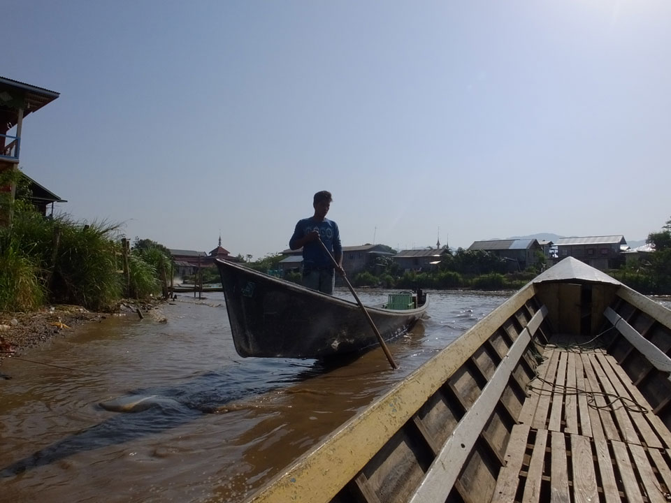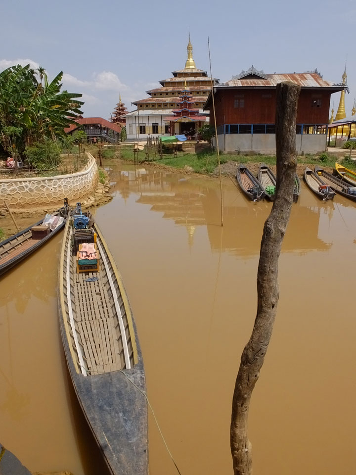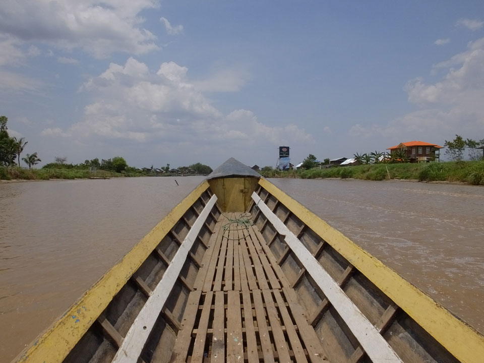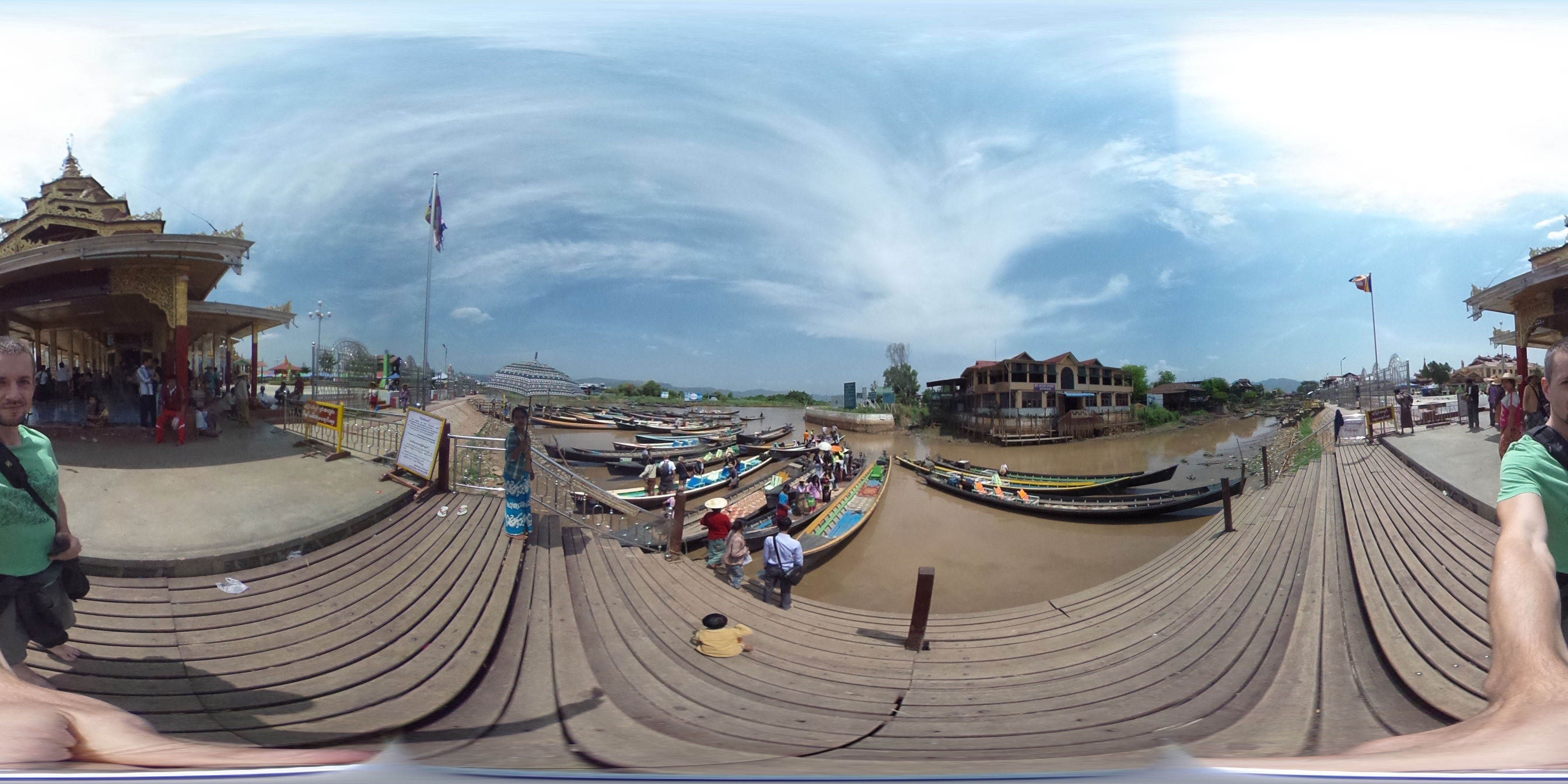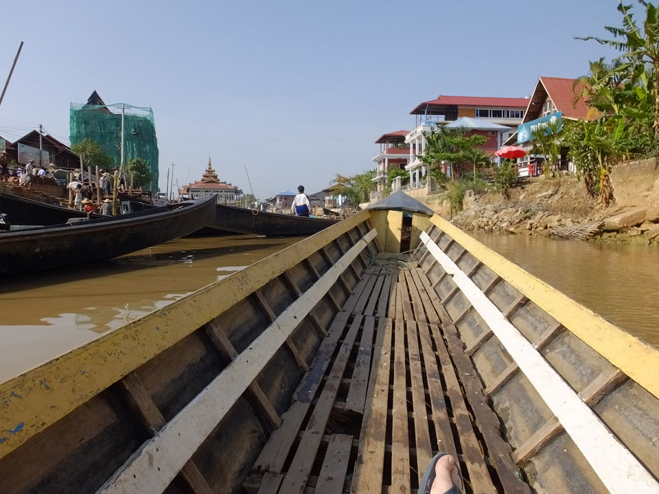 Kein Interesse, das Kloster nebenan noch zu besuchen und der Markt sei inzwischen auch zu. Für mich OK, ich hatte genug gesehen und so ging die Fahrt zurück. Noch mehr Photos und eine leere Batterie der Theta. Ich war’s zufrieden und kam wieder gut vor dem Hotel direkt am Kanal an. Brav zahlte ich die 15.000 Kyat. Die ganze Tour nahm um die 4 Stunden in Anspruch. Meine Beine hatte ich mir etwas in der Sonne verbrannt. Kopf und Gesicht waren dank Sonnencreme und Kapuzenpullover gesichert