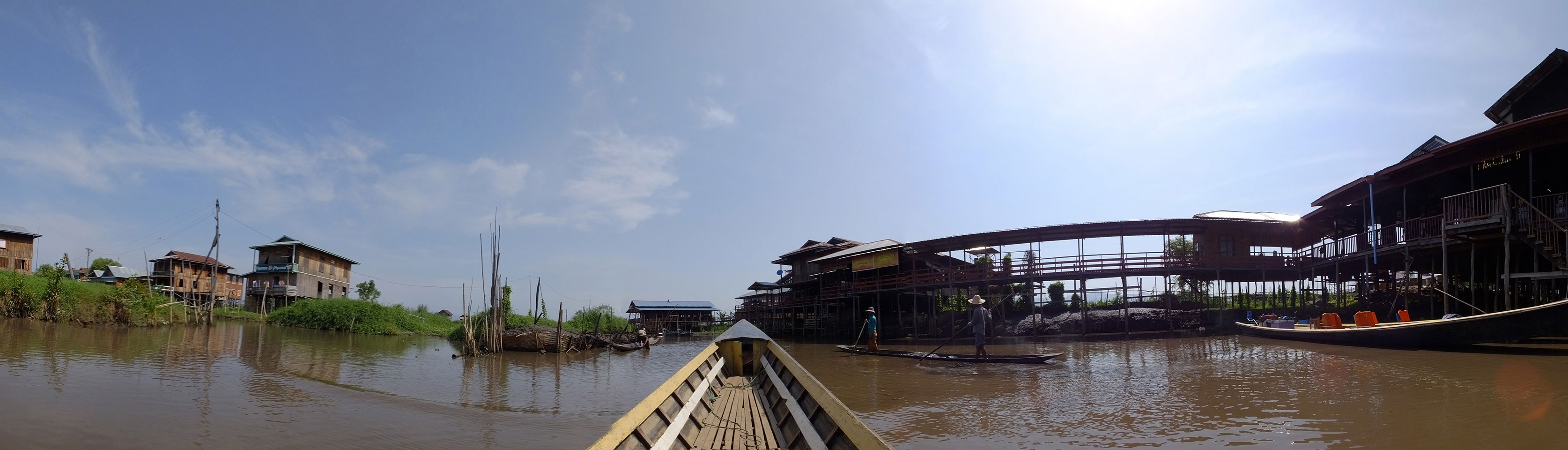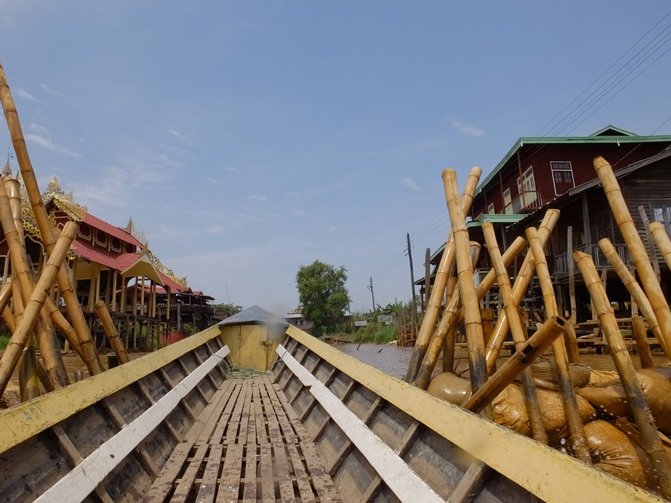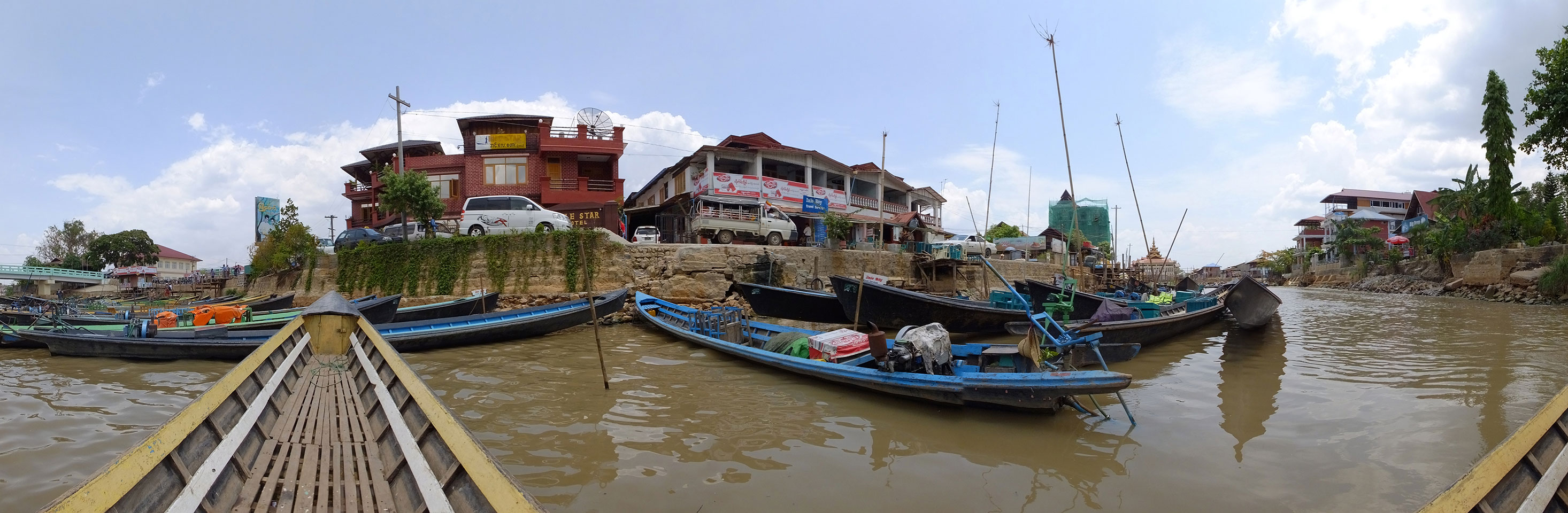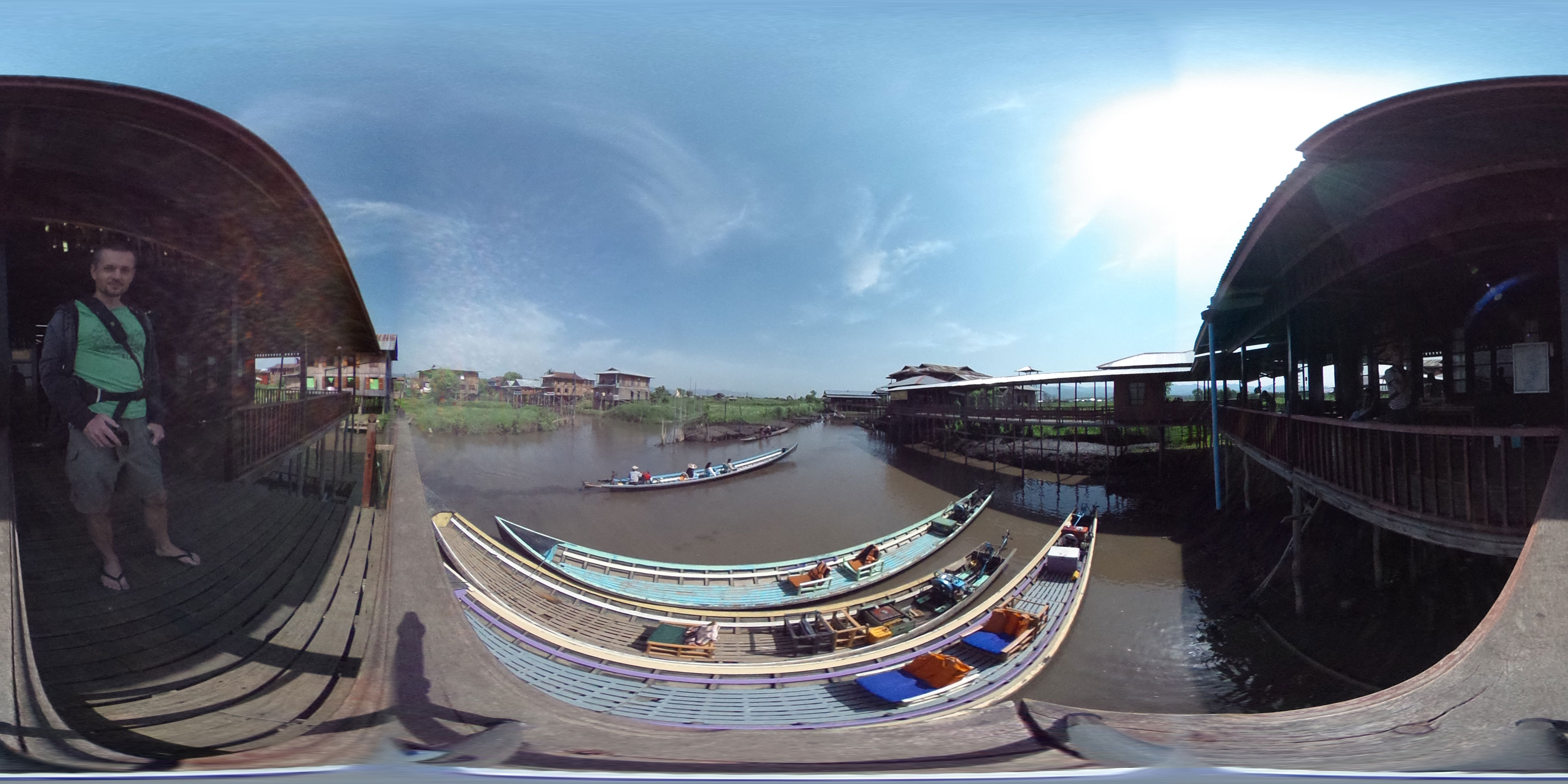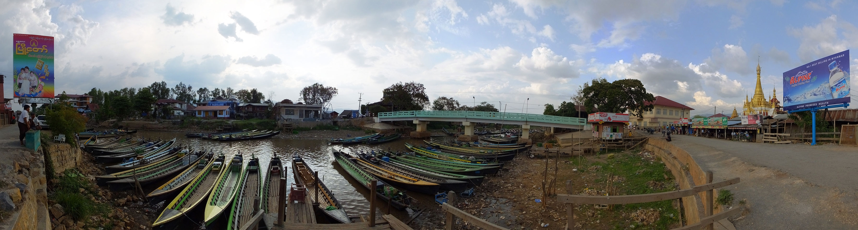 Kein Interesse, das Kloster nebenan noch zu besuchen und der Markt sei inzwischen auch zu. Für mich OK, ich hatte genug gesehen und so ging die Fahrt zurück. Noch mehr Photos und eine leere Batterie der Theta. Ich war’s zufrieden und kam wieder gut vor dem Hotel direkt am Kanal an. Brav zahlte ich die 15.000 Kyat. Die ganze Tour nahm um die 4 Stunden in Anspruch. Meine Beine hatte ich mir etwas in der Sonne verbrannt. Kopf und Gesicht waren dank Sonnencreme und Kapuzenpullover gesichert