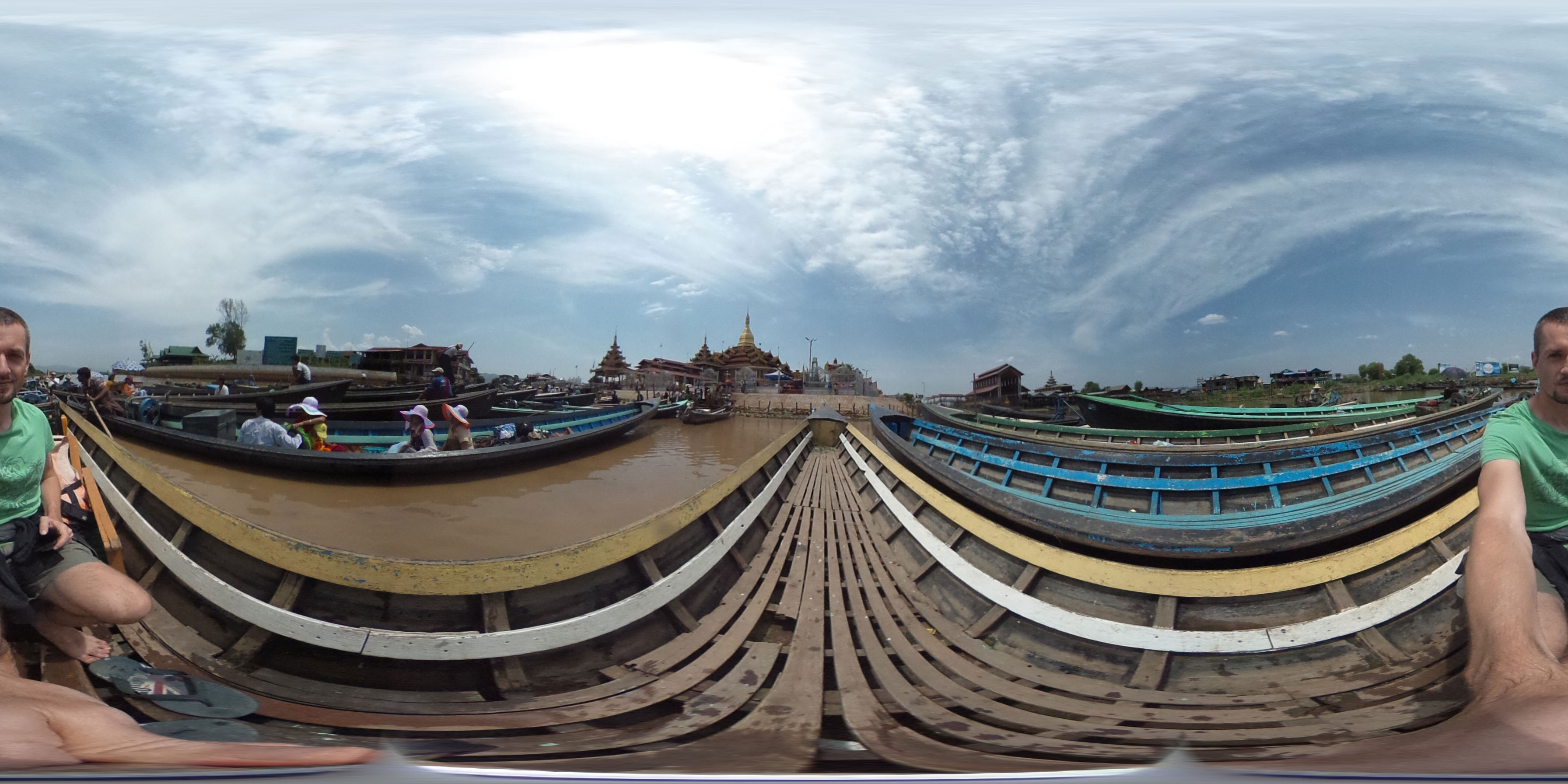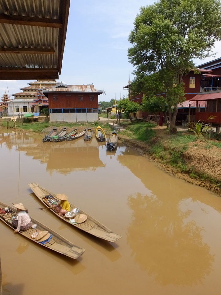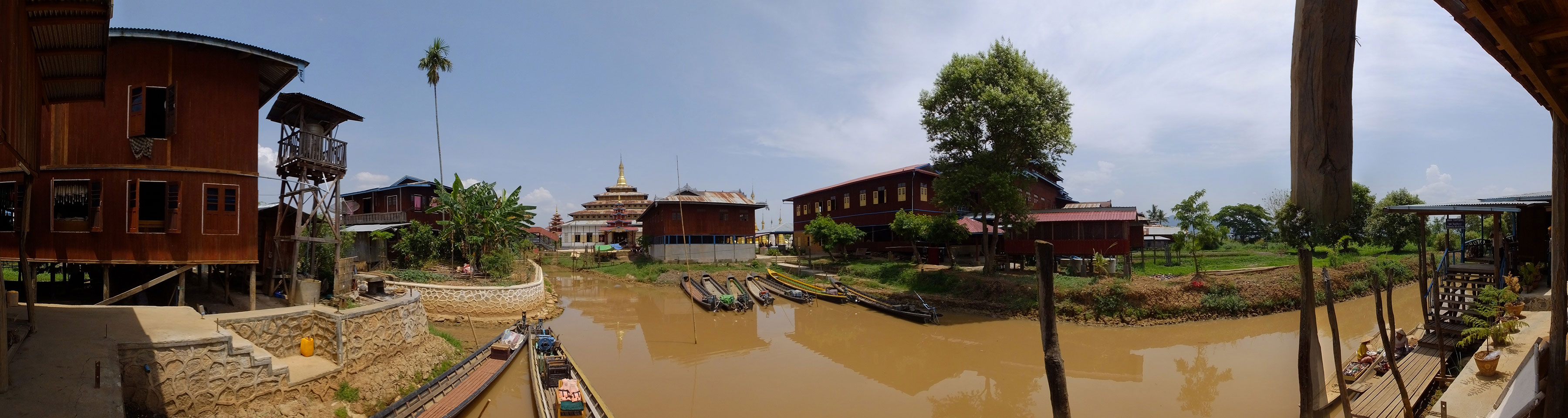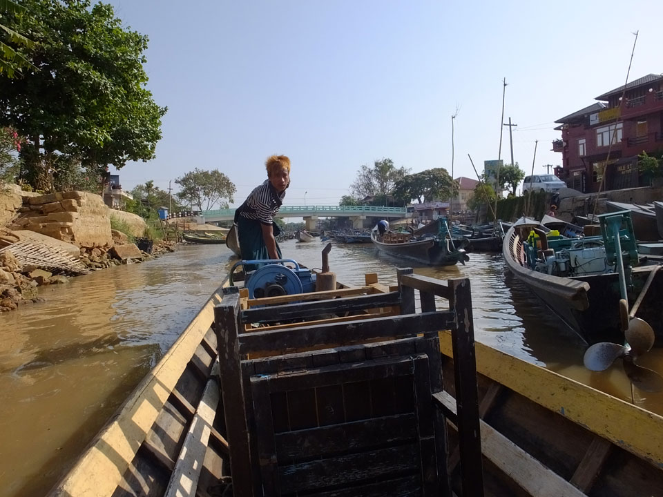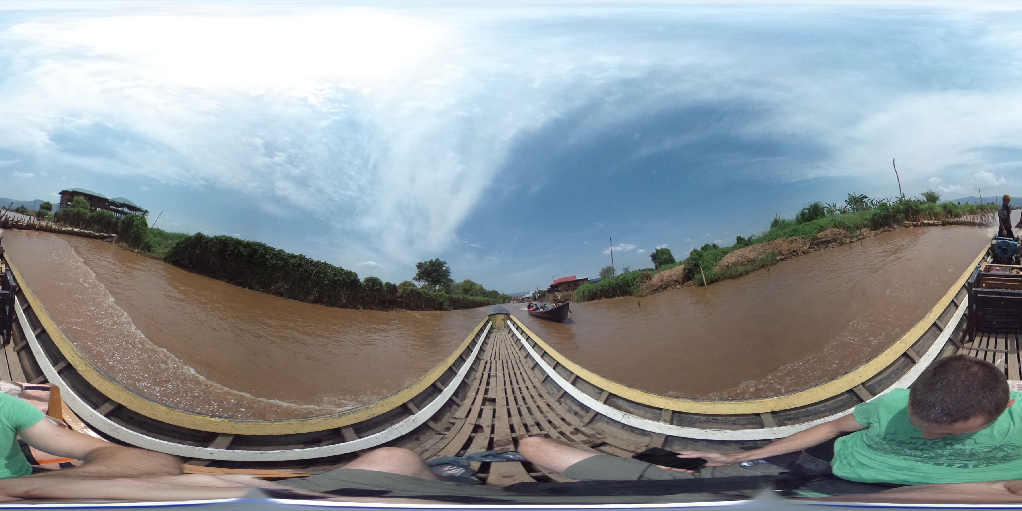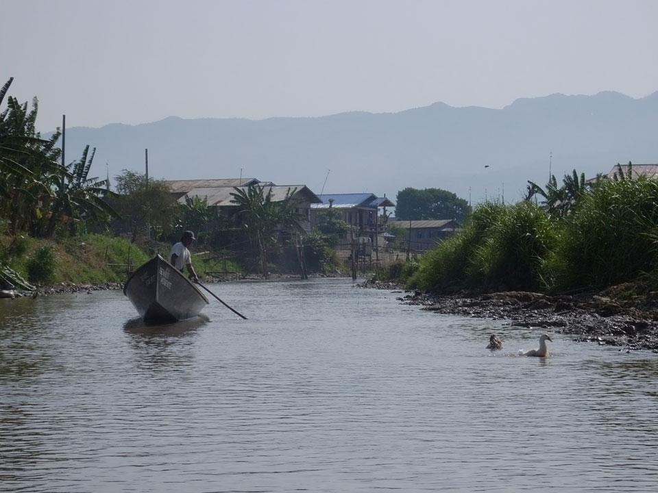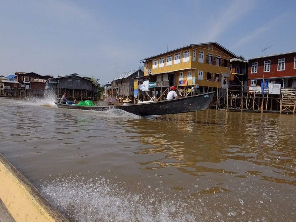 Kein Interesse, das Kloster nebenan noch zu besuchen und der Markt sei inzwischen auch zu. Für mich OK, ich hatte genug gesehen und so ging die Fahrt zurück. Noch mehr Photos und eine leere Batterie der Theta. Ich war’s zufrieden und kam wieder gut vor dem Hotel direkt am Kanal an. Brav zahlte ich die 15.000 Kyat. Die ganze Tour nahm um die 4 Stunden in Anspruch. Meine Beine hatte ich mir etwas in der Sonne verbrannt. Kopf und Gesicht waren dank Sonnencreme und Kapuzenpullover gesichert