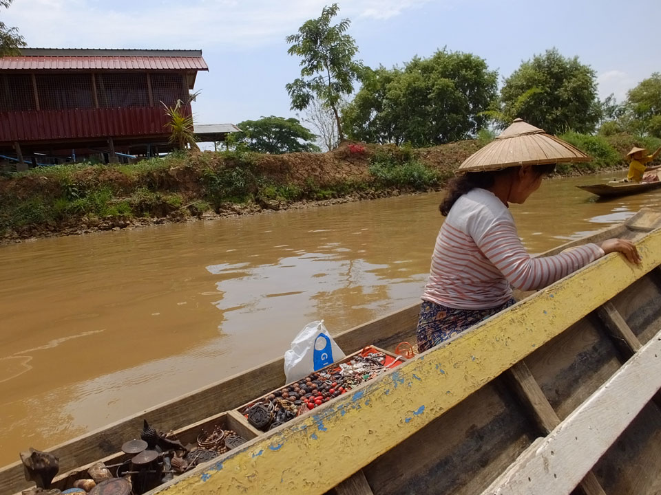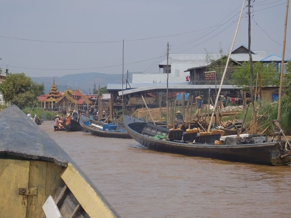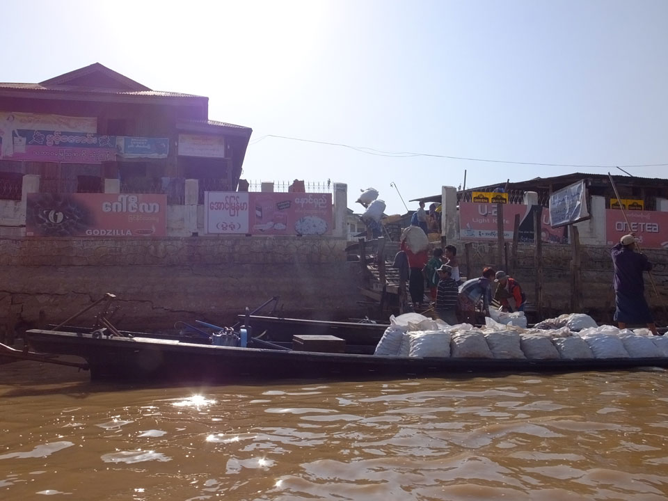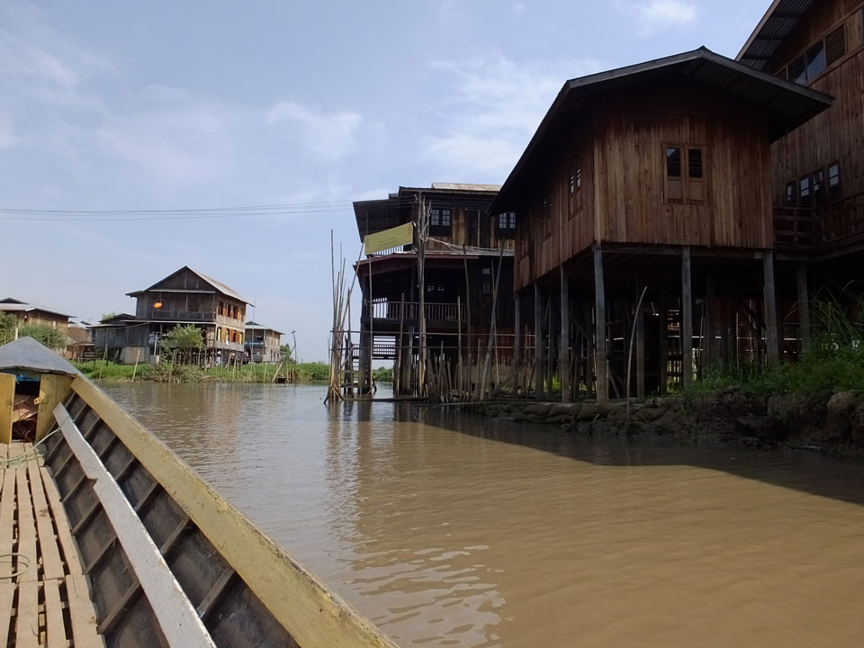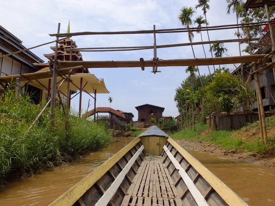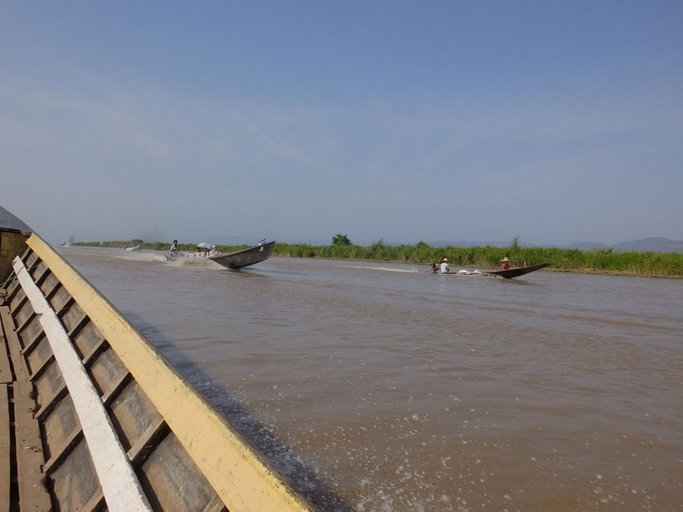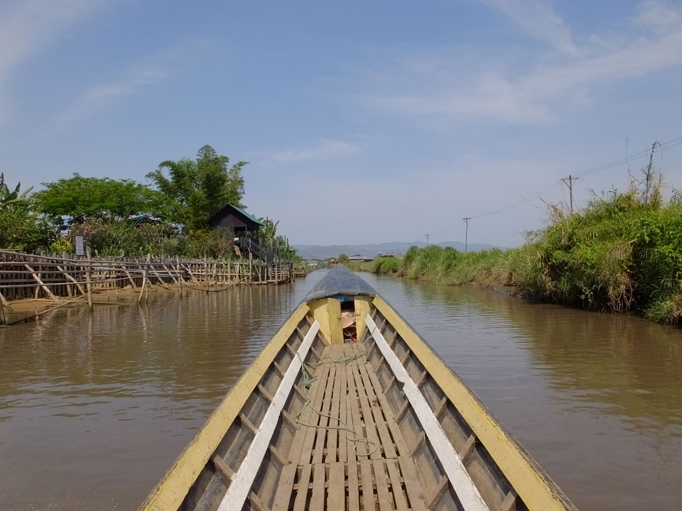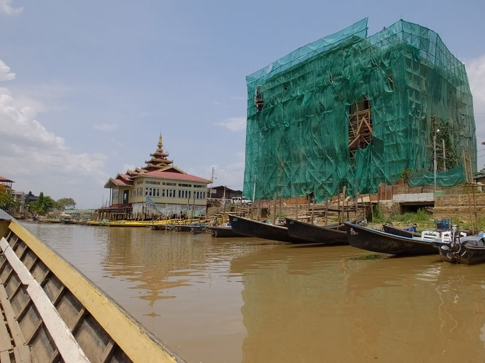 Kein Interesse, das Kloster nebenan noch zu besuchen und der Markt sei inzwischen auch zu. Für mich OK, ich hatte genug gesehen und so ging die Fahrt zurück. Noch mehr Photos und eine leere Batterie der Theta. Ich war’s zufrieden und kam wieder gut vor dem Hotel direkt am Kanal an. Brav zahlte ich die 15.000 Kyat. Die ganze Tour nahm um die 4 Stunden in Anspruch. Meine Beine hatte ich mir etwas in der Sonne verbrannt. Kopf und Gesicht waren dank Sonnencreme und Kapuzenpullover gesichert