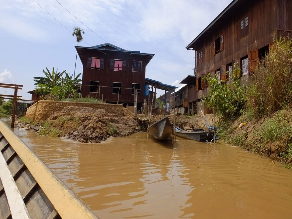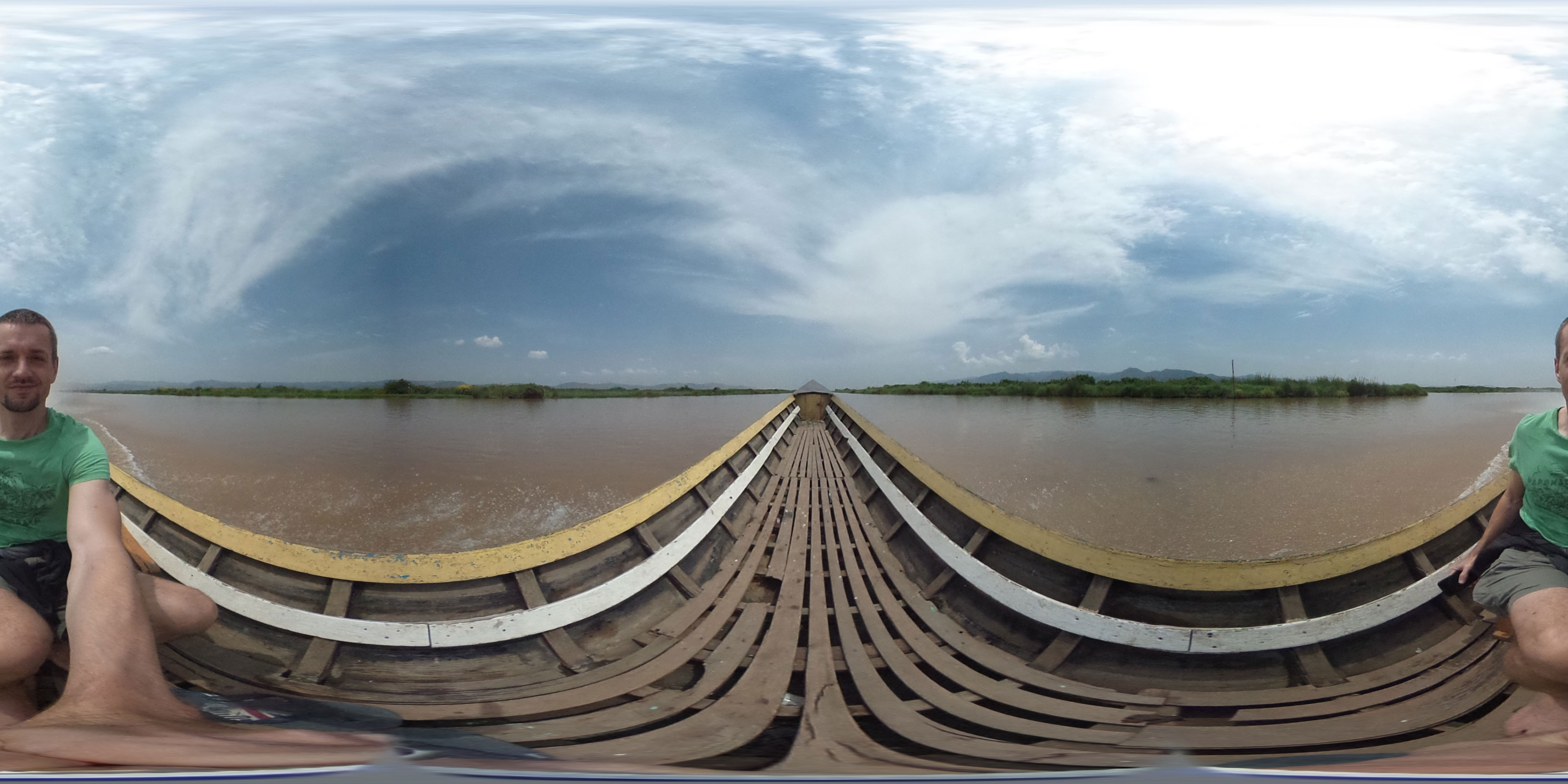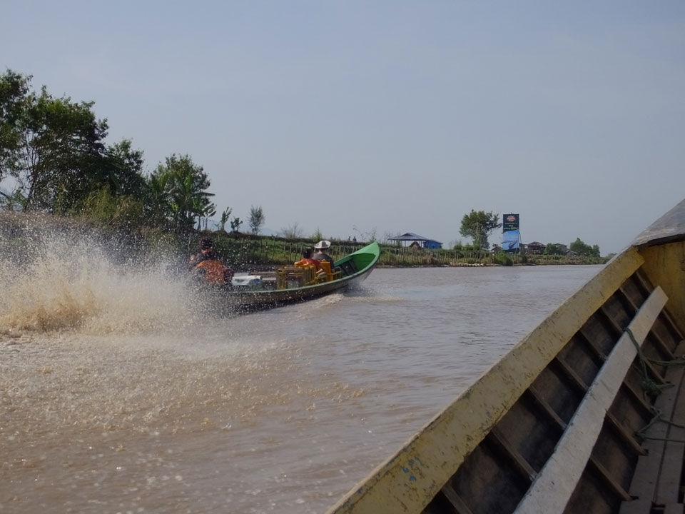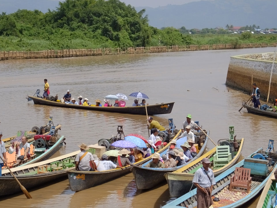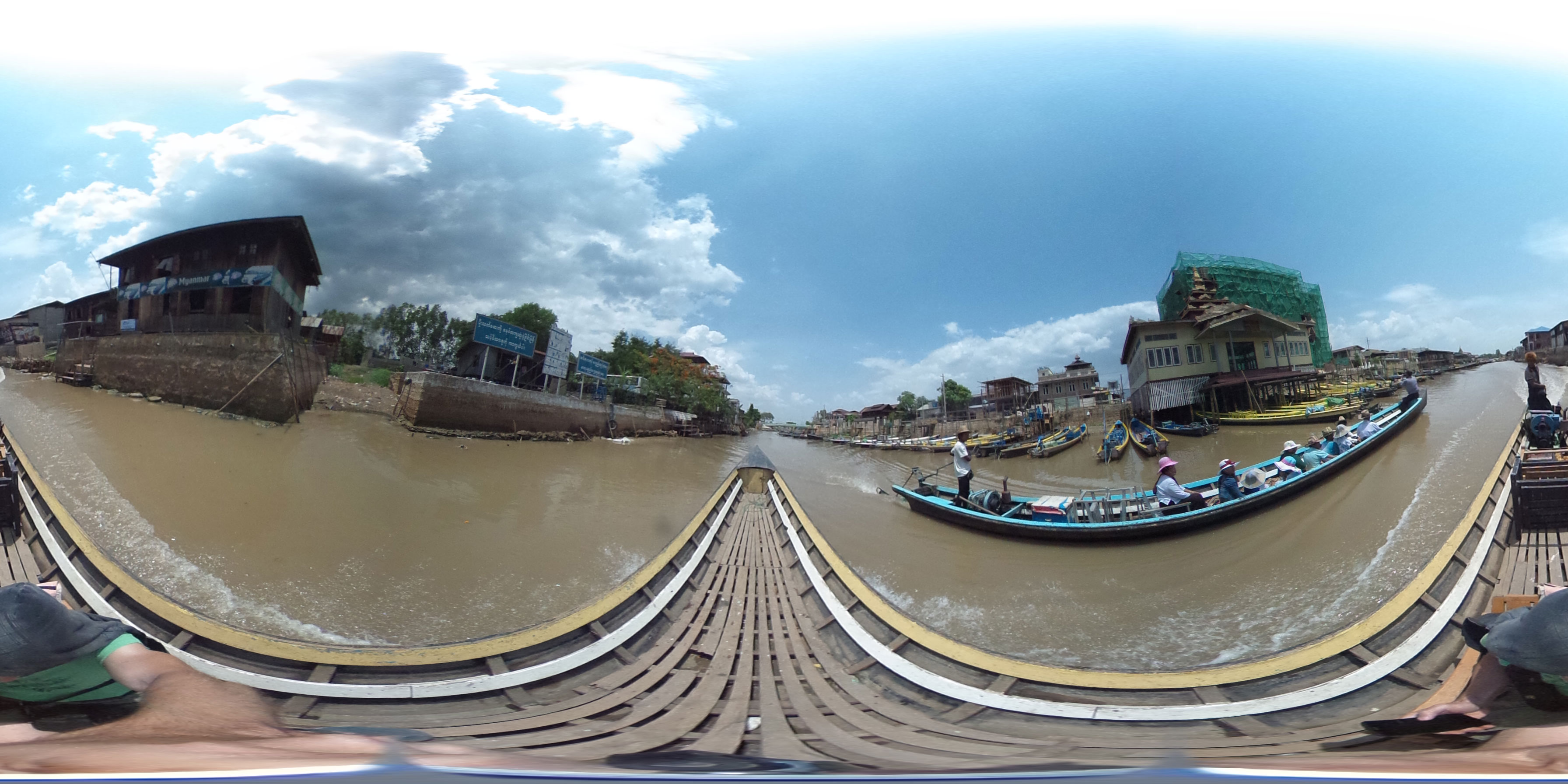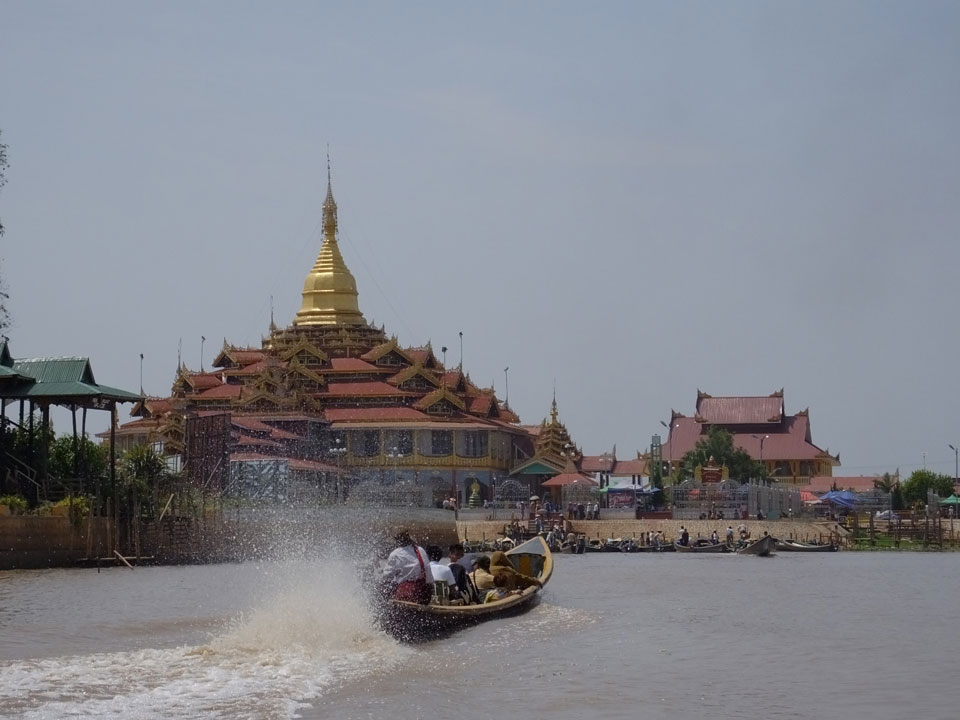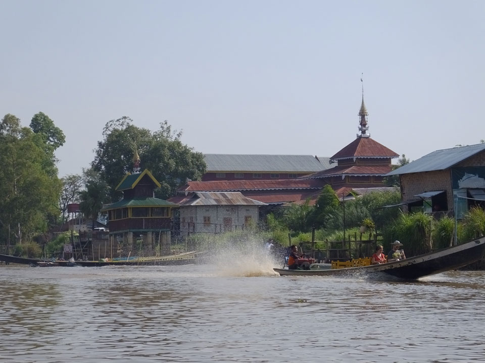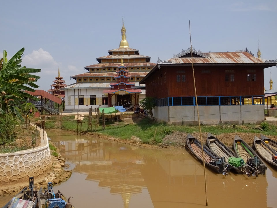 Kein Interesse, das Kloster nebenan noch zu besuchen und der Markt sei inzwischen auch zu. Für mich OK, ich hatte genug gesehen und so ging die Fahrt zurück. Noch mehr Photos und eine leere Batterie der Theta. Ich war’s zufrieden und kam wieder gut vor dem Hotel direkt am Kanal an. Brav zahlte ich die 15.000 Kyat. Die ganze Tour nahm um die 4 Stunden in Anspruch. Meine Beine hatte ich mir etwas in der Sonne verbrannt. Kopf und Gesicht waren dank Sonnencreme und Kapuzenpullover gesichert