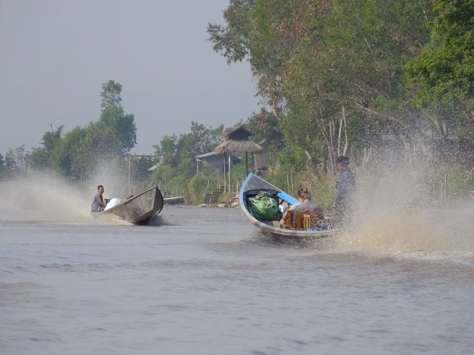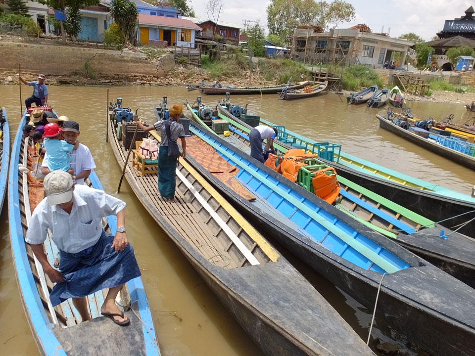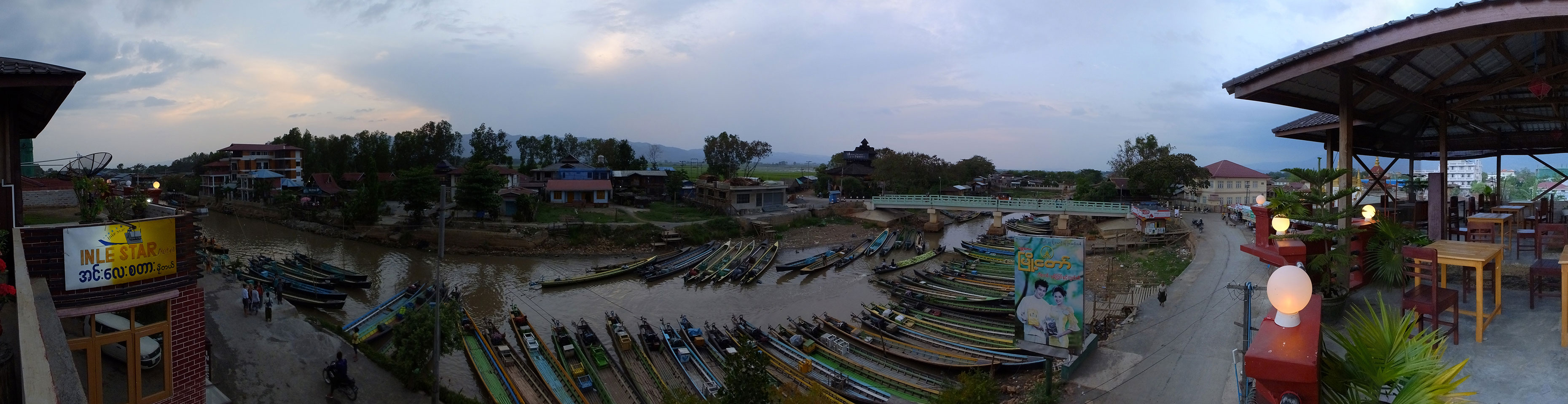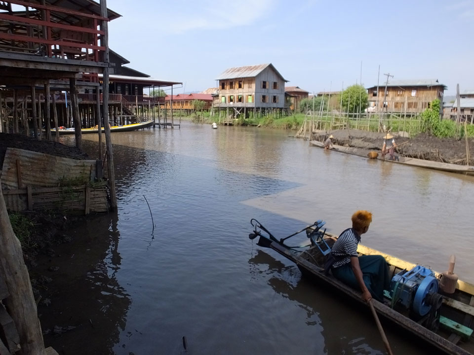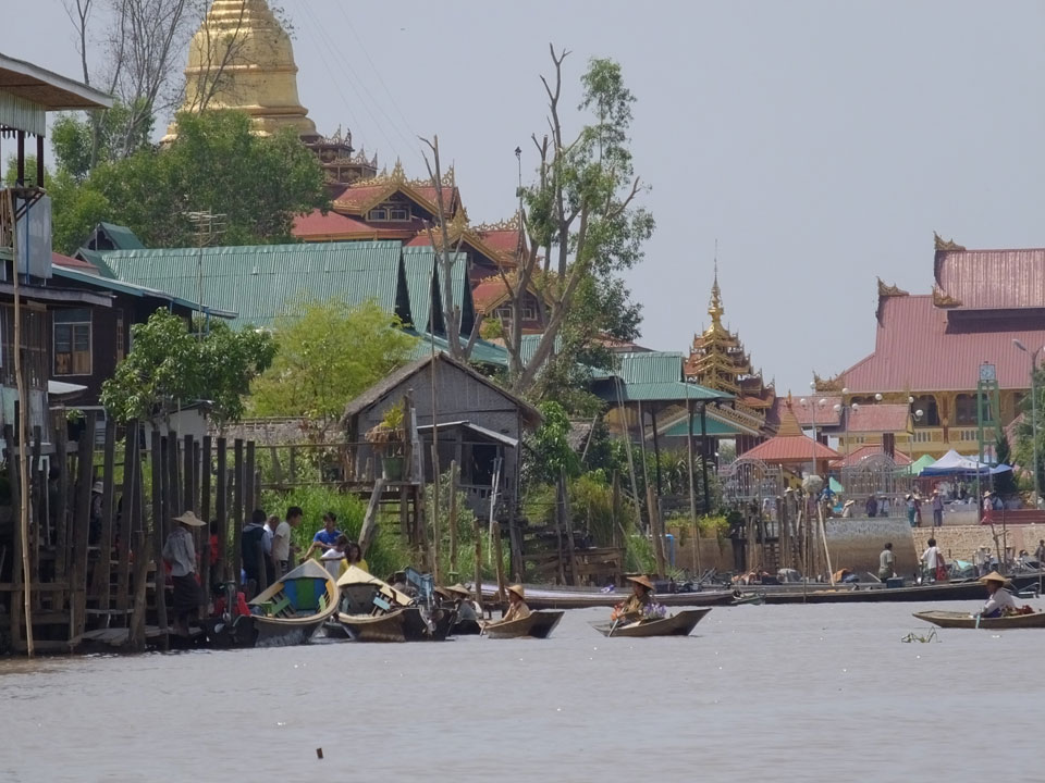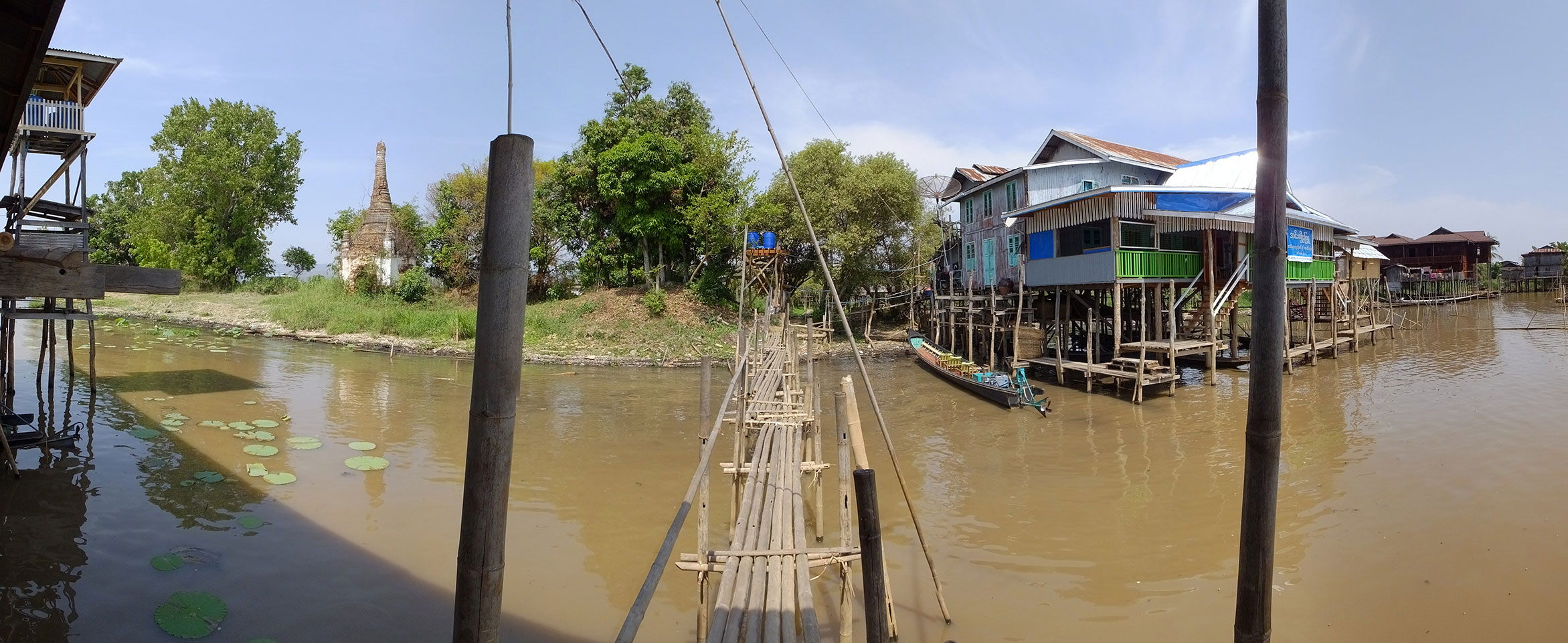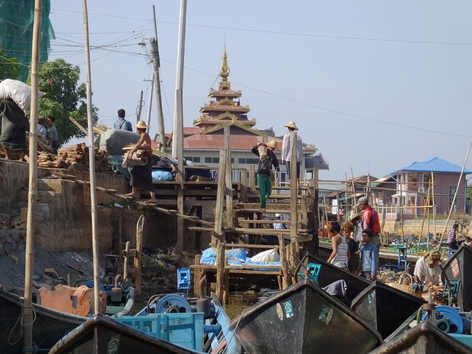 Kein Interesse, das Kloster nebenan noch zu besuchen und der Markt sei inzwischen auch zu. Für mich OK, ich hatte genug gesehen und so ging die Fahrt zurück. Noch mehr Photos und eine leere Batterie der Theta. Ich war’s zufrieden und kam wieder gut vor dem Hotel direkt am Kanal an. Brav zahlte ich die 15.000 Kyat. Die ganze Tour nahm um die 4 Stunden in Anspruch. Meine Beine hatte ich mir etwas in der Sonne verbrannt. Kopf und Gesicht waren dank Sonnencreme und Kapuzenpullover gesichert