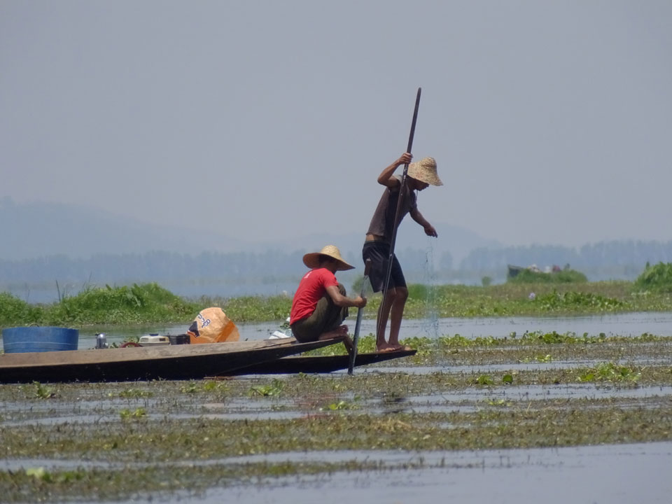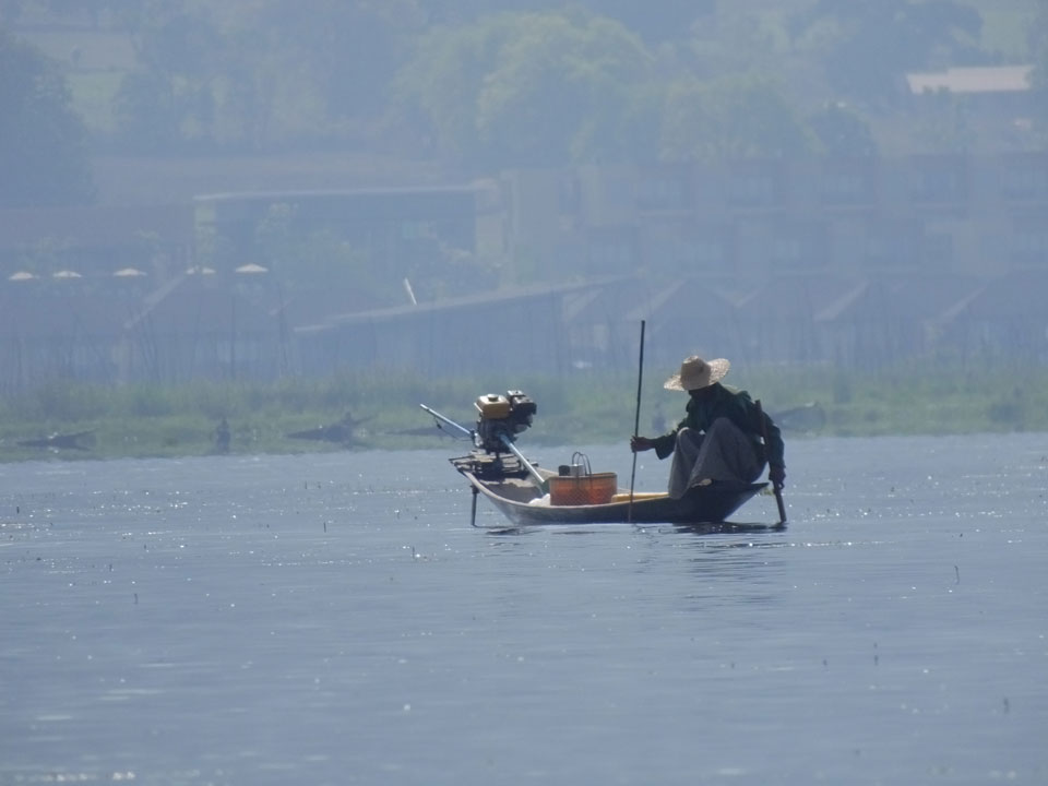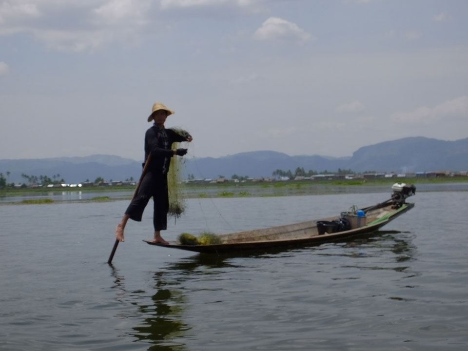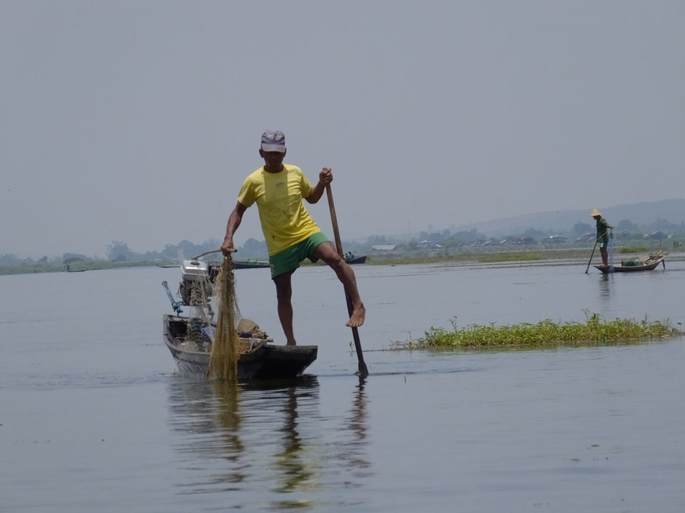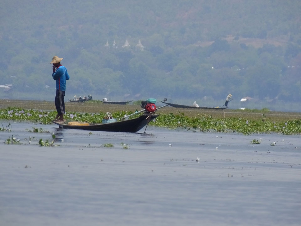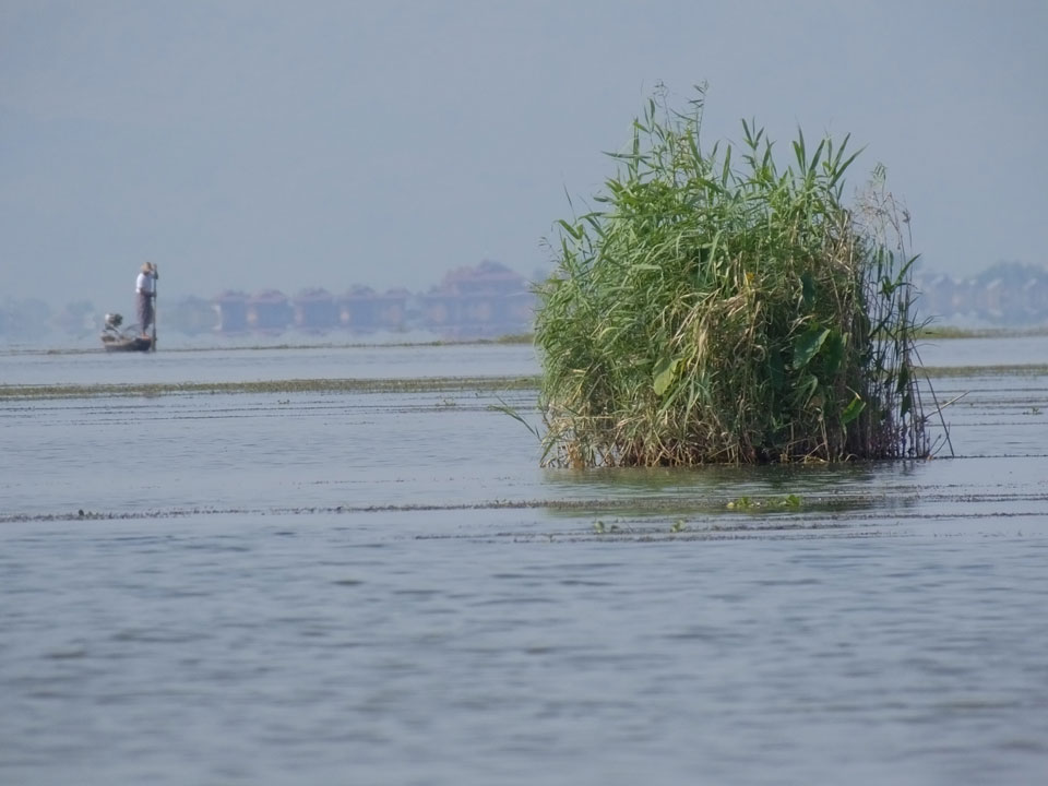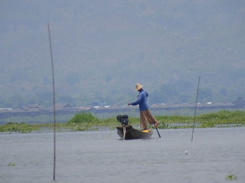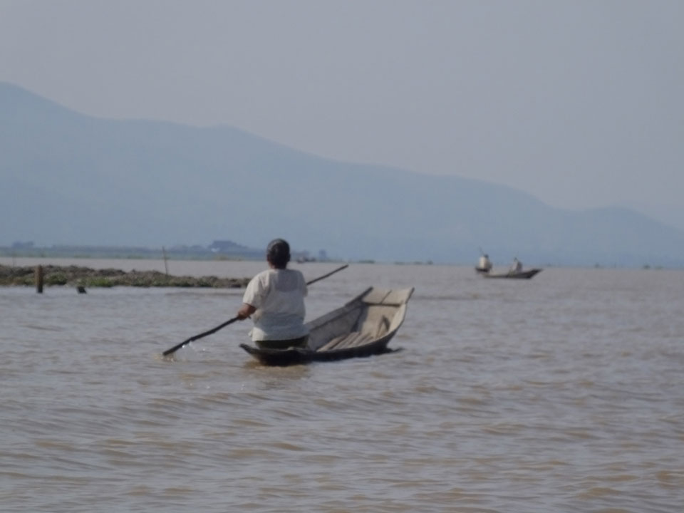 Es ging zum See, der ganz schön groß war. Endlich sah ich die Fischer mit ihren typischen Steuerbewegungen per Bein. Ein Bein im Boot, ein Bein um das Ruder. Viele Leute fischten auch Algen aus dem Wasser. Das schien nicht gerade tief. Später las ich – 1.50m durchschnittlich.