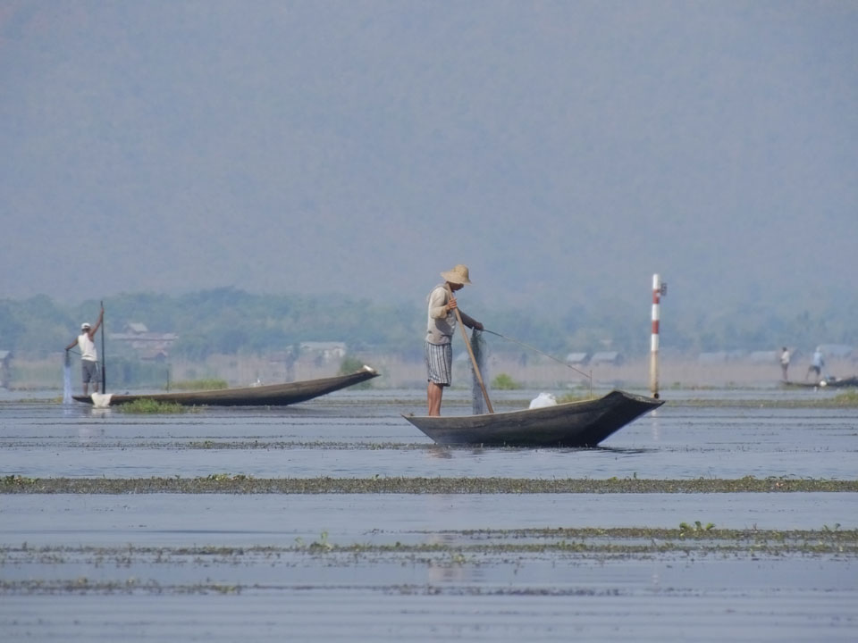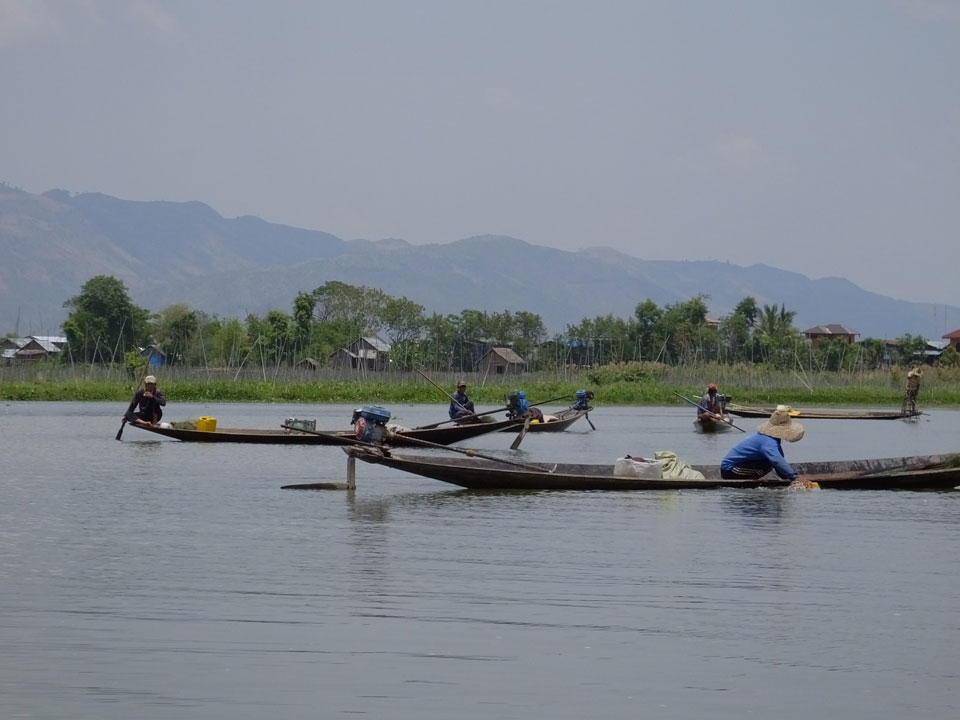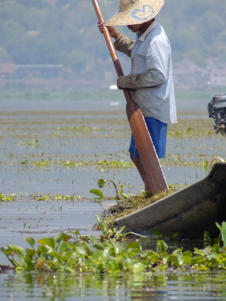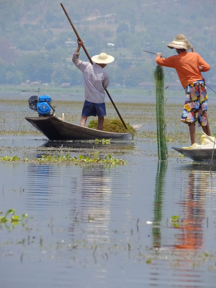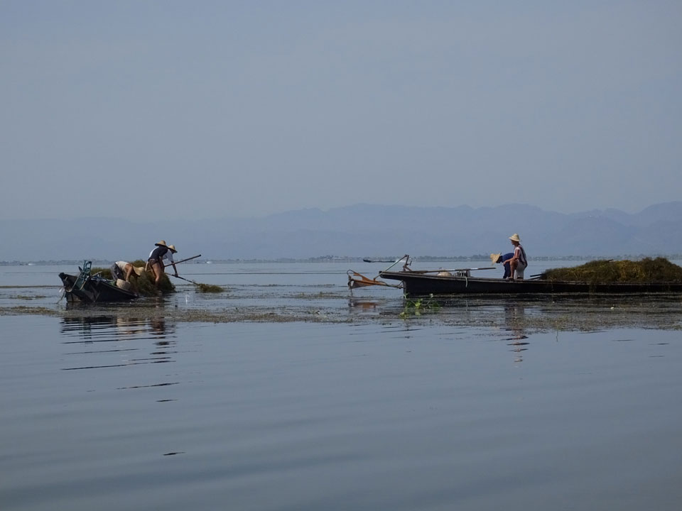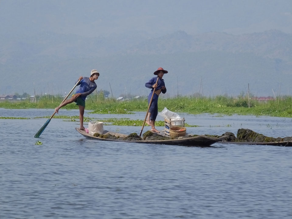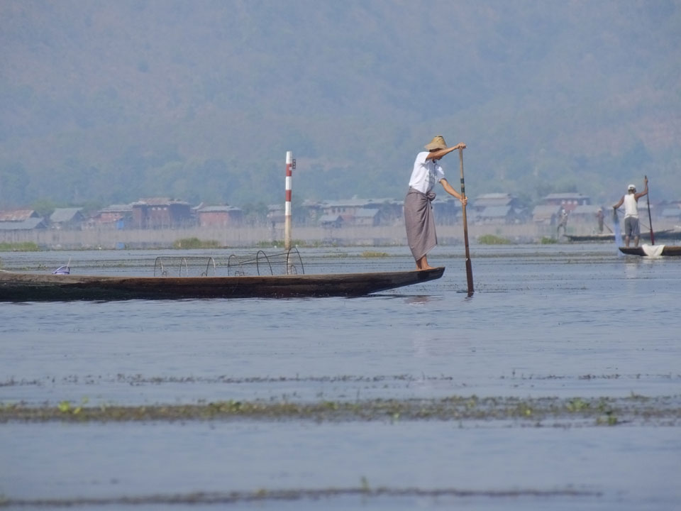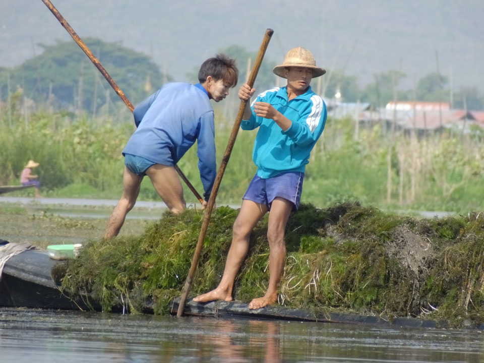Es ging zum See, der ganz schön groß war. Endlich sah ich die Fischer mit ihren typischen Steuerbewegungen per Bein. Ein Bein im Boot, ein Bein um das Ruder. Viele Leute fischten auch Algen aus dem Wasser. Das schien nicht gerade tief. Später las ich – 1.50m durchschnittlich.