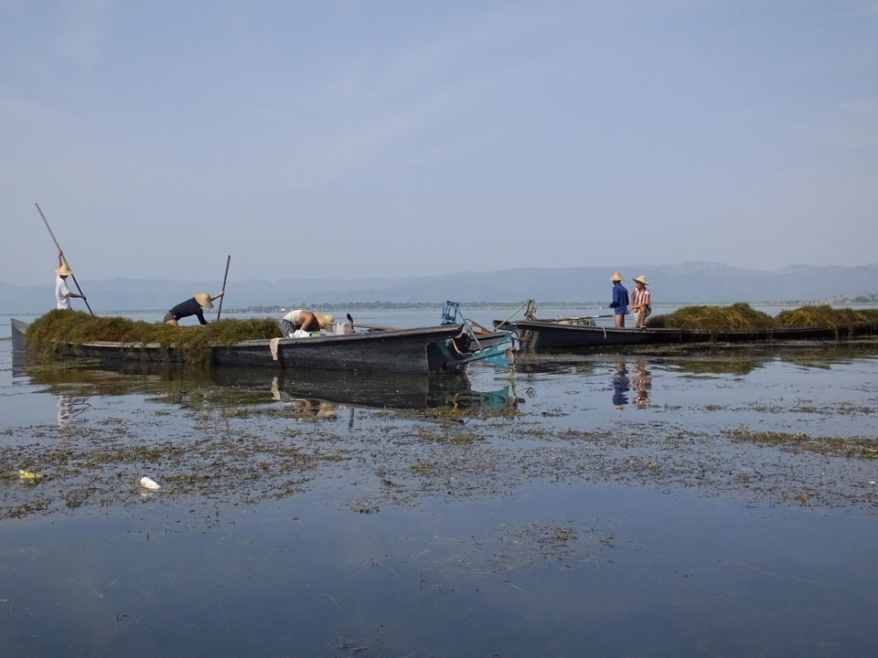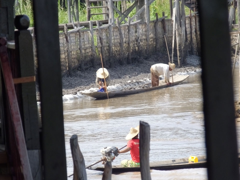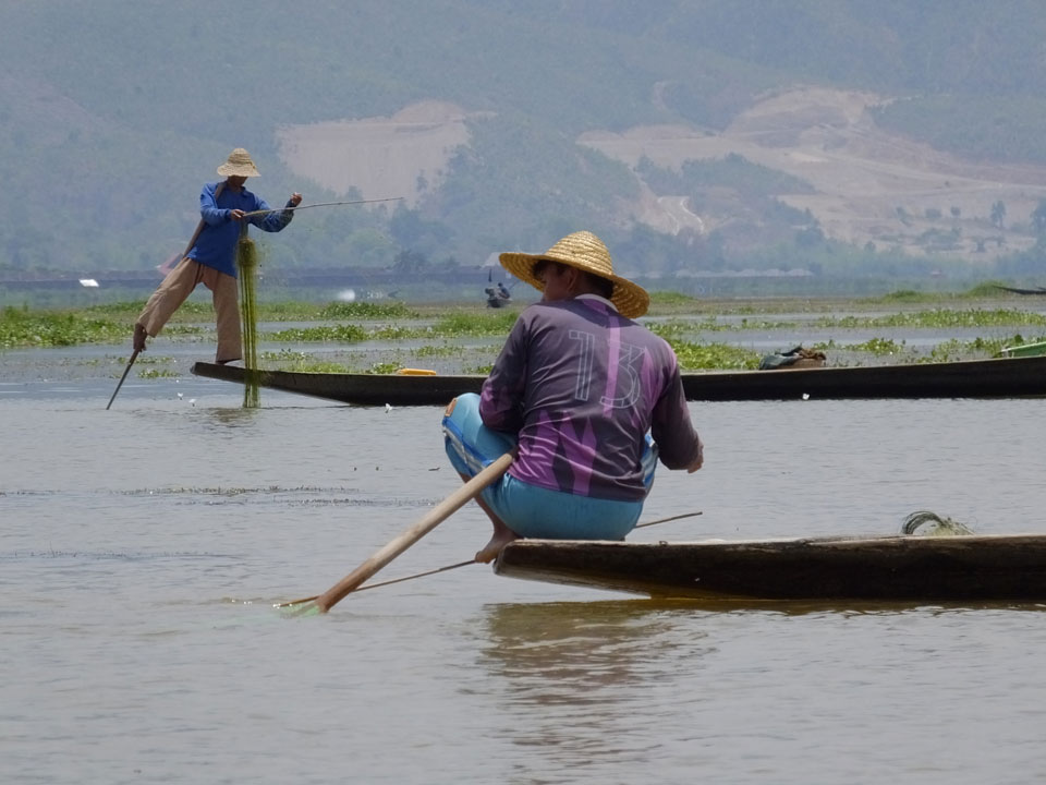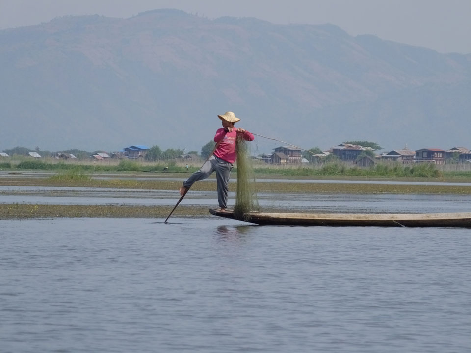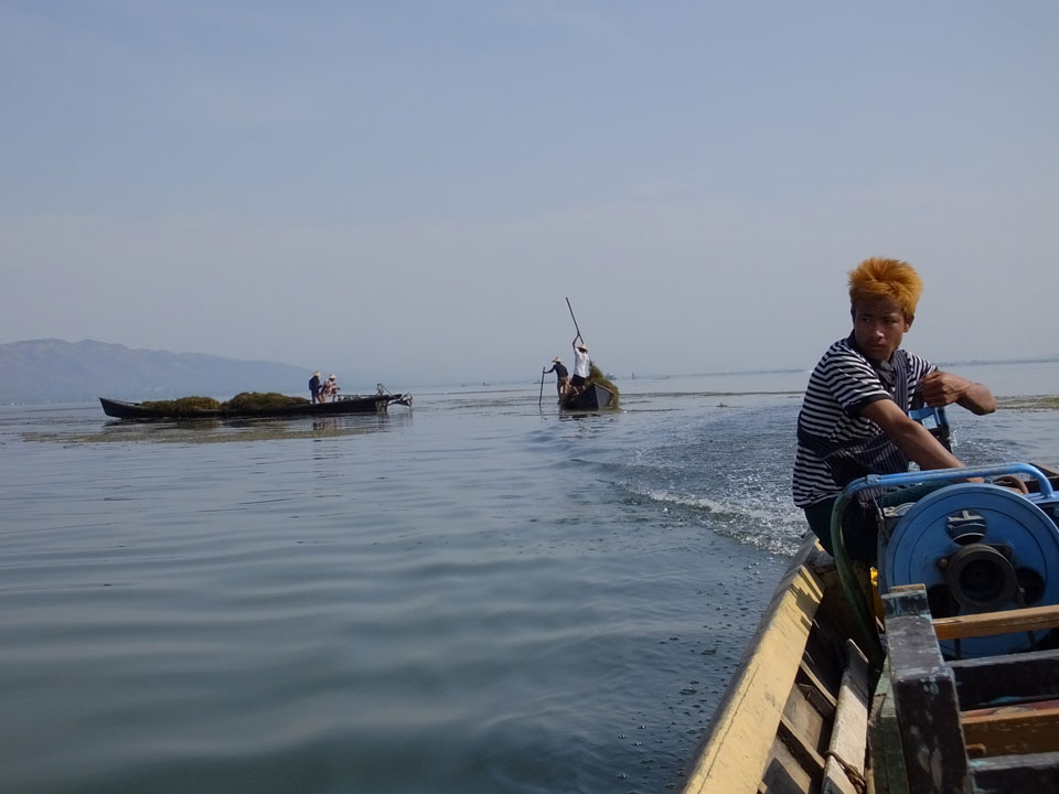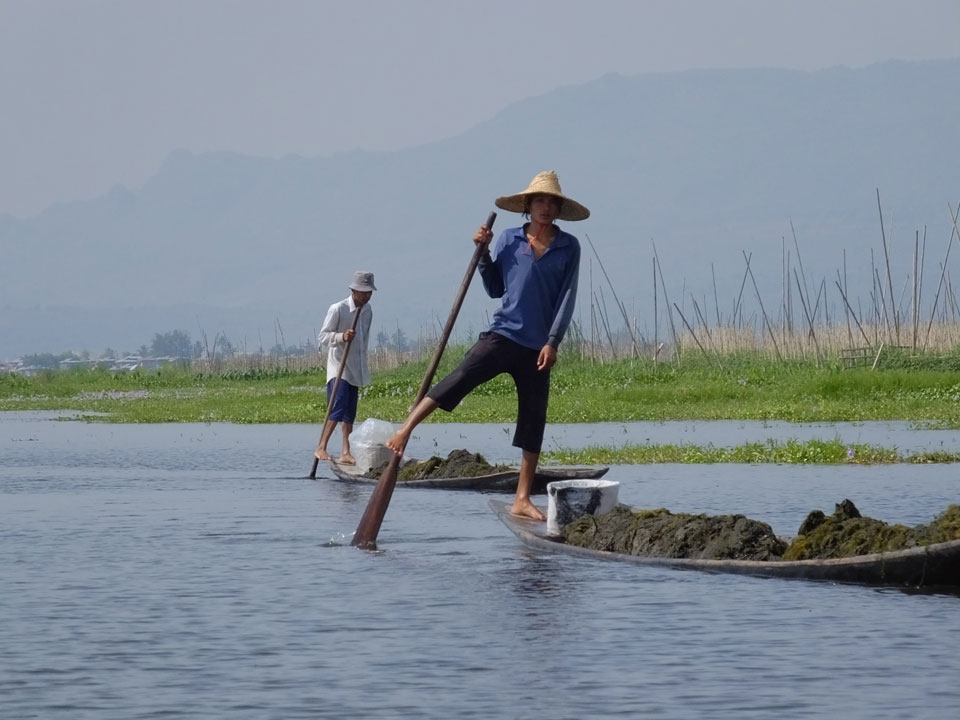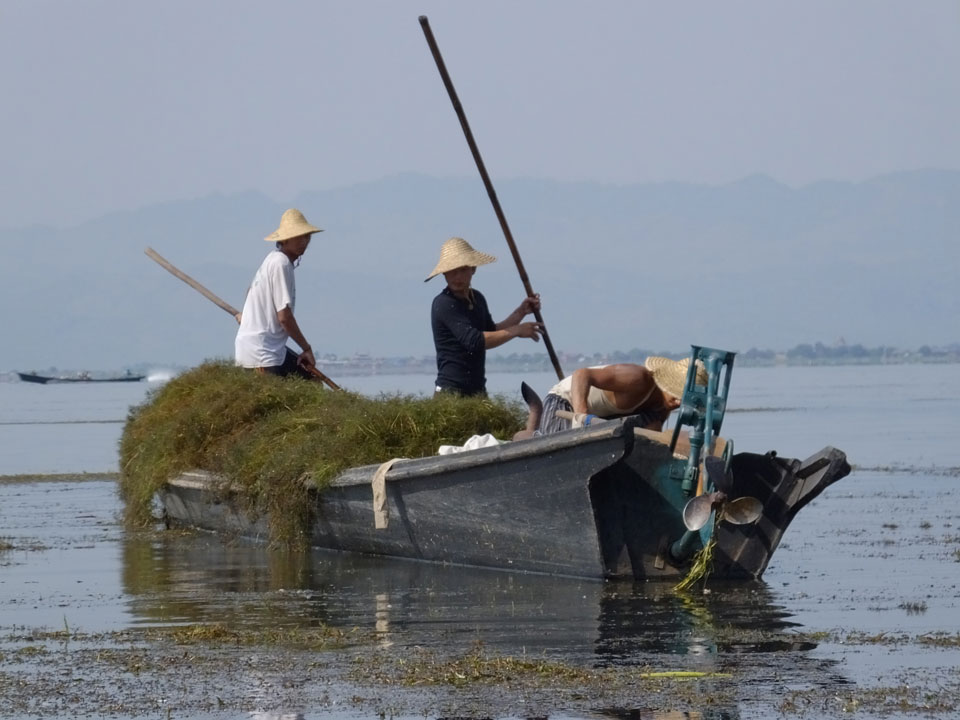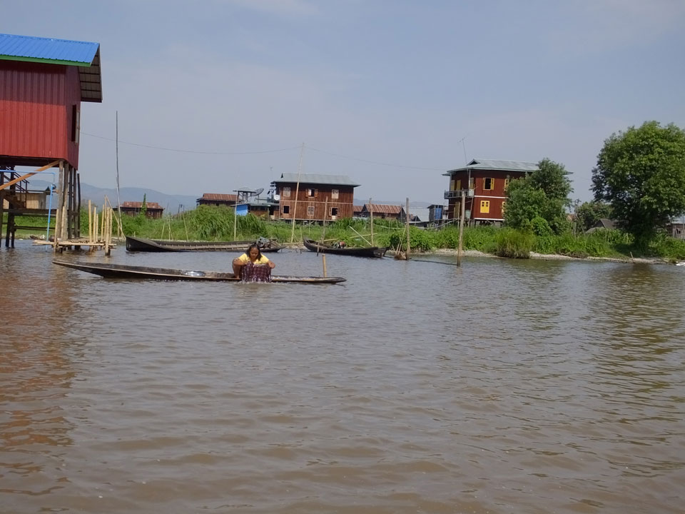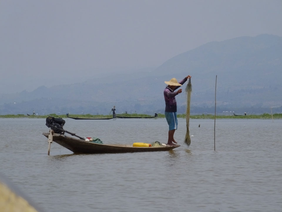 Es ging zum See, der ganz schön groß war. Endlich sah ich die Fischer mit ihren typischen Steuerbewegungen per Bein. Ein Bein im Boot, ein Bein um das Ruder. Viele Leute fischten auch Algen aus dem Wasser. Das schien nicht gerade tief. Später las ich – 1.50m durchschnittlich.
