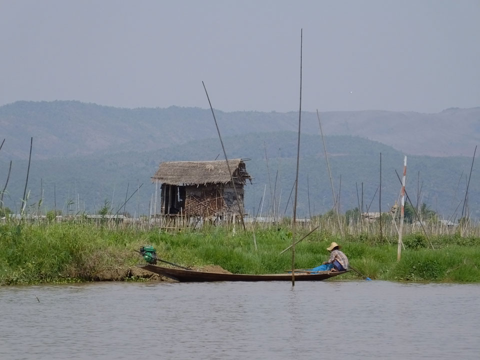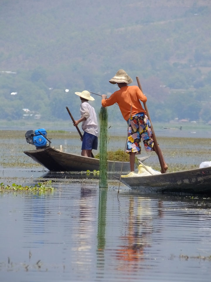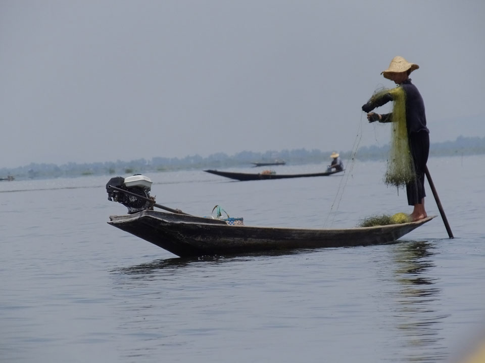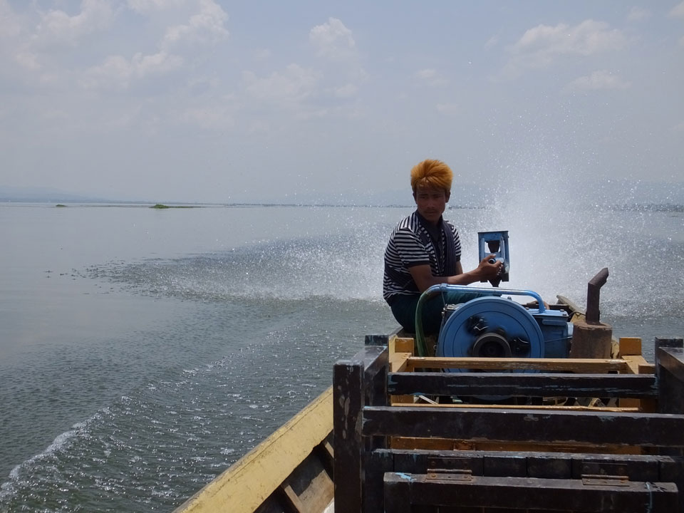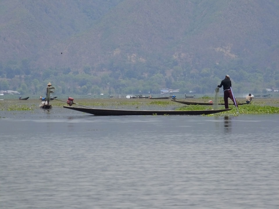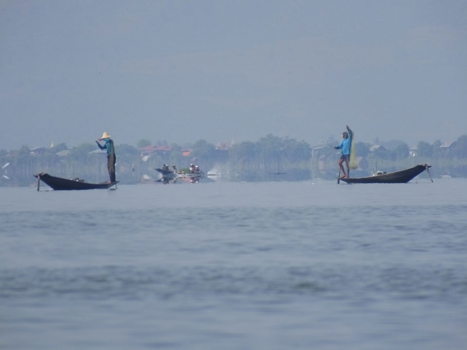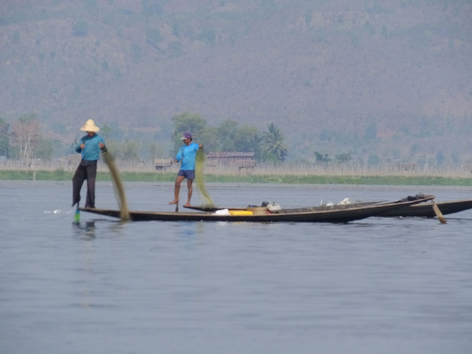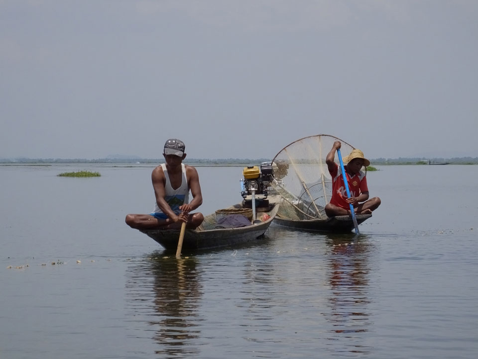 Es ging zum See, der ganz schön groß war. Endlich sah ich die Fischer mit ihren typischen Steuerbewegungen per Bein. Ein Bein im Boot, ein Bein um das Ruder. Viele Leute fischten auch Algen aus dem Wasser. Das schien nicht gerade tief. Später las ich – 1.50m durchschnittlich.