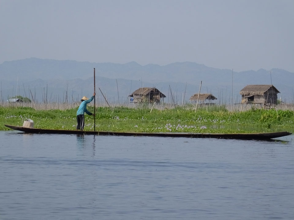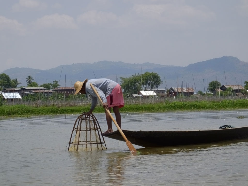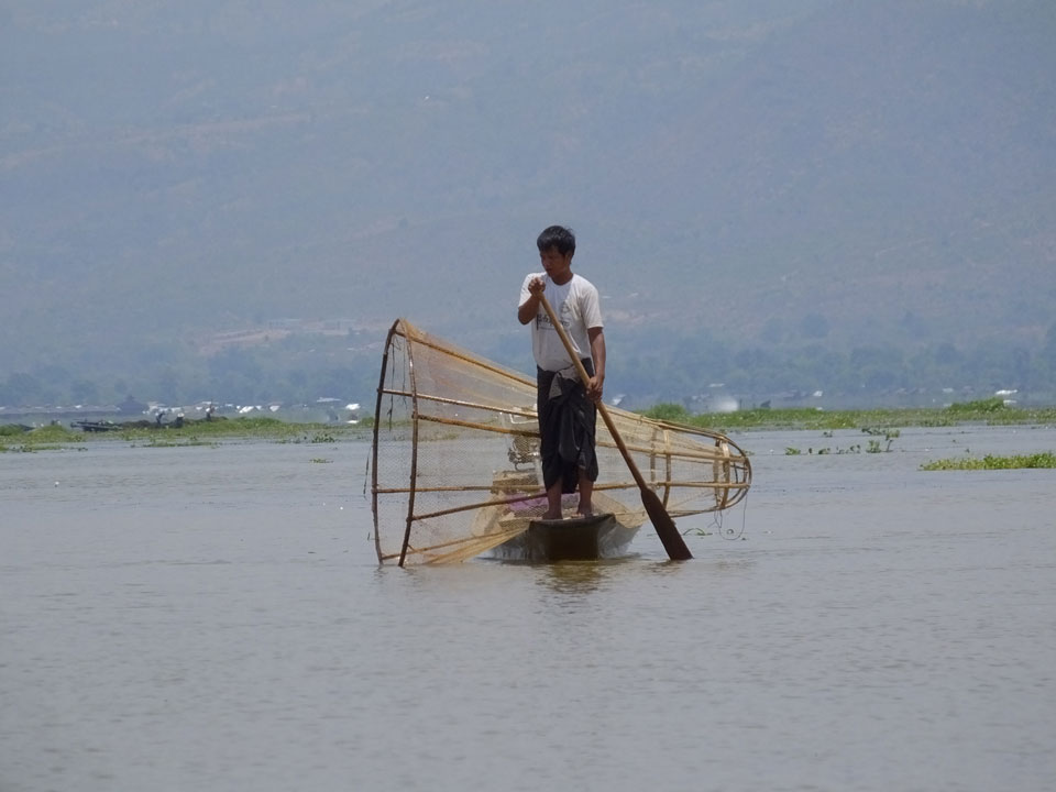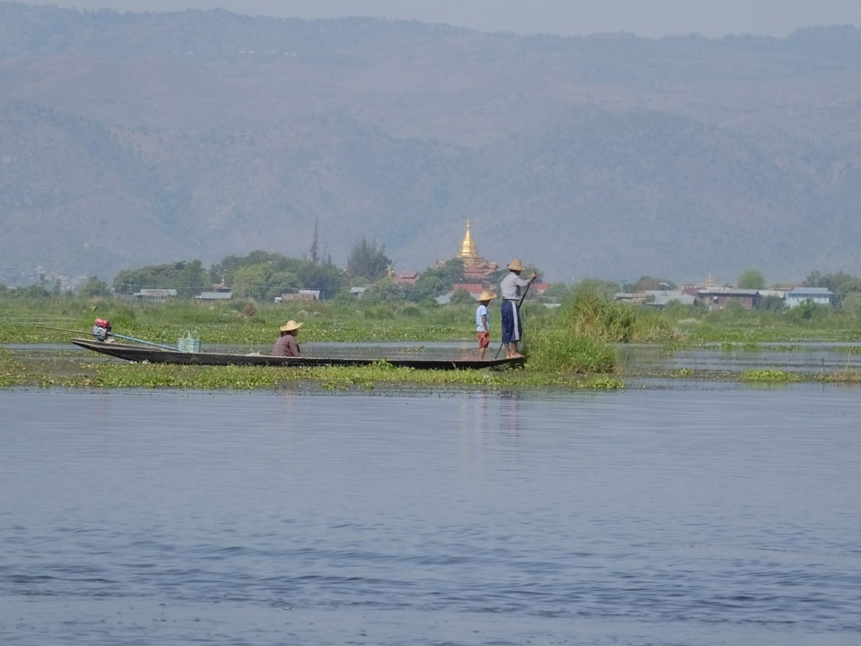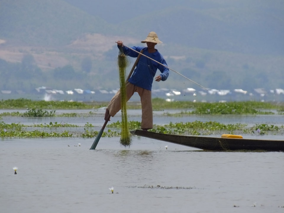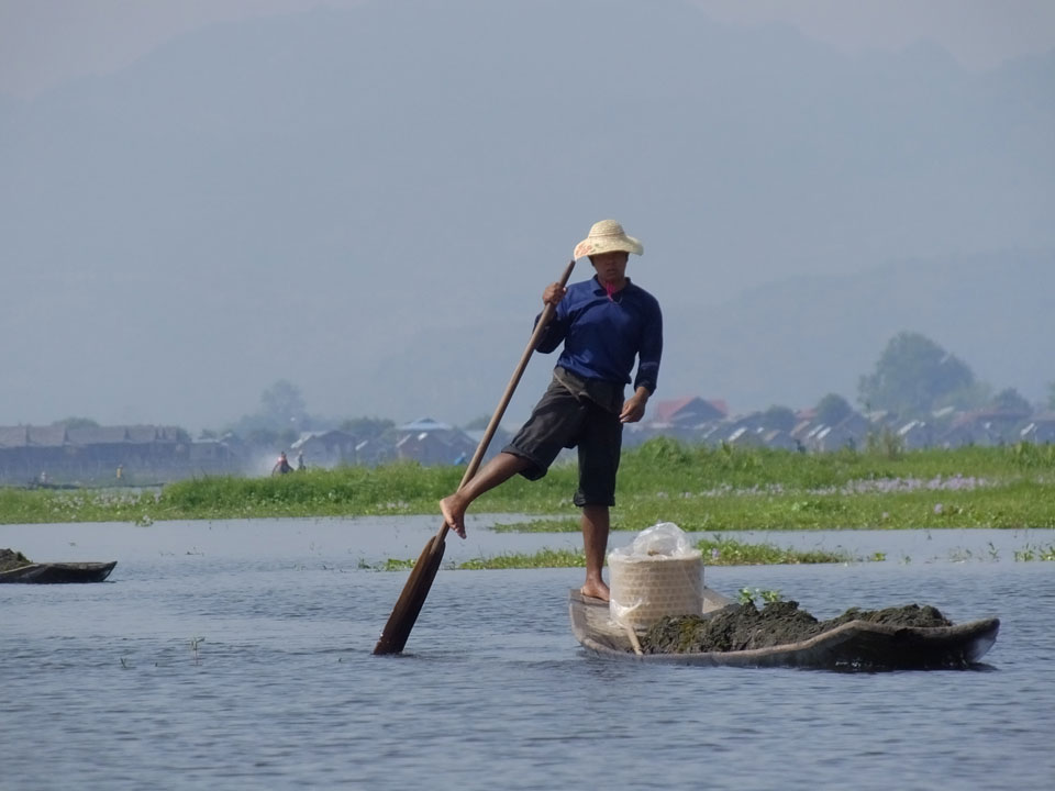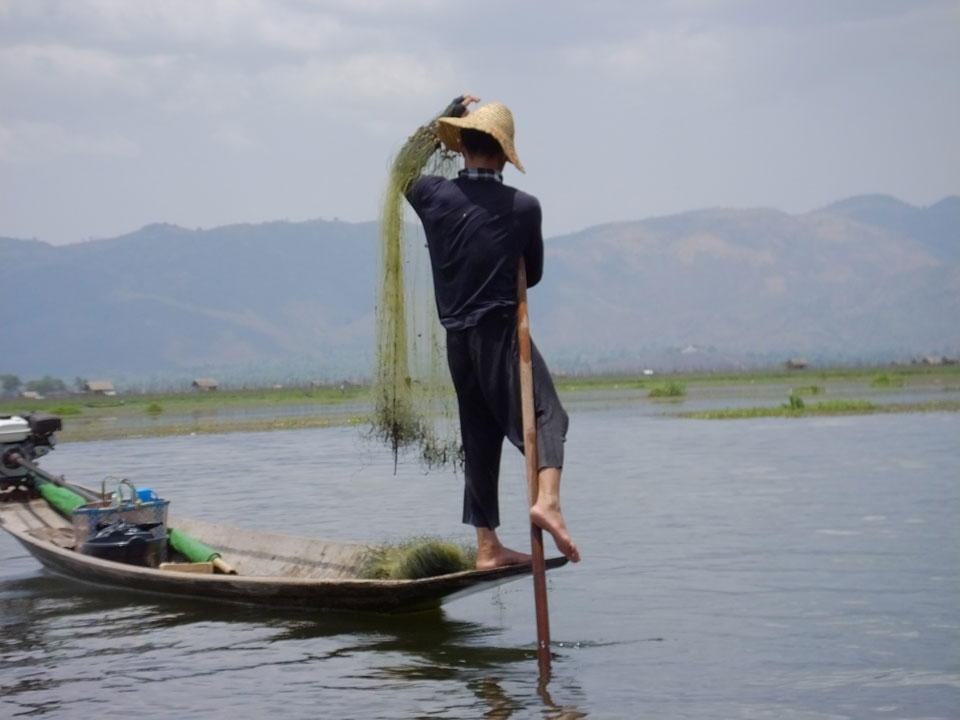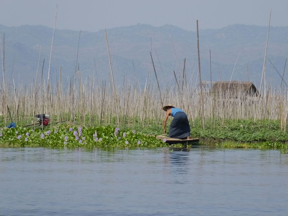 Es ging zum See, der ganz schön groß war. Endlich sah ich die Fischer mit ihren typischen Steuerbewegungen per Bein. Ein Bein im Boot, ein Bein um das Ruder. Viele Leute fischten auch Algen aus dem Wasser. Das schien nicht gerade tief. Später las ich – 1.50m durchschnittlich.