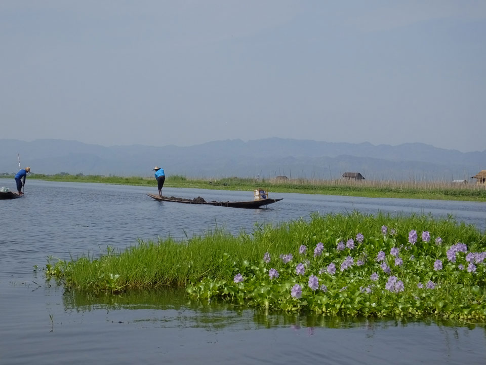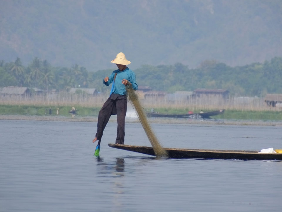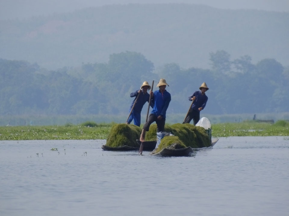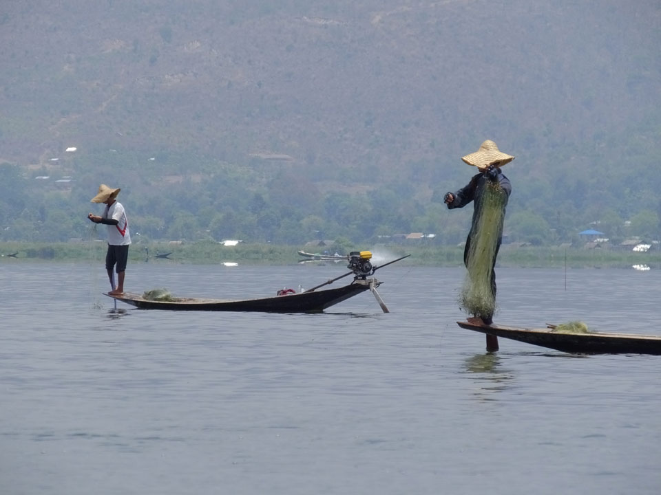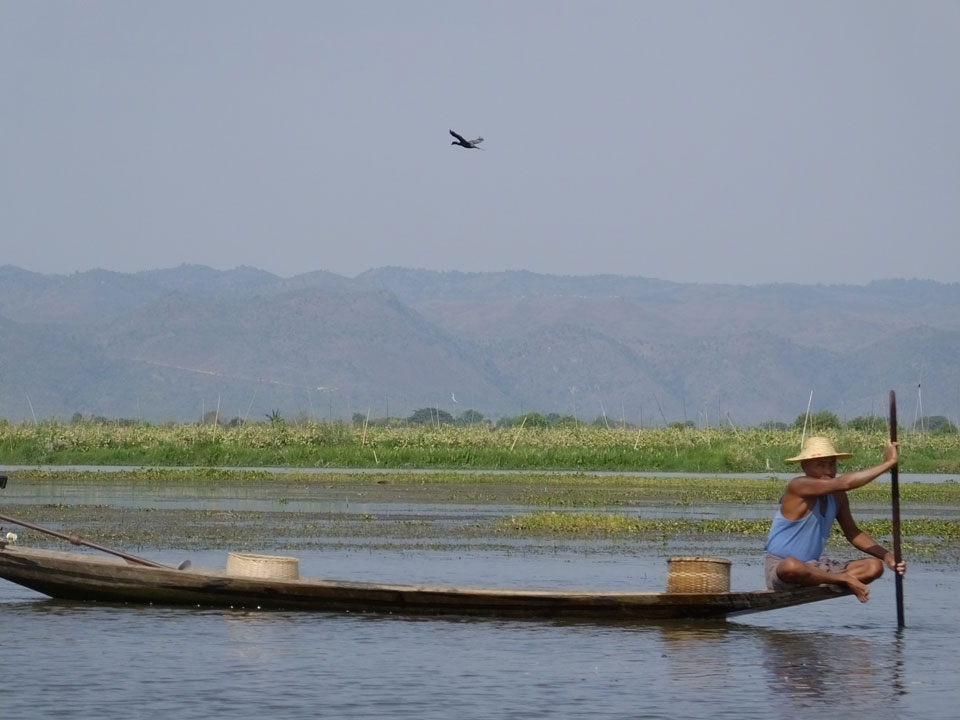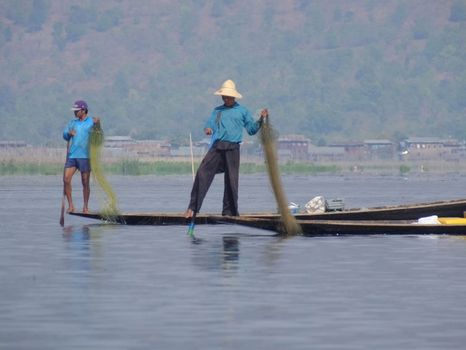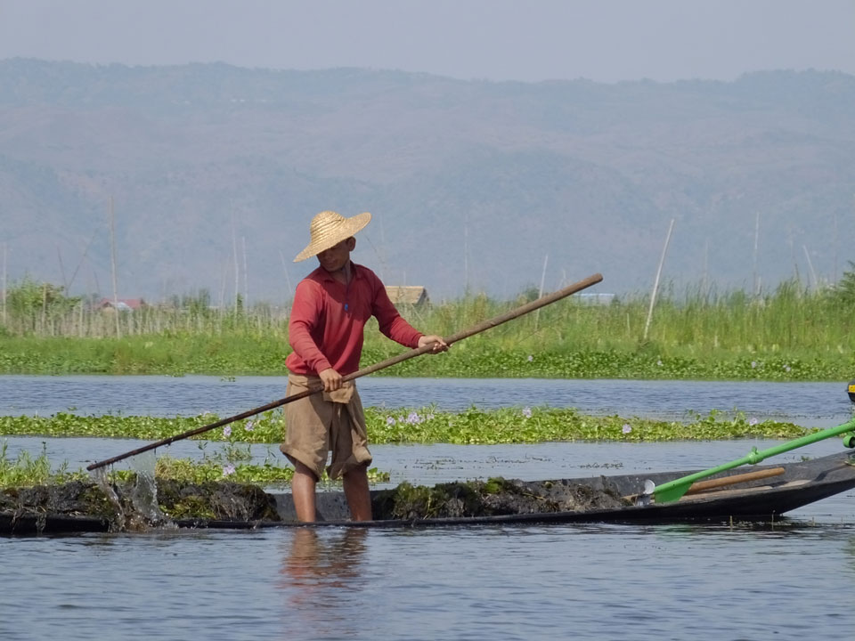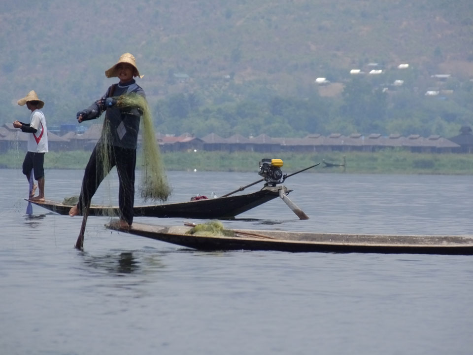 Es ging zum See, der ganz schön groß war. Endlich sah ich die Fischer mit ihren typischen Steuerbewegungen per Bein. Ein Bein im Boot, ein Bein um das Ruder. Viele Leute fischten auch Algen aus dem Wasser. Das schien nicht gerade tief. Später las ich – 1.50m durchschnittlich.