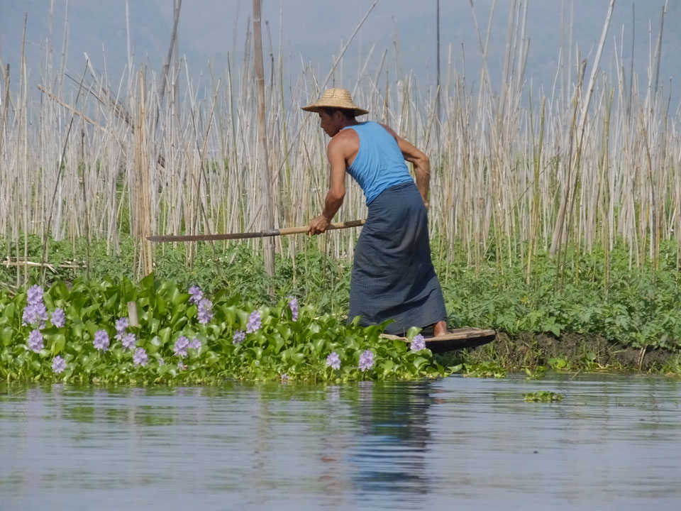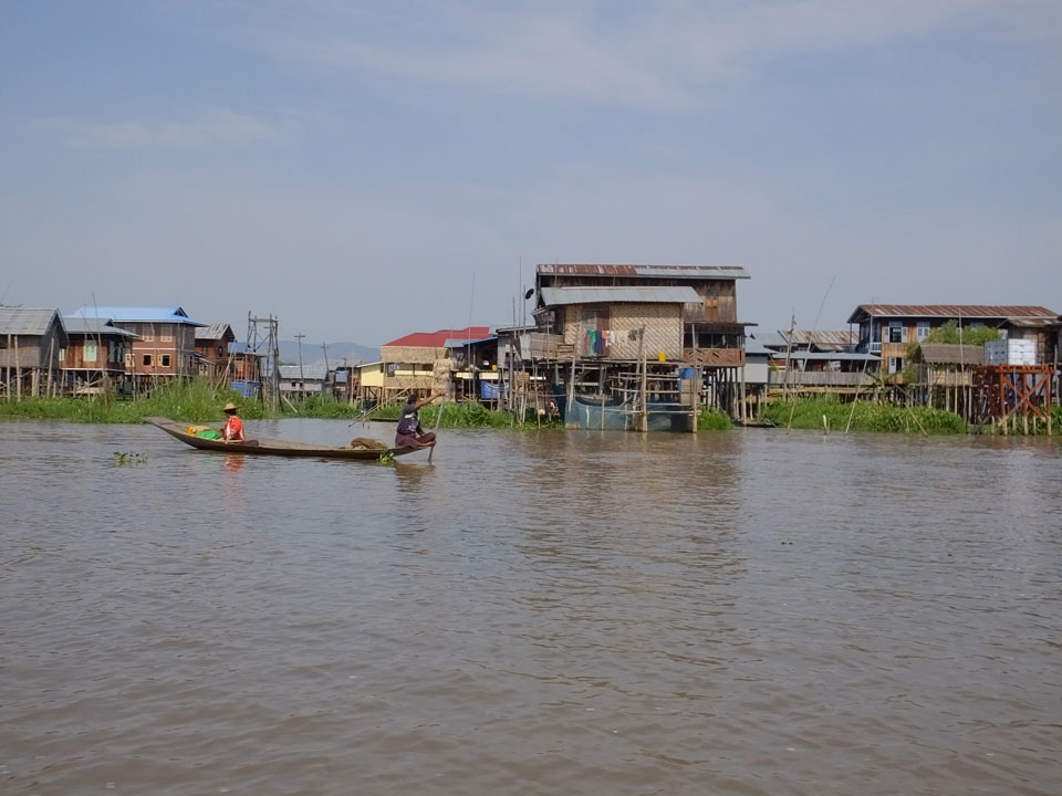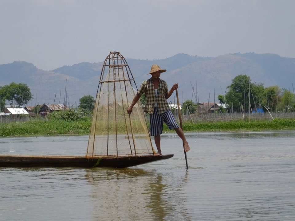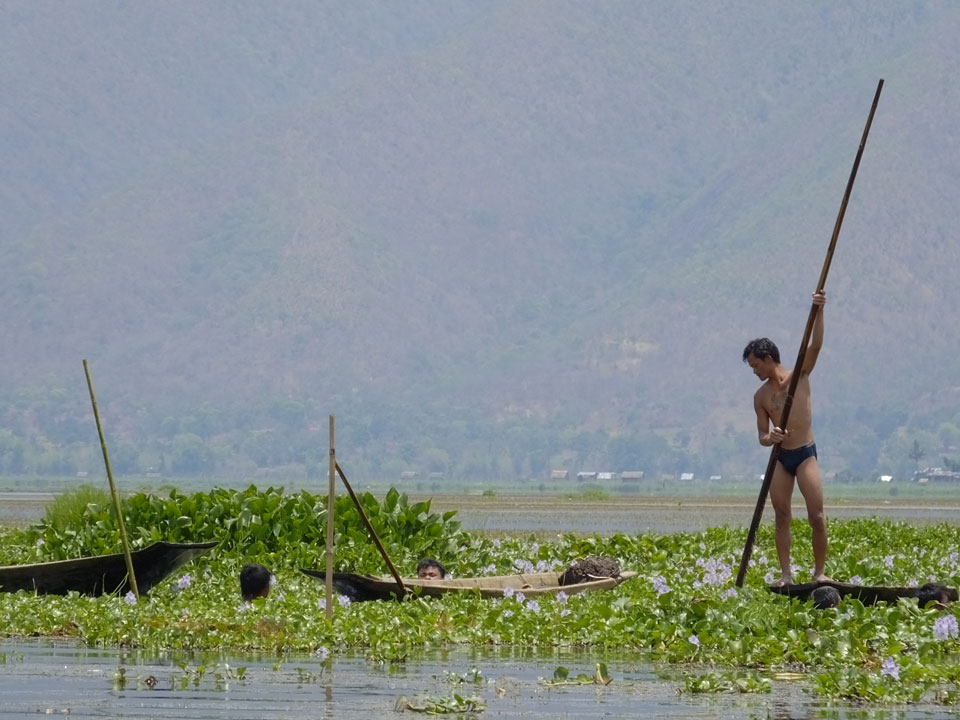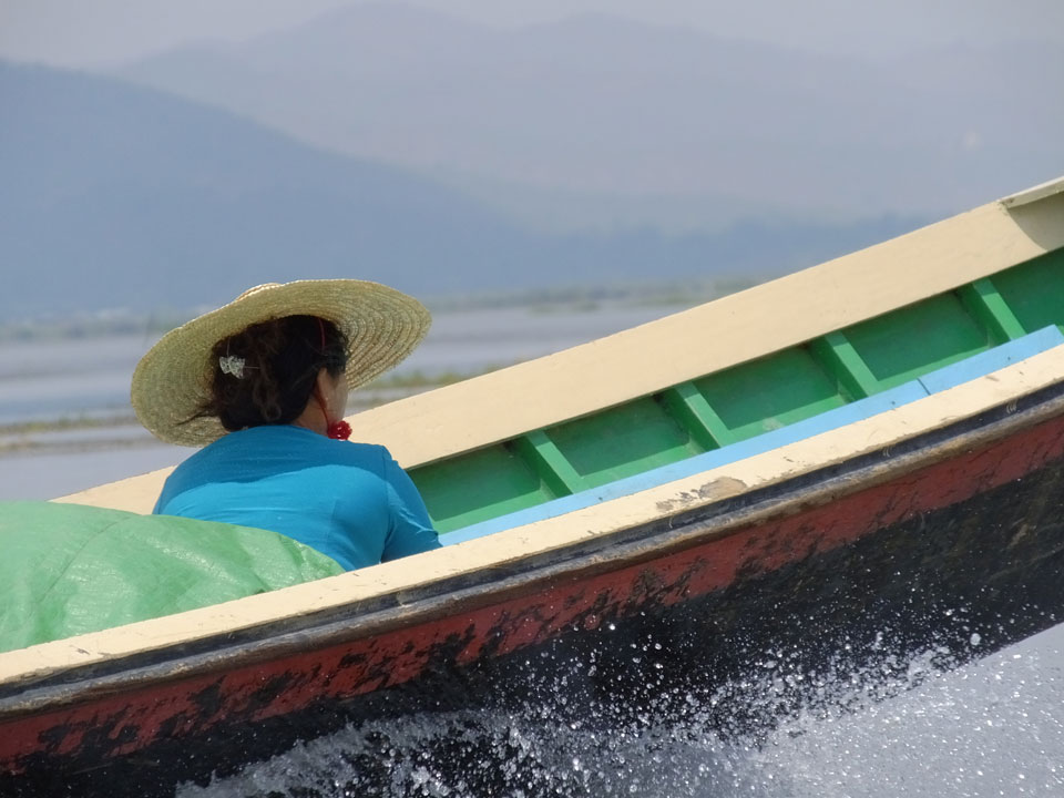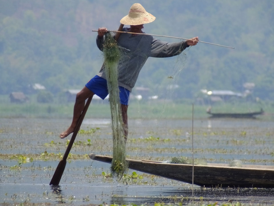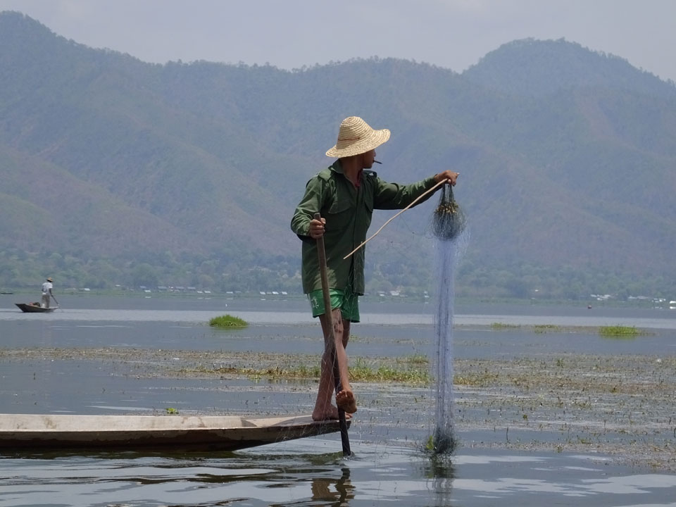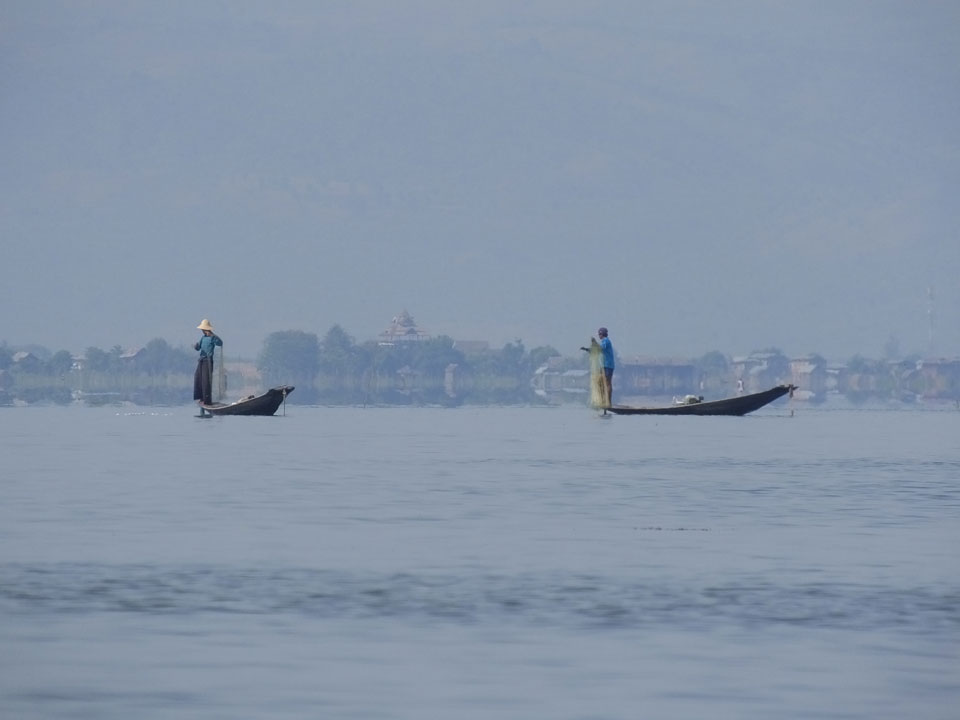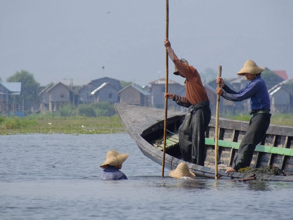 Es ging zum See, der ganz schön groß war. Endlich sah ich die Fischer mit ihren typischen Steuerbewegungen per Bein. Ein Bein im Boot, ein Bein um das Ruder. Viele Leute fischten auch Algen aus dem Wasser. Das schien nicht gerade tief. Später las ich – 1.50m durchschnittlich.