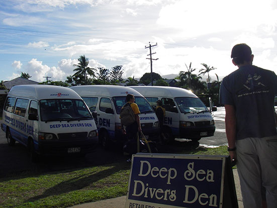 Um 7 war Abholzeit für den Transfer zum Boot. Ungemütlich. Ich hatte mein Gepäck bereit, Café und Kuchen zum Frühstück im Magen. Mein Riesenrucksack passte gerade so in den Minibus. Noch ein paar Leute eingeladen und schon waren wir am Tauchladen.