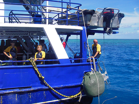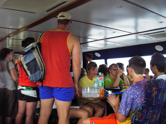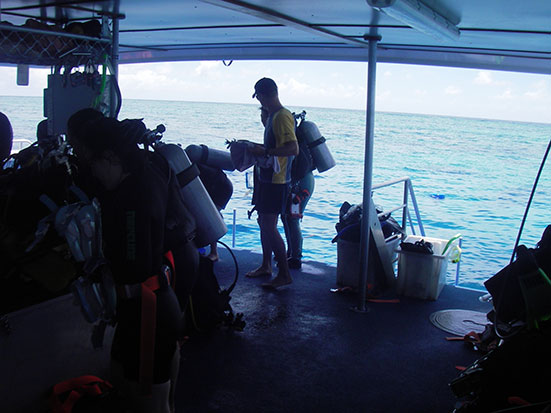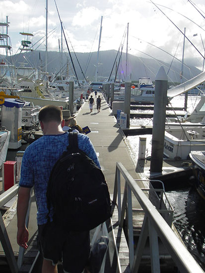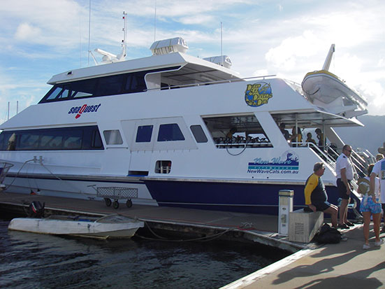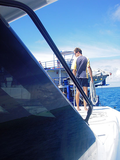 Gepäck verstaut und ab ging die Post. Mein Tauchbuddy spendierte mir eine Anti-Seekrankheit-Pille. Ich zog ein paar Gummibären aus dem Automaten. Zum Hafen gerollt und dann aufs Boot. Die Seaquest musste als Ersatz für die Reefquest (Motorschaden) herhalten. Das kleinere Boot megavoll, kaum irgendwo ein freier Platz. Viele Tagesausflügler wollten Schnorcheln oder ein paar Intro-Dives machen.