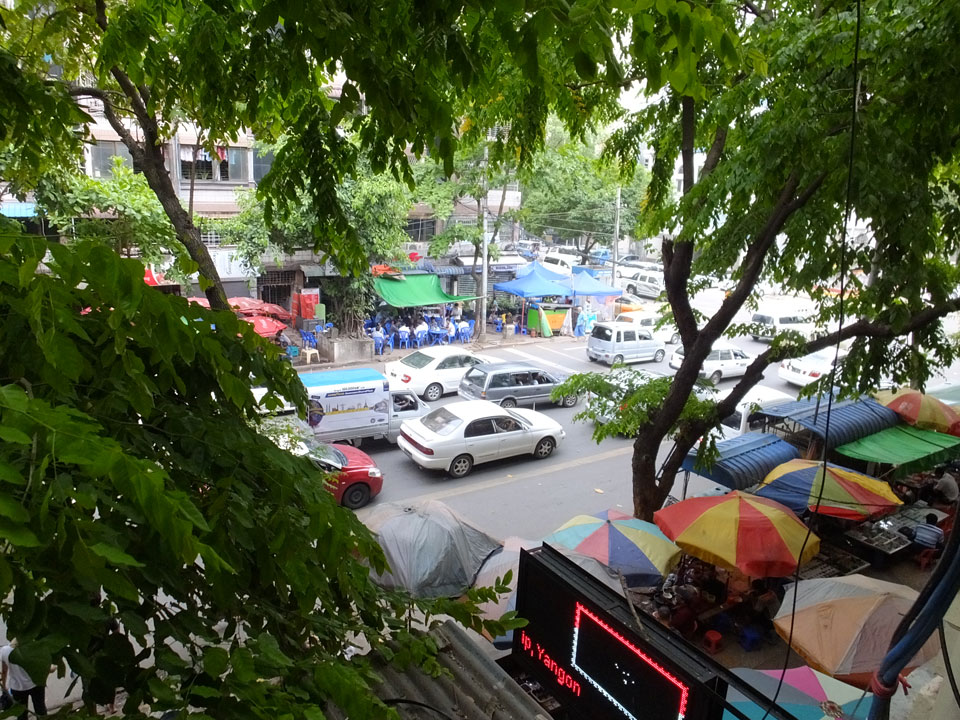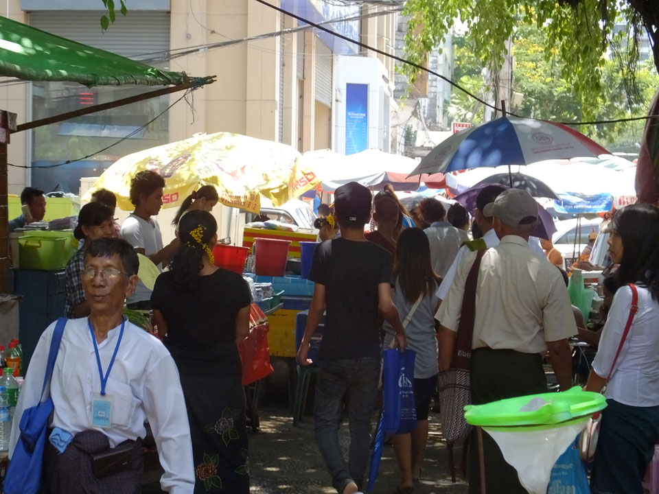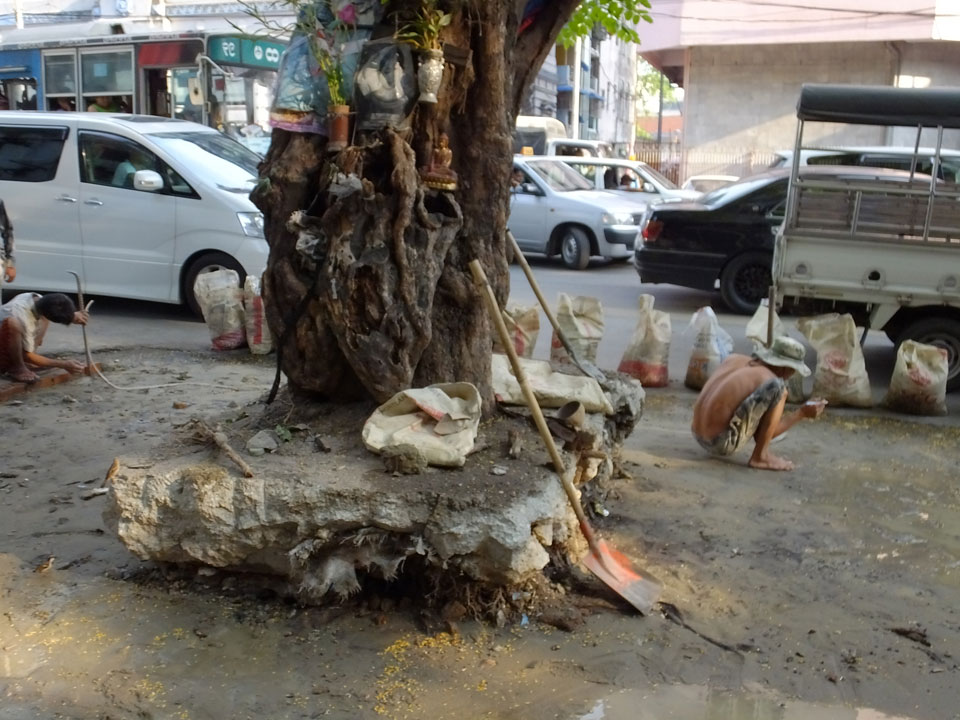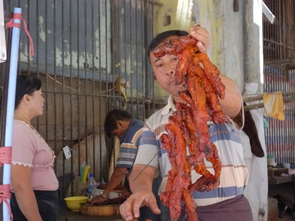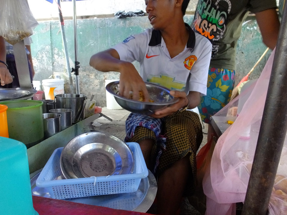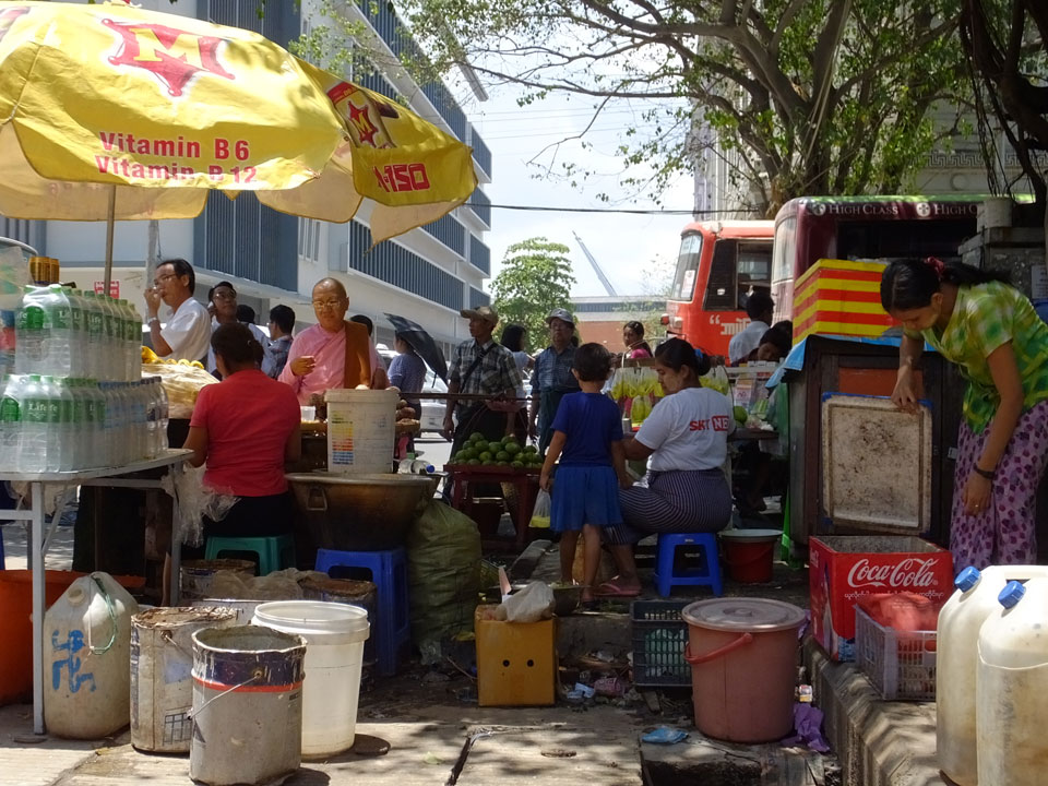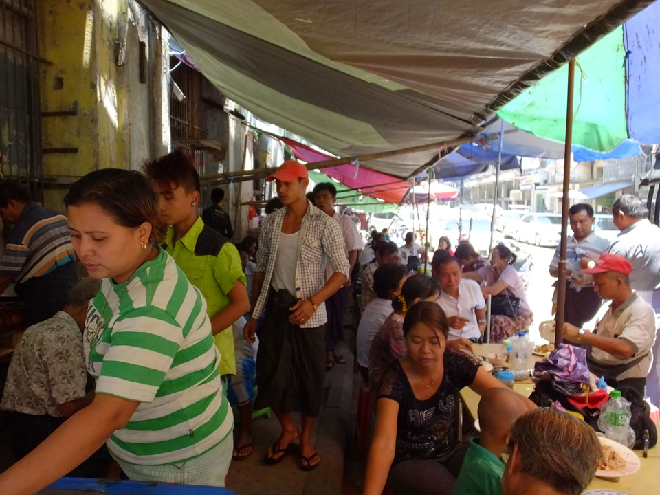 Im Trubel fand ich in einer Nebenstraße ein restarant, was gerade Hühnchen und Schwein zerschnitt. Das große Essen wurde vorbereitet und die Leute nahmen langsam Platz. Ich hatte dann das Schwein, was vorzüglich schmeckte. Nur 700 Kyat. Etwas ging ich noch umher und dann kam nach dem Magen der Kopf dran. Nach einigen Wochen ohne Friseubesuch nahm ich den „Ba Ba“ gleich neben dem Hosteleingang.