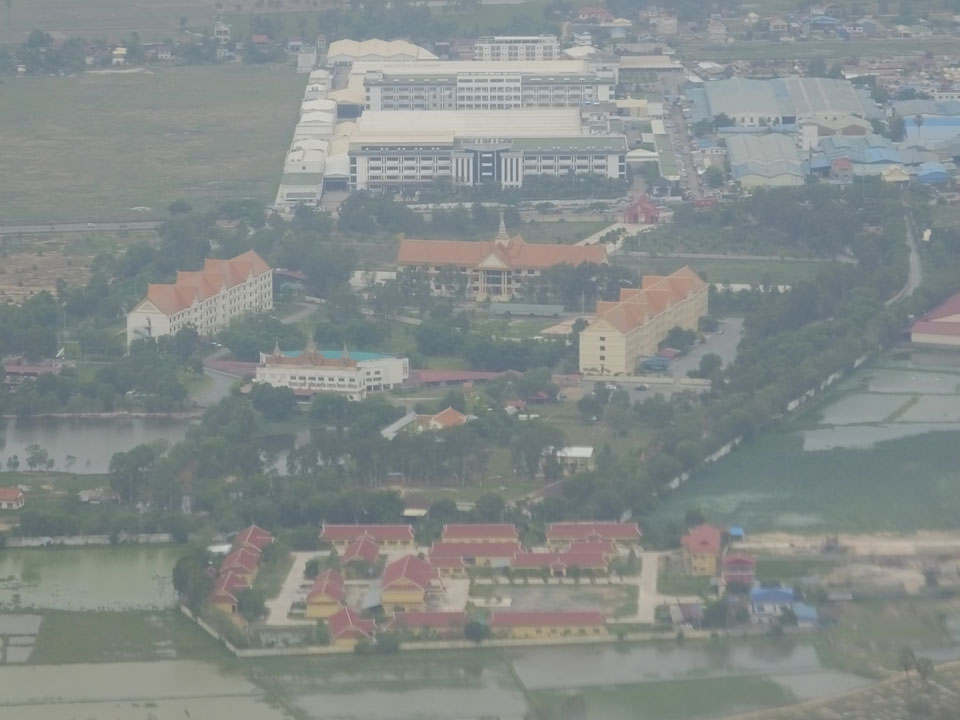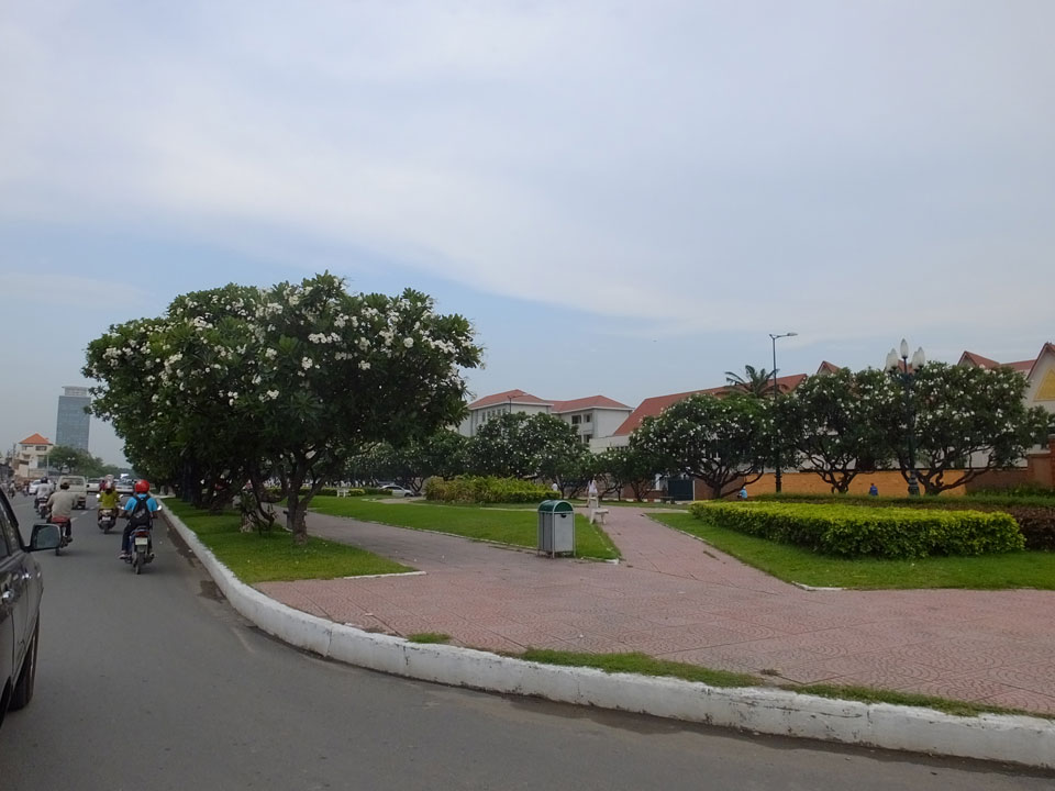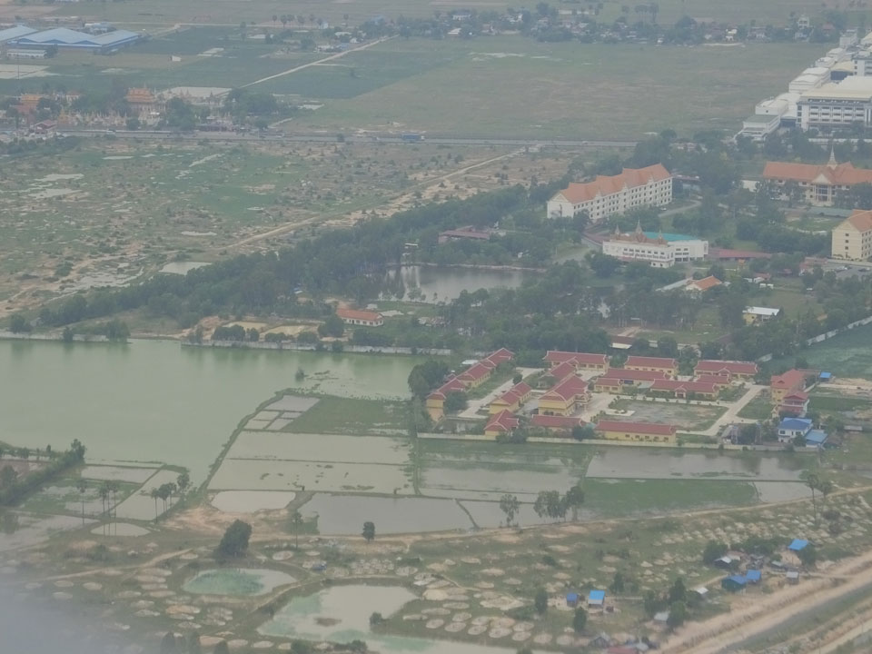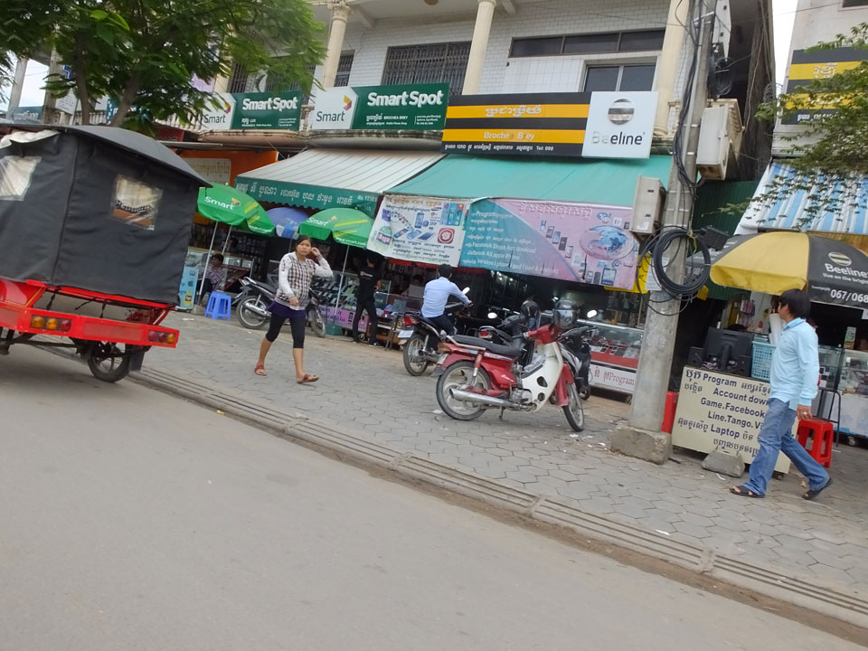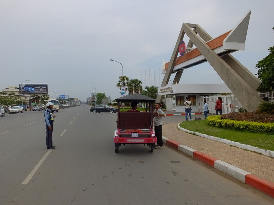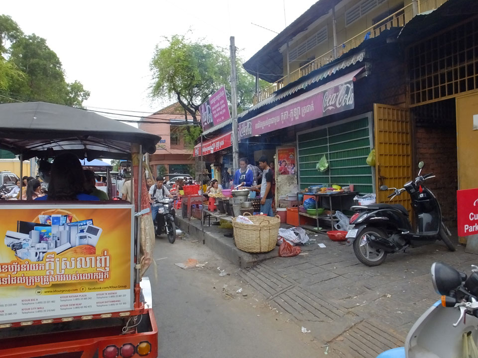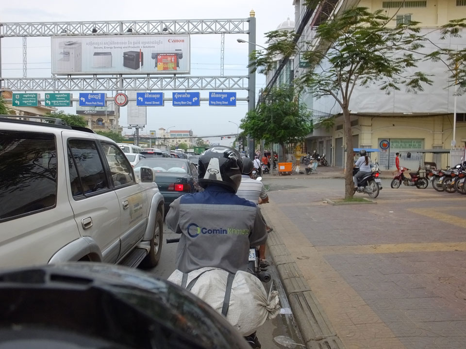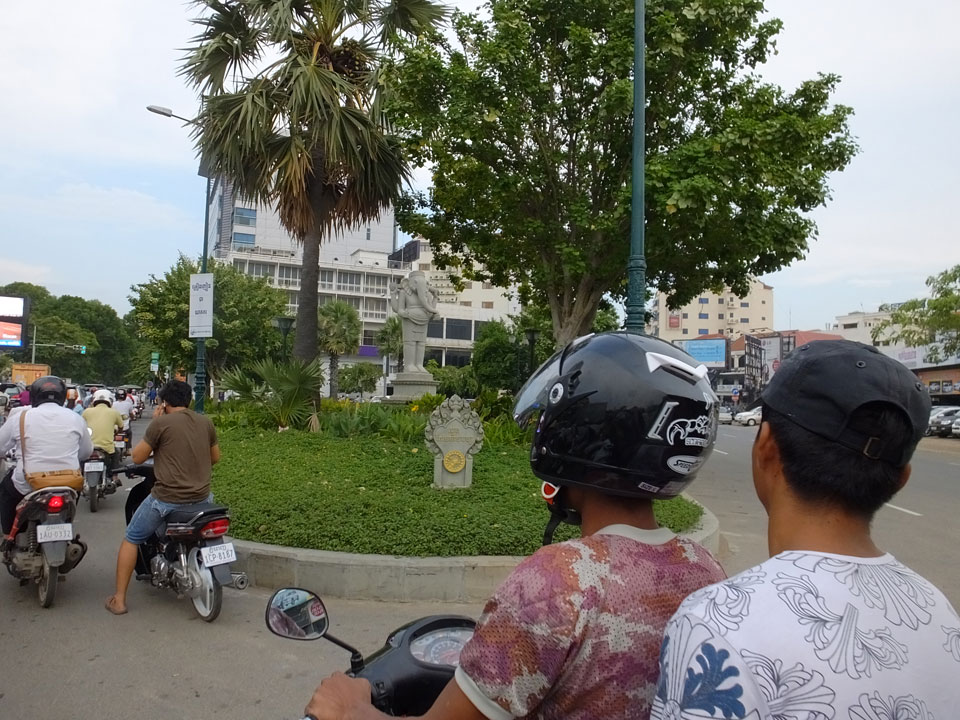 Am Flughafen PP’s warteten viele Taxifahrer. Der Standardpreis beträgt $2 aber ich wollte draußen ein TukTuk nehmen. Ein kleiner älterer Fahrer kam auf mich am Ausgang zu und sagte $5 für TukTuk. OK, genommen aber dann brachte er sein Moped!