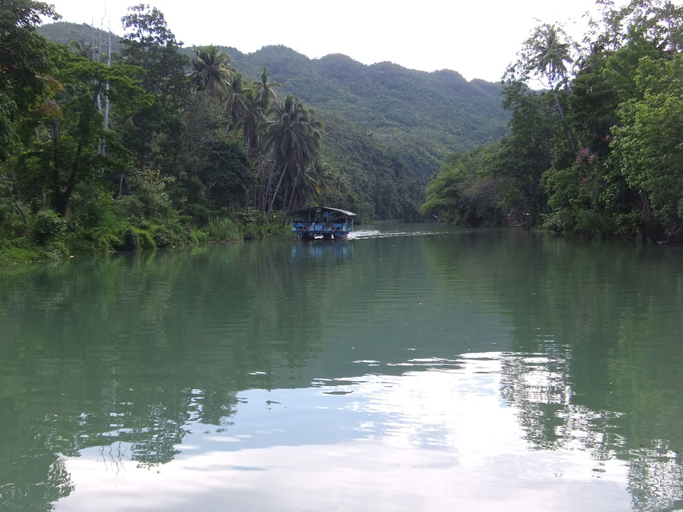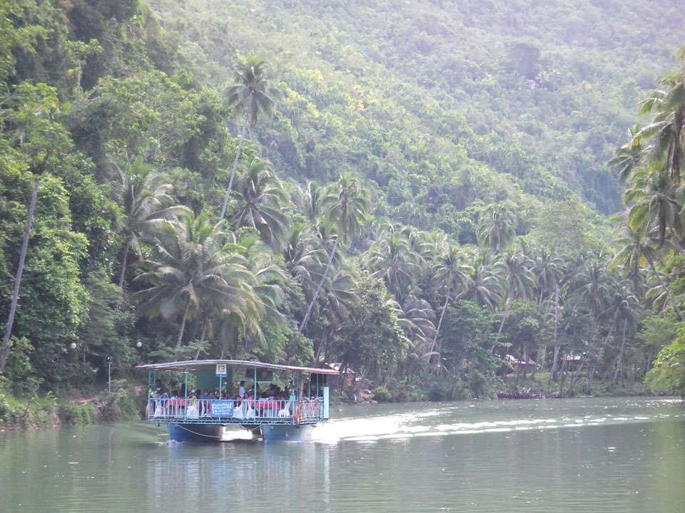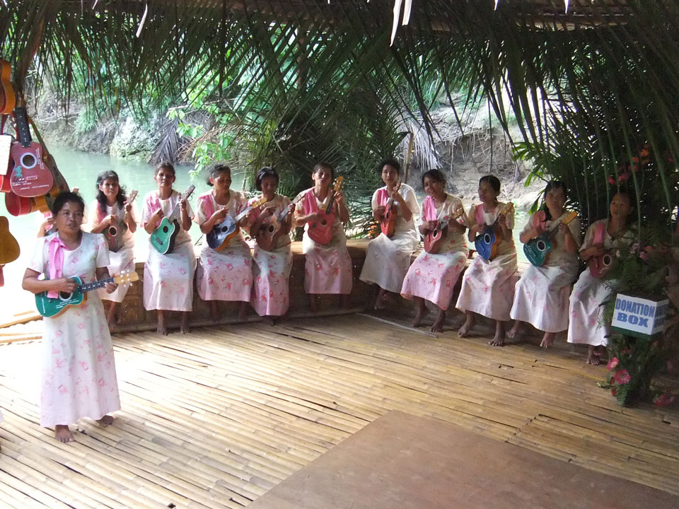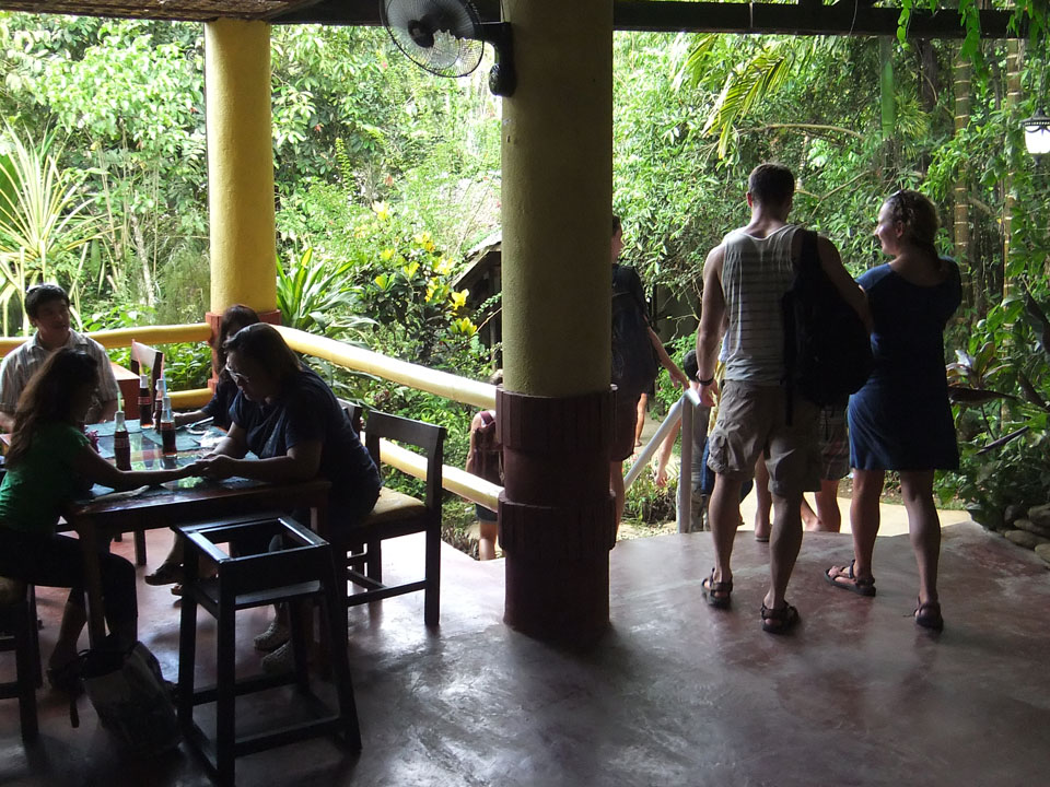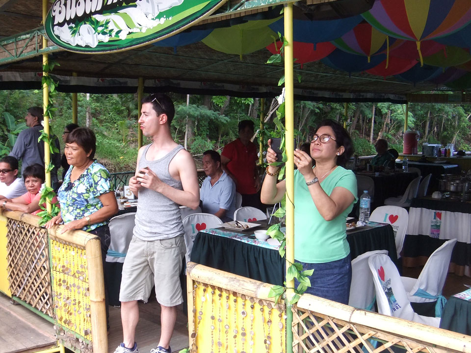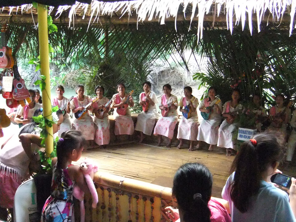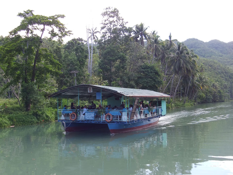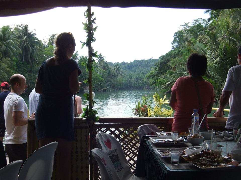 Zum Mittag dann am Loboc Fluss kam die teuerste Aktion – 450 PHP – also fast €10. Dafür eine Bootsrundfahrt und Mittagessen. Das Buffet war leicht kalt aber ich will mal nicht meckern, ich wurde ohne Hunger satt. Die Fahrt war auch ganz nett in der schönen Landschaft. Einer spielte Keyboard und ein anderer sang die beliebten schnulzigen Lieder – Phil Collins usw..