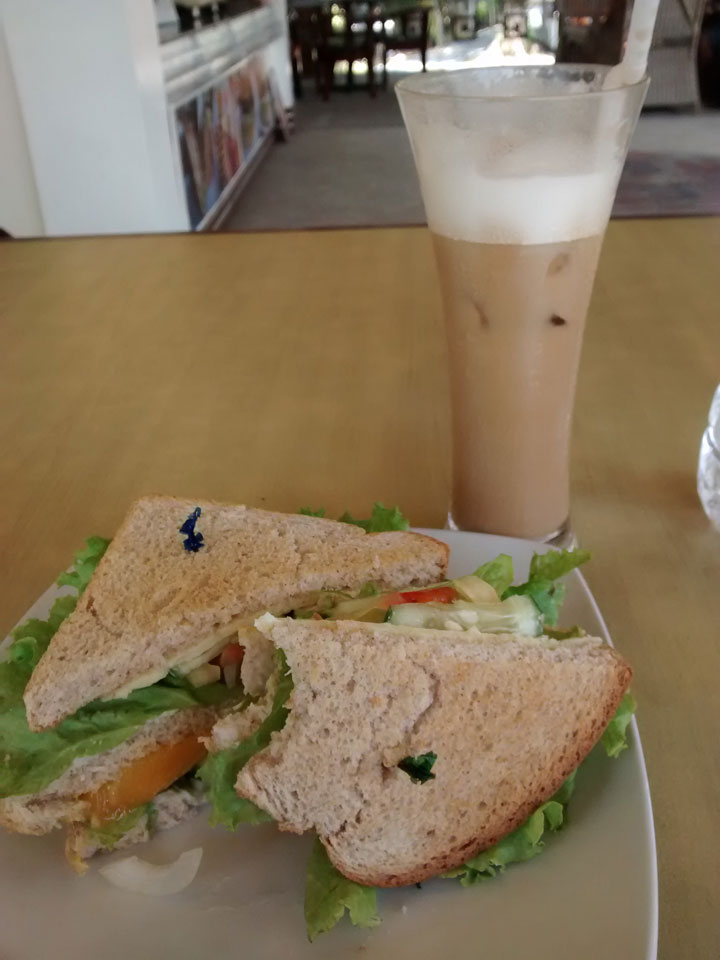 Ich kaufte mir einen Eiskaffee und ein Princessa Sandwich. Das sollte eigentlich mit Krabbenfleisch und Mangos kommen. Die Mangos waren drin aber kein Krabbenfleisch. Ich fragte nach, es sollte in der Soße sein. Nur war da auch keine Soße. Naja, egal. Ich fühlte mich nicht in Stimmung über Sandwiches zu diskutieren oder die €3,50 wieder zu bekommen. Es gibt wichtigeres.