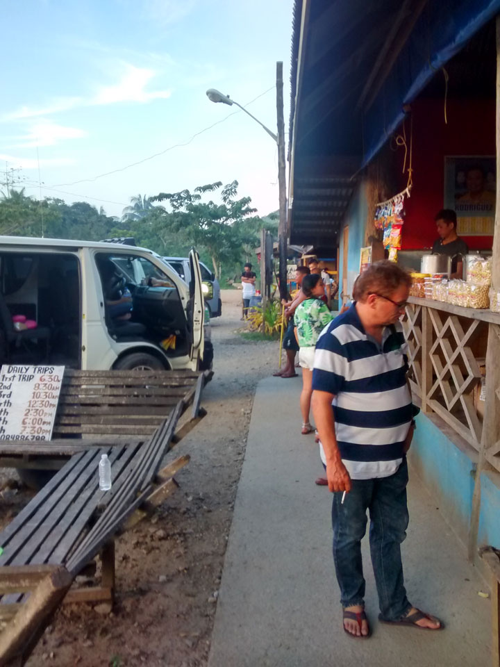 An einem Punkt kurz vor der Hälfte war Mango Kontrolle. Hier auf Palawan gibt’s einen Pilz, der die Mangos befällt. Derzeit nur im Süden, versucht man sie über Quarantäne vom Norden fern zu halten. Dann war auch schon der halbe Weg geschafft – nochmal 2 1/2 Stunden ab dem „Half Way Point“. Ich hatte ein Eis und kaum Appetit, wie eben seit Tagen schon. Ein paar Engländer hatten bessere Laune. Die Locals im Van waren genauso still wie ich.